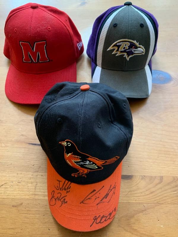 UNIVERSITY OF MARYLAND, BALTIMORE RAVENS AND AUTOGRAPHED ORIOLES YOUTH CAP. FROM NON SMOKING HOME.