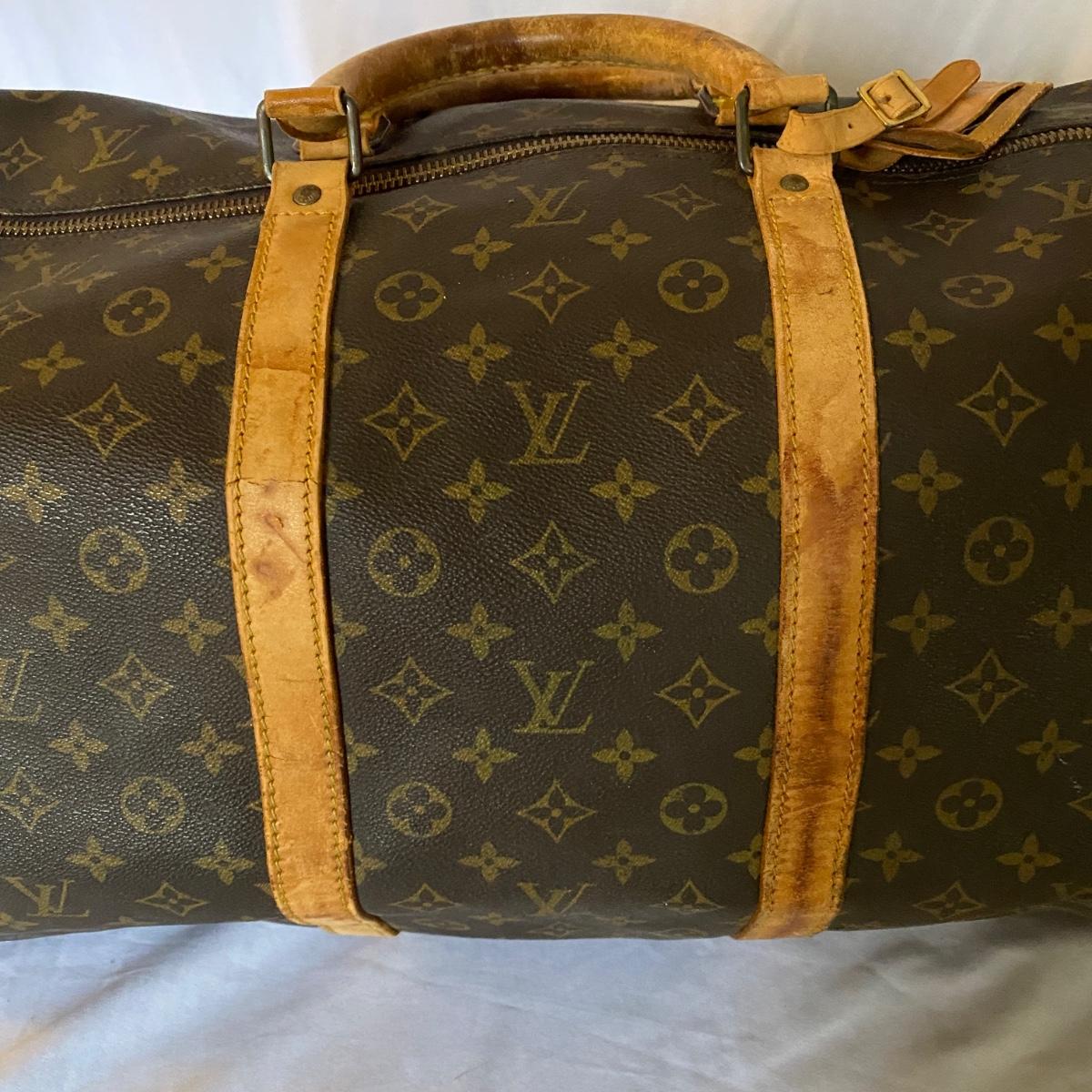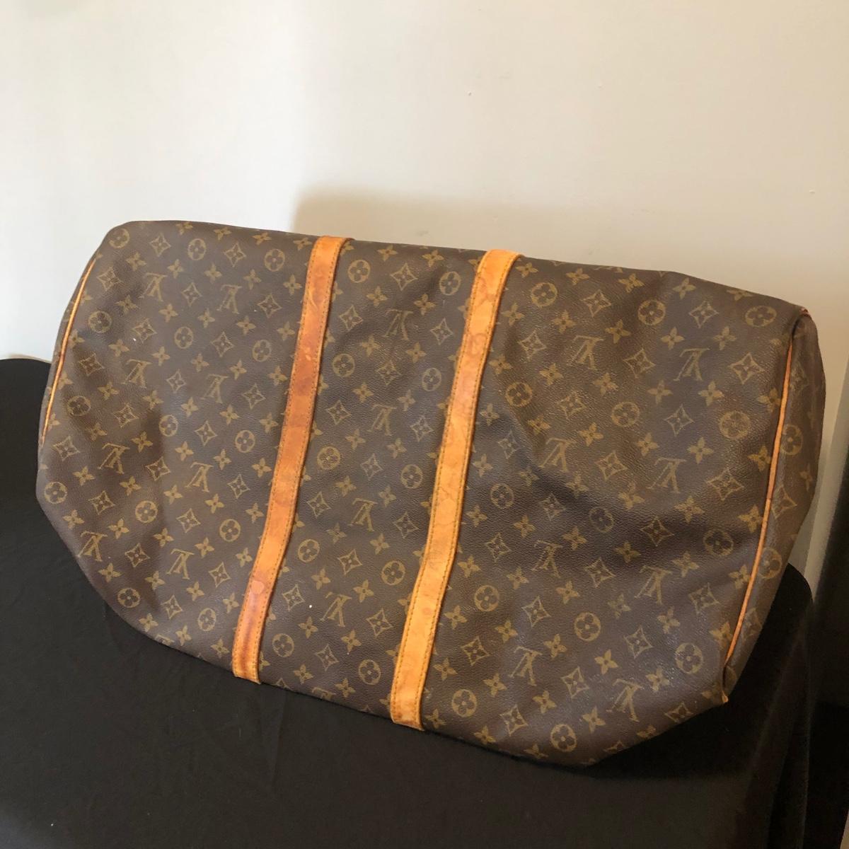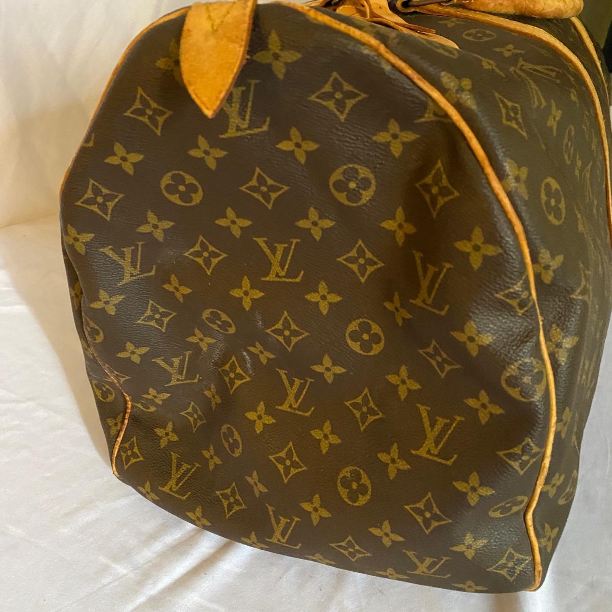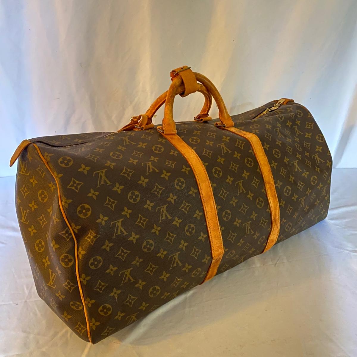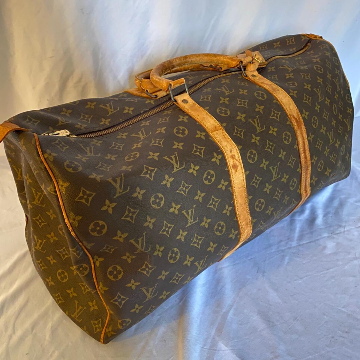 Louis Vuitton duffle bag. Has the tell tale upside down logo showing it’s one continuous piece of fabric. This duffle has clearly been used with some wear on the leather handles, straps, and ribbing. The main canvas has the LV monogram and is in great condition. Have not authenticated the brand. Bag measures approx 26” long and 12” tall. Shipping available
