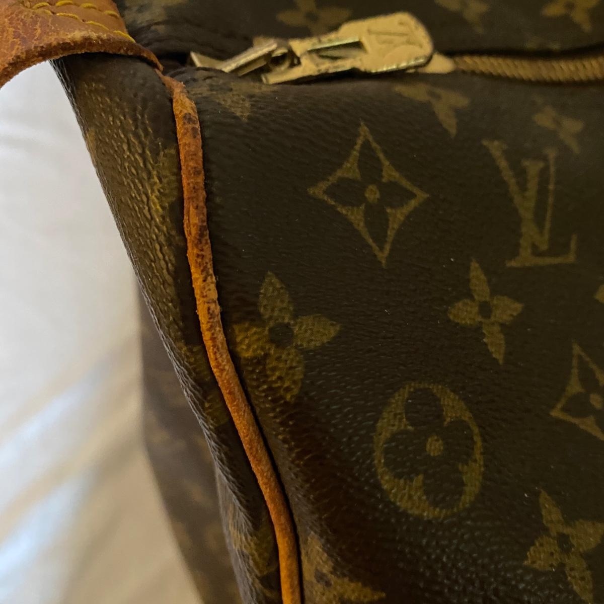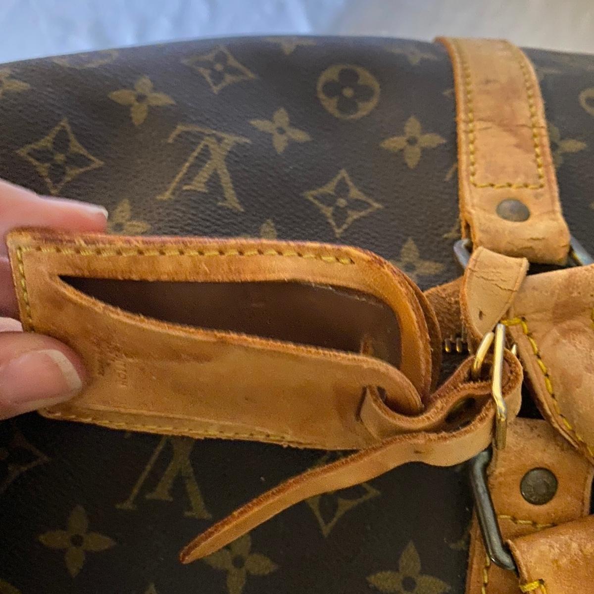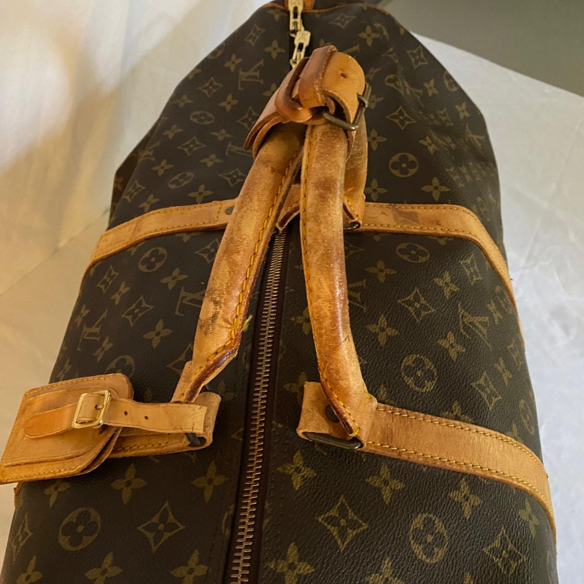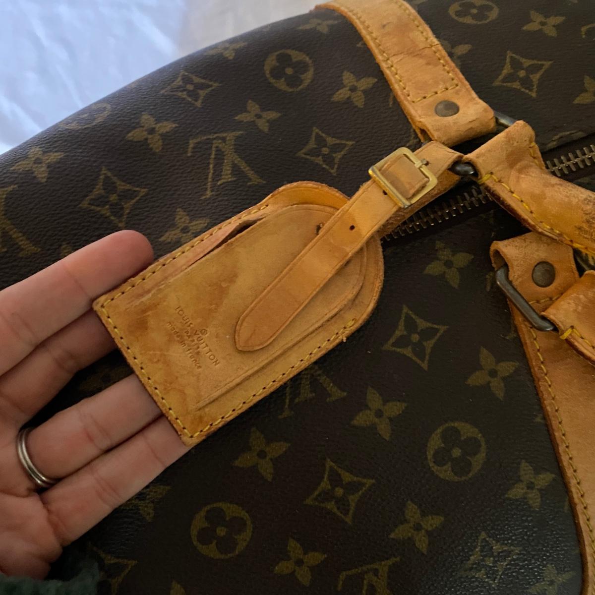 Louis Vuitton duffle bag. Has the tell tale upside down logo showing it’s one continuous piece of fabric. This duffle has clearly been used with some wear on the leather handles, straps, and ribbing. The main canvas has the LV monogram and is in great condition. Have not authenticated the brand. Bag measures approx 26” long and 12” tall. Shipping available