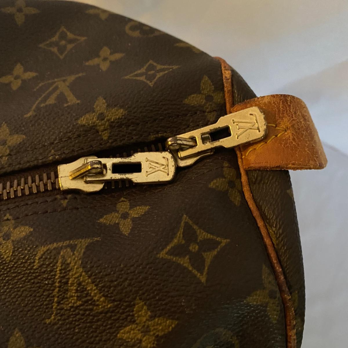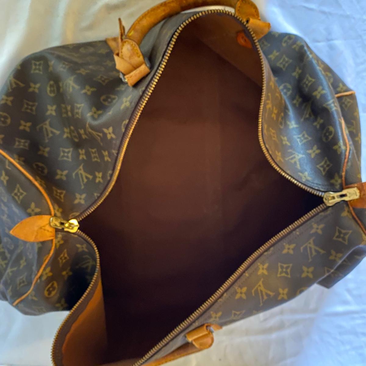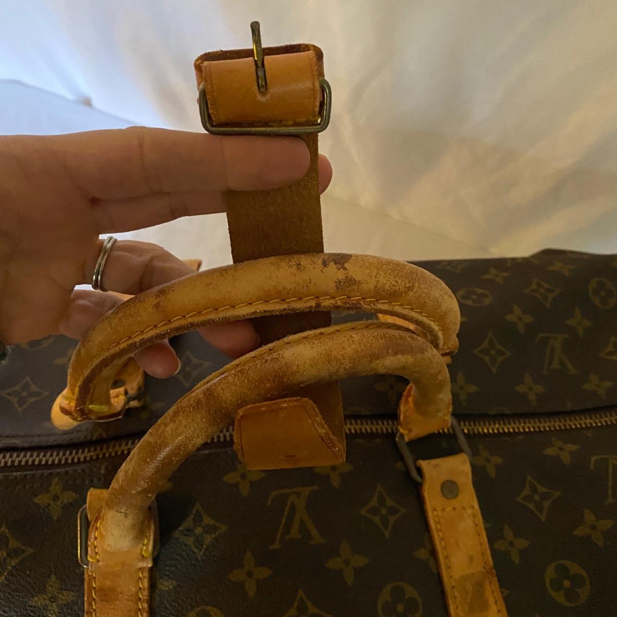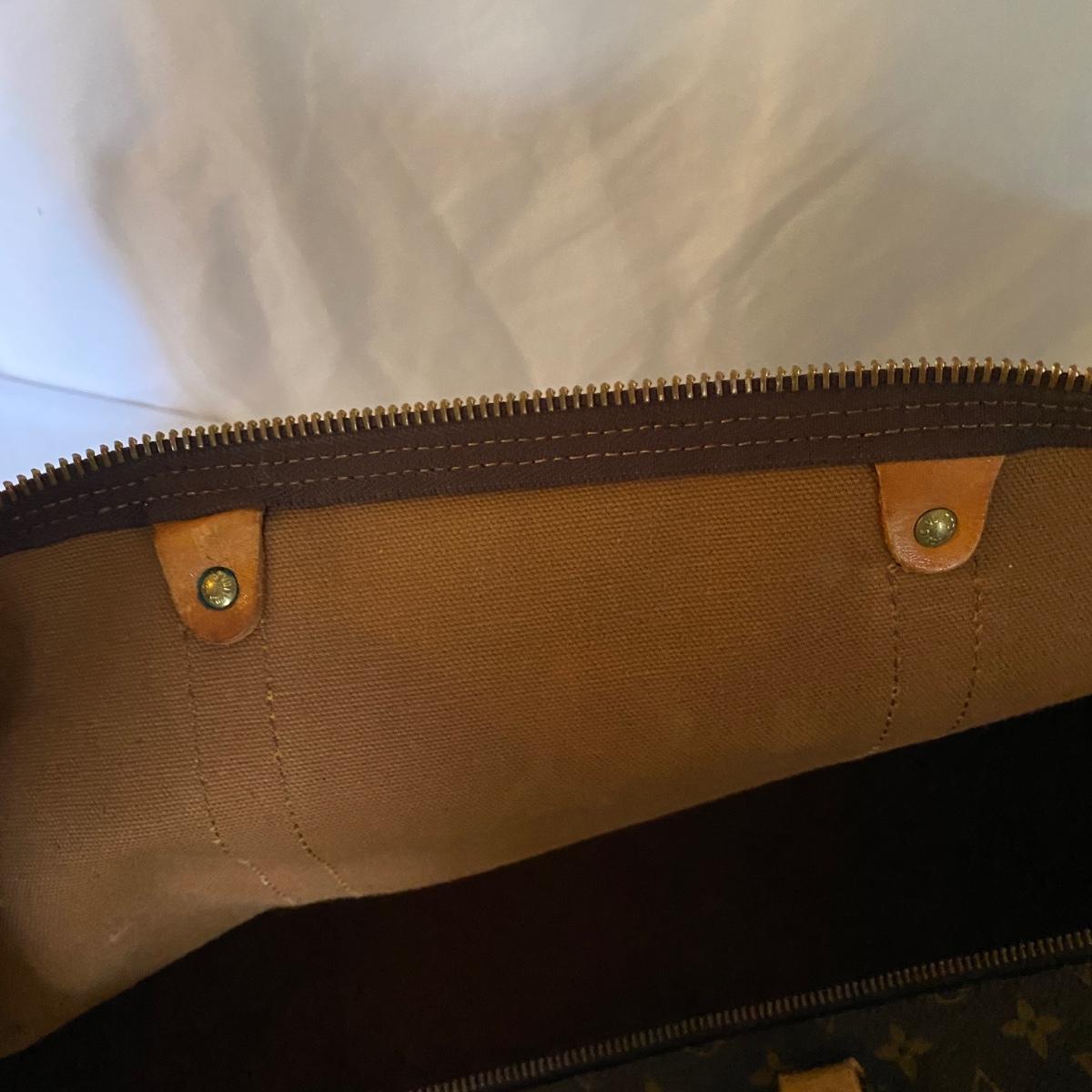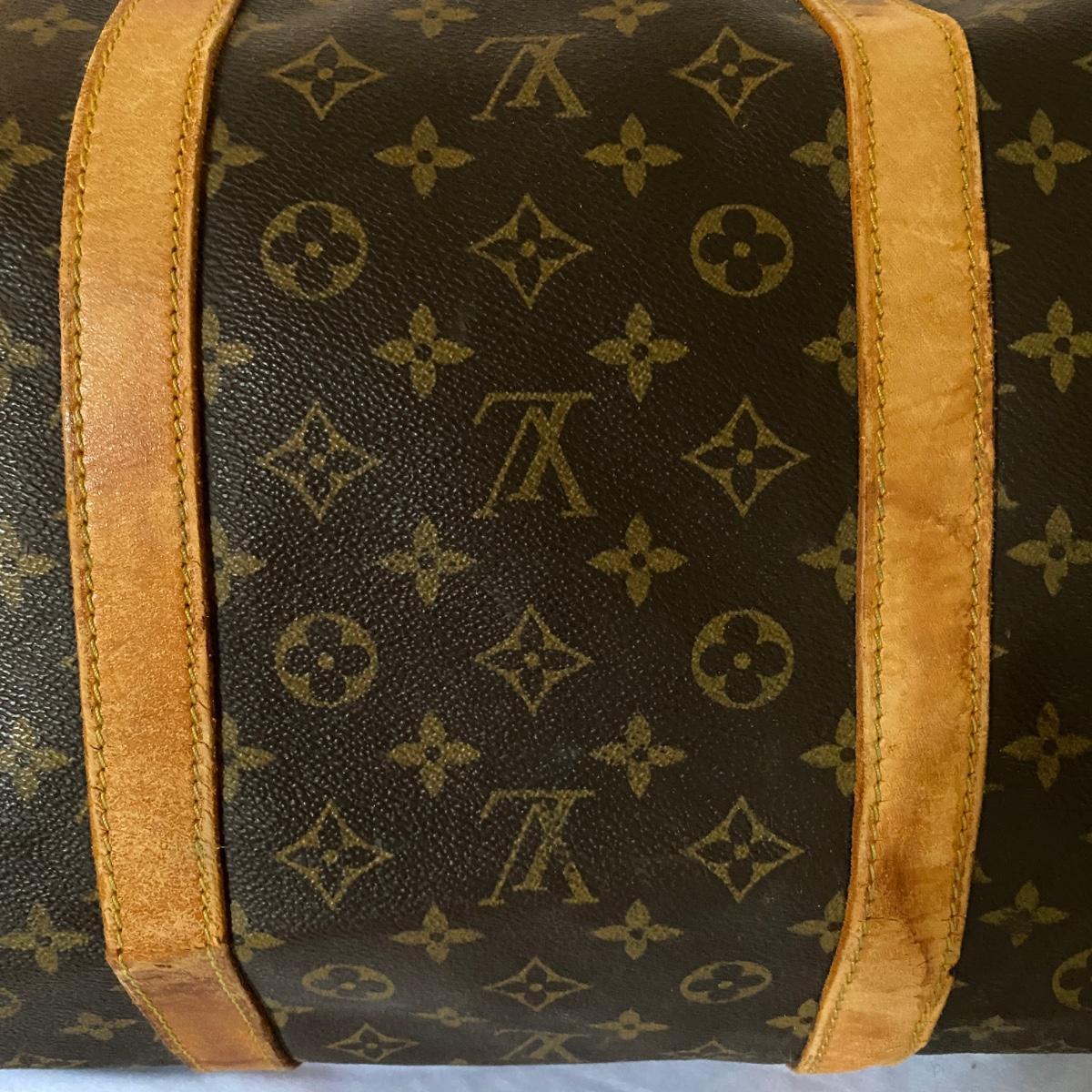 Louis Vuitton duffle bag. Has the tell tale upside down logo showing it’s one continuous piece of fabric. This duffle has clearly been used with some wear on the leather handles, straps, and ribbing. The main canvas has the LV monogram and is in great condition. Have not authenticated the brand. Bag measures approx 26” long and 12” tall. Shipping available