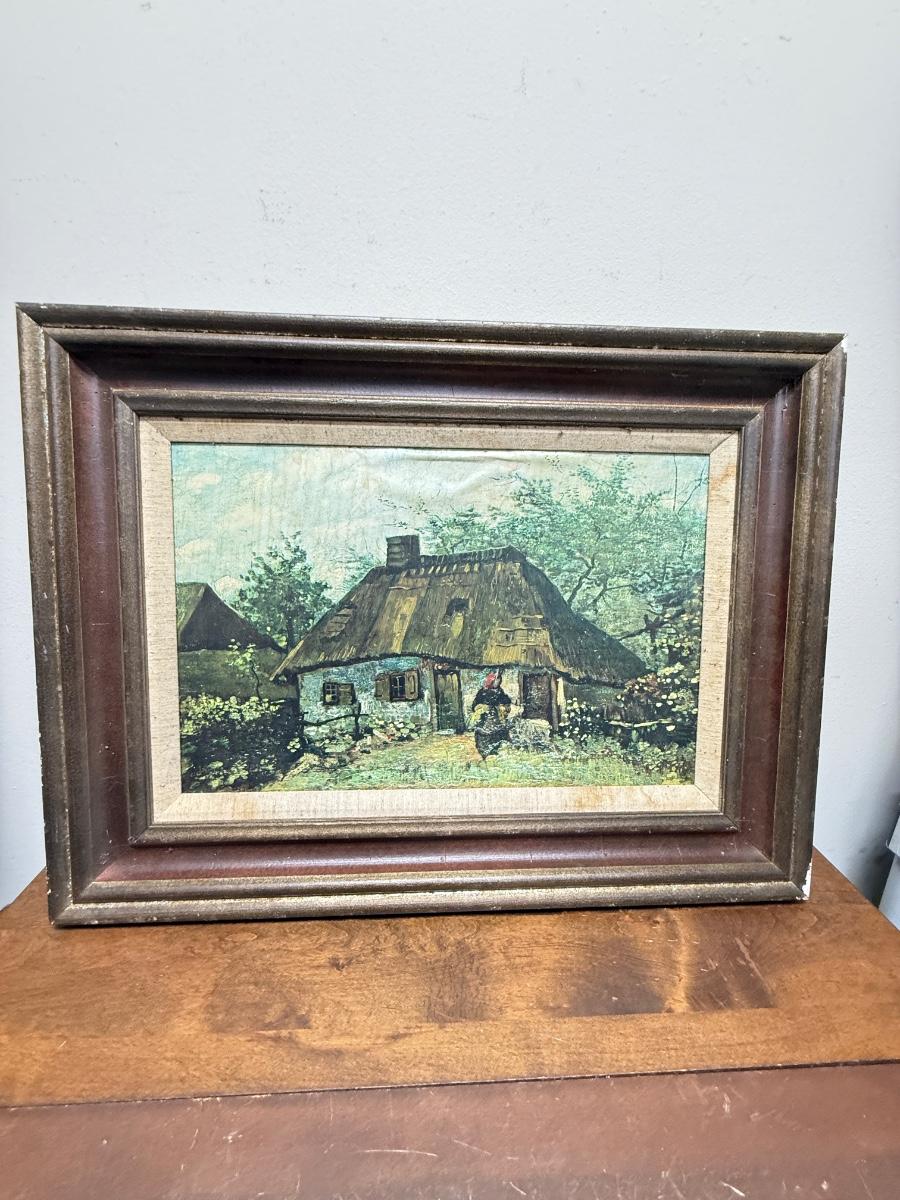 Framed reproduction print of Vincent van Gogh's painting Farmhouse in Nuenen, also known as Cottage and Woman with Goat. Print is in fair to good condition, some water damage that may be able to be cleaned. Minor damage to the frame (see photos). Measures approx. 29" x 22".