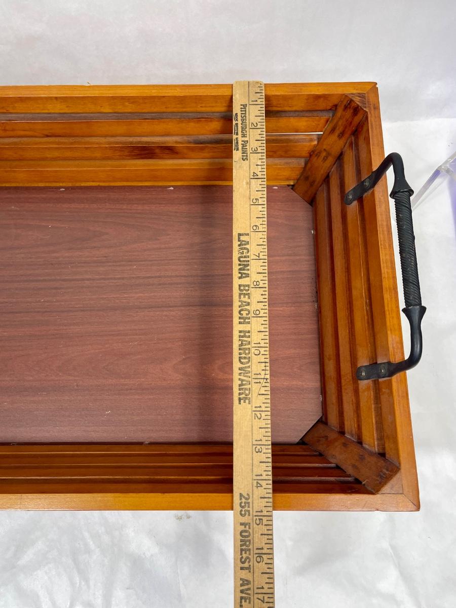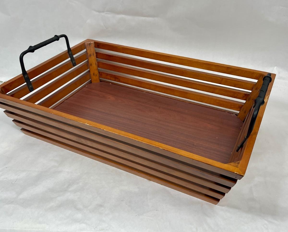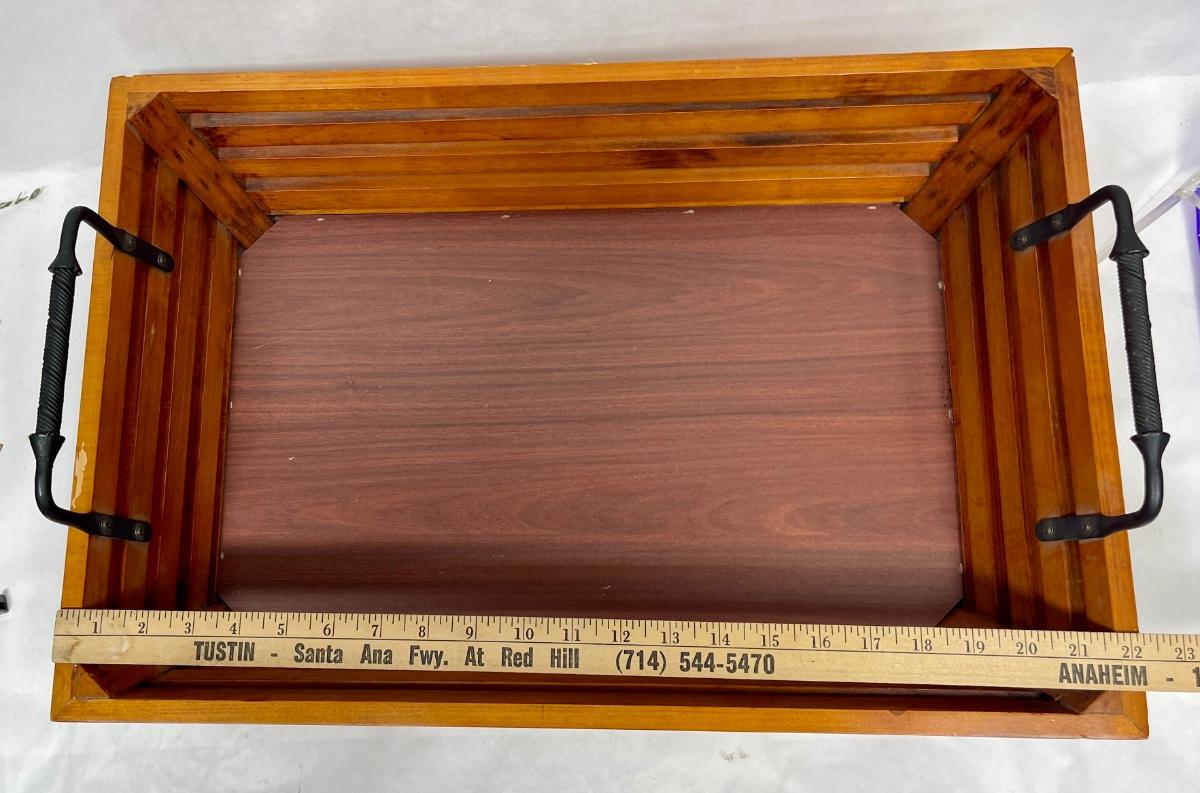 Open-lattice wood rectangular tray with metal handles. Good condition, measures approx. 22" x 17".