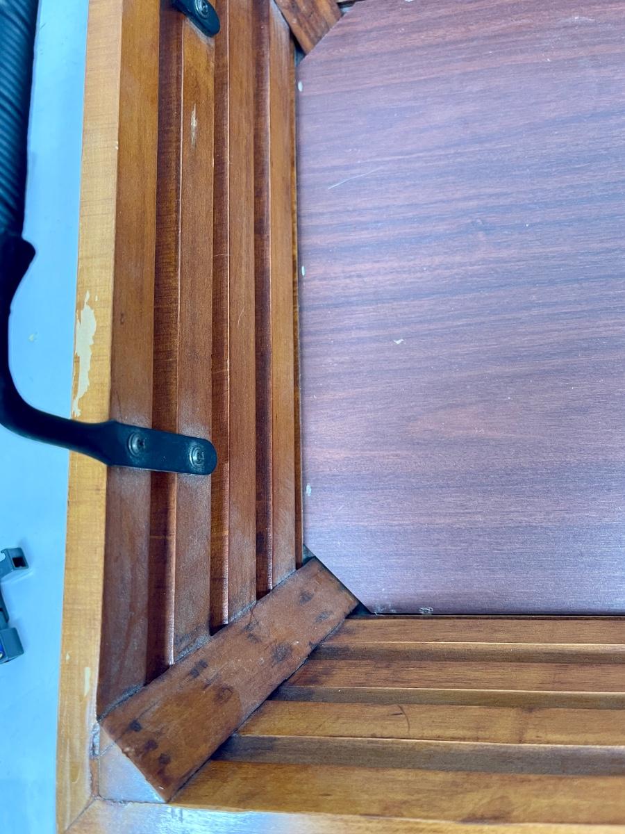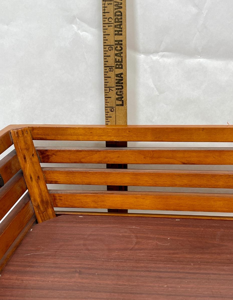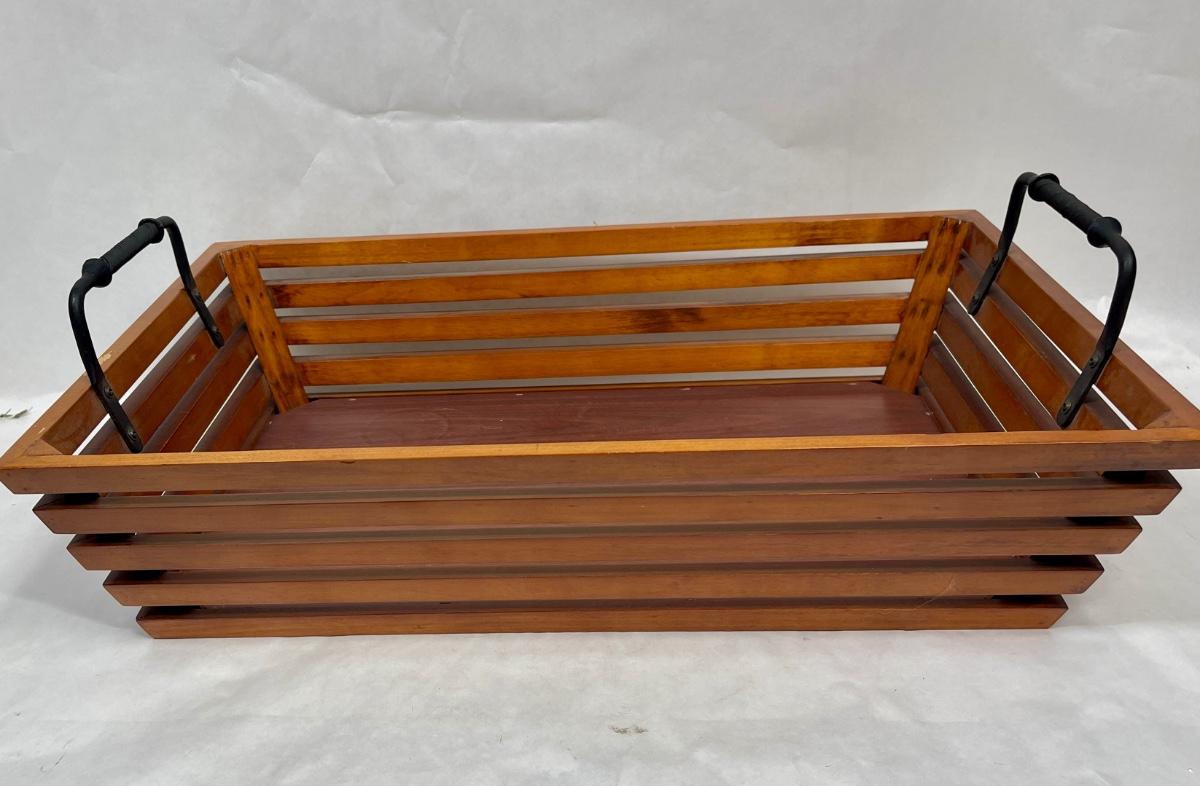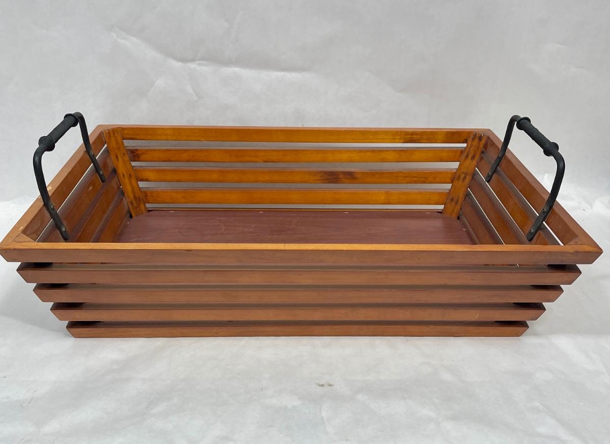 Open-lattice wood rectangular tray with metal handles. Good condition, measures approx. 22" x 17".