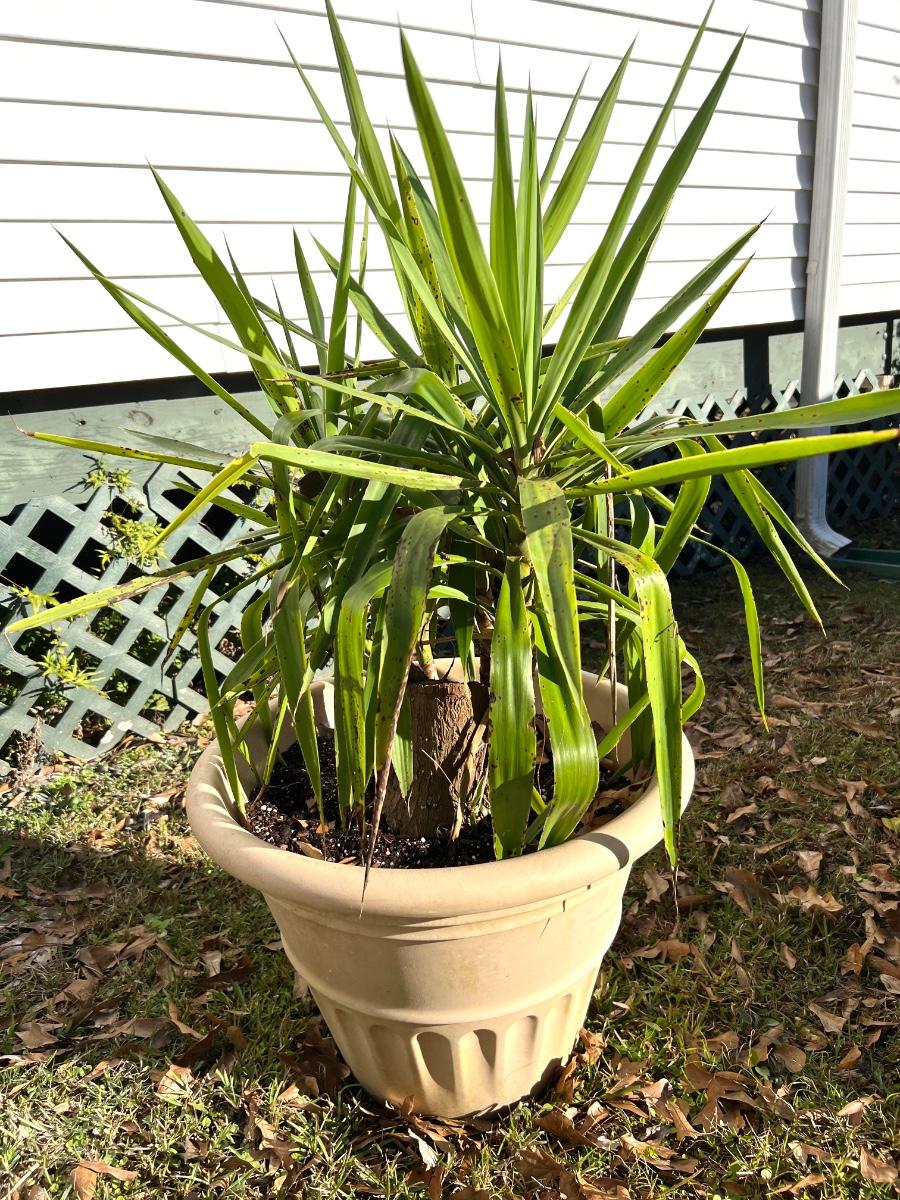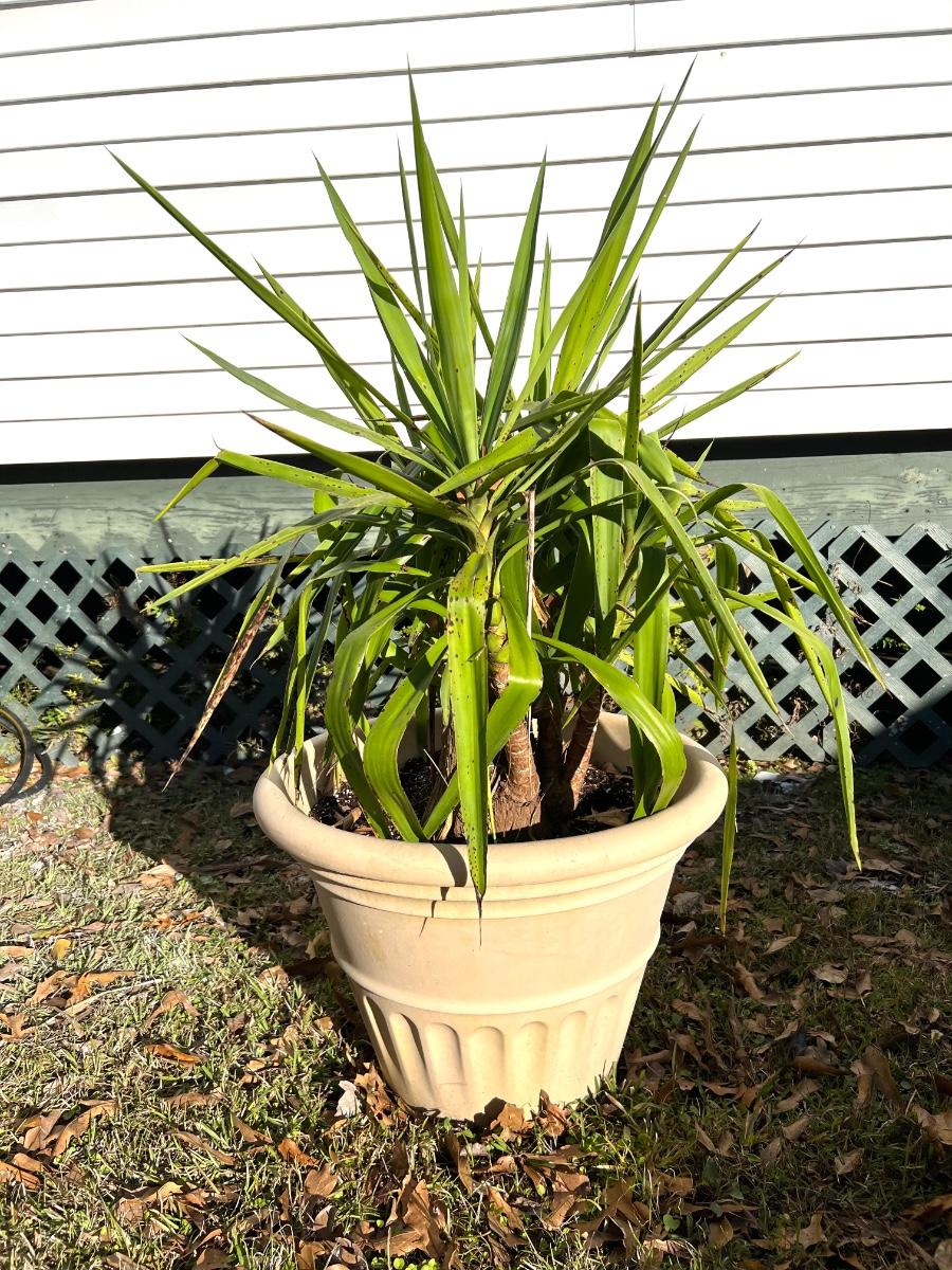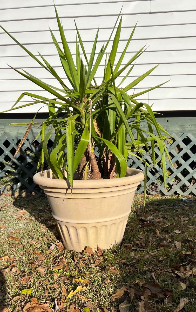 YUCCA Plant. Planter is a heavy plastic and measures 16 inches tall and 25 inches wide. Plant measures from ground to tallest point at 48 inches tall.