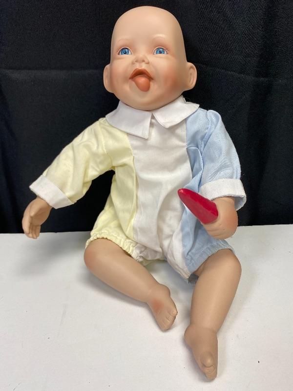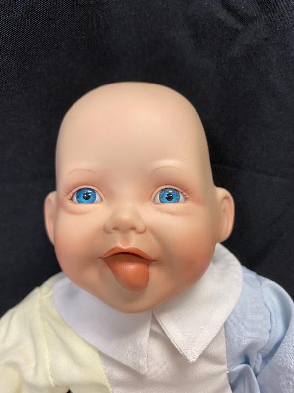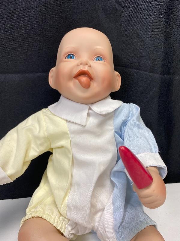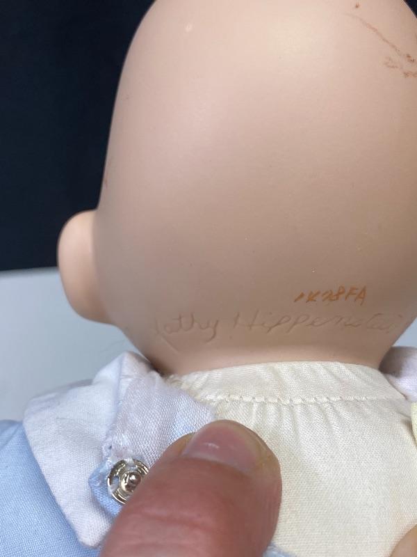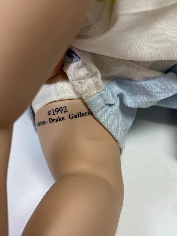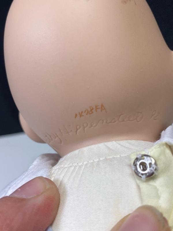"Yummy" porcelain doll by Kathy Hippensteel and Ashton Drake Galleries 1992. Sitting doll, about 11" in length. Good condition, a couple smudges on head. Numbered on head 1478FA.