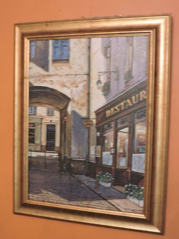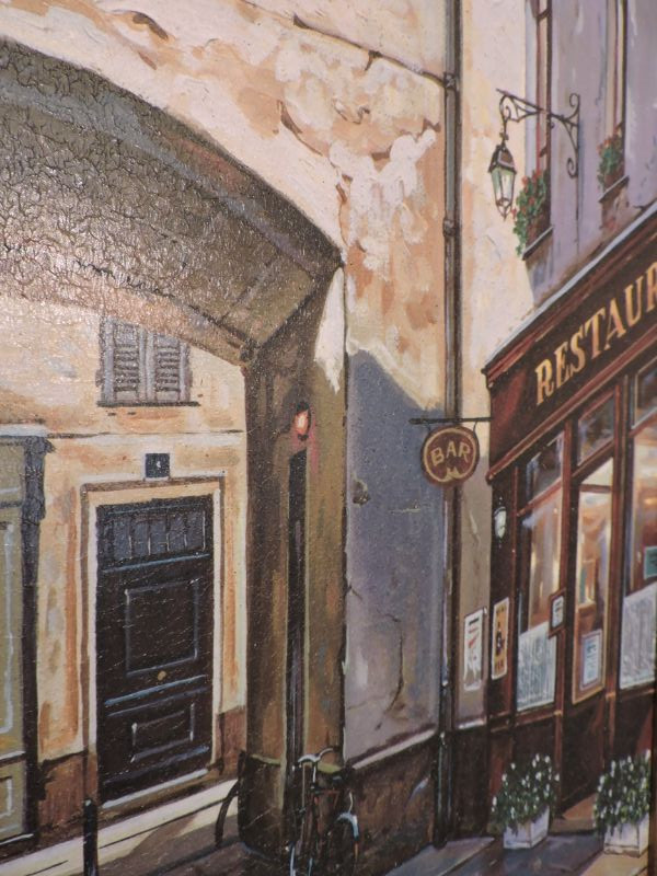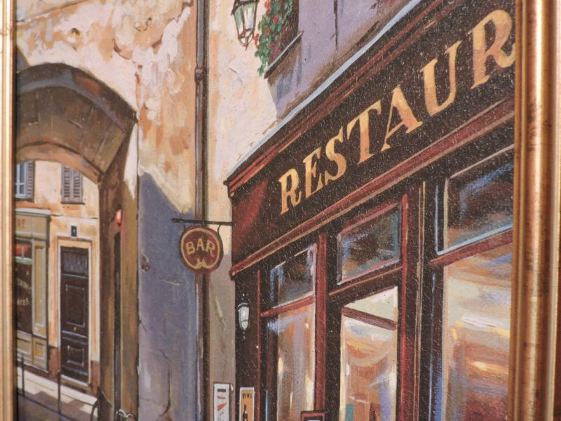 Yuri Dvornik oil print on canvas of cobblestone street with restaurant and arch. Antique gold frame. Print is 17”x23”. Framed size is 22”x28”.