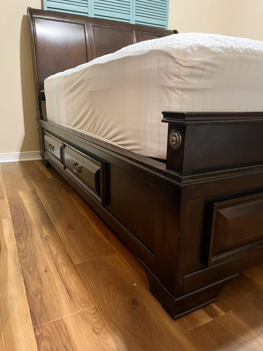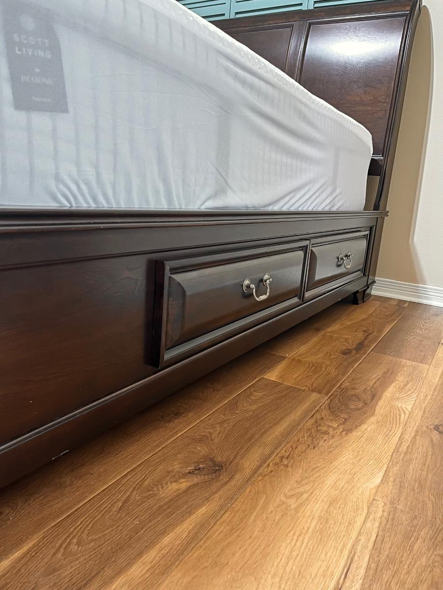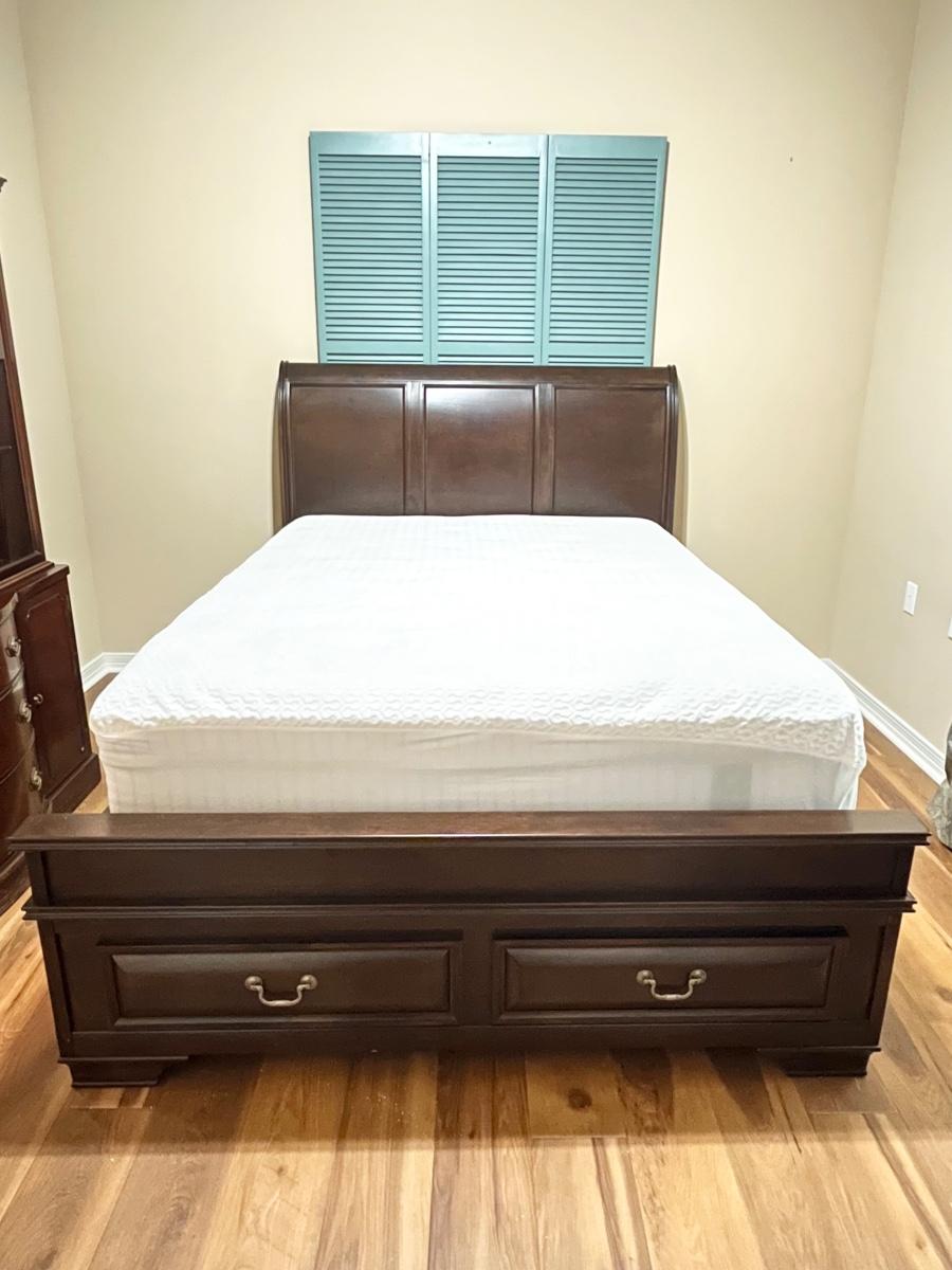 Headboard 54.5” H ~ Bed has 6 drawers that slide easily under mattress for added storage ~ Mattress is a Scott Living By RESTONIC Panorama in queen ~ Has been deodorized, disinfected & sanitized