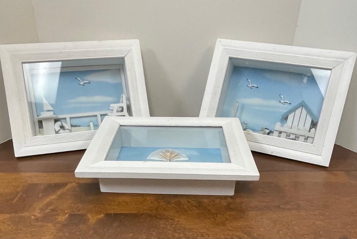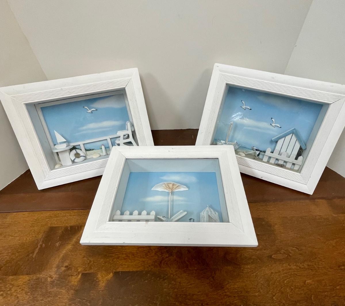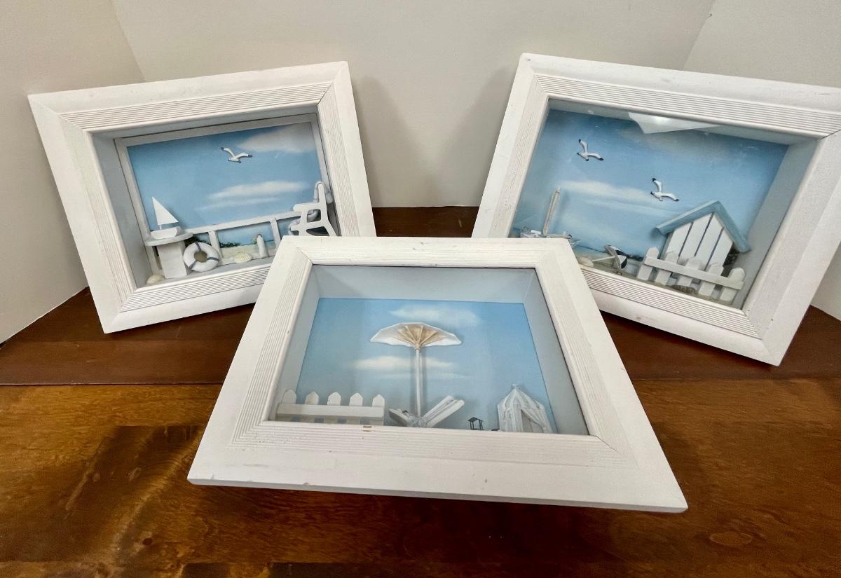 Set of Three Beach Coastal Scene Shadowbox Wall Art. In displayed condition.