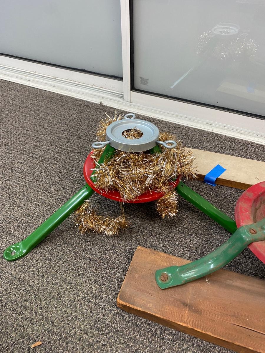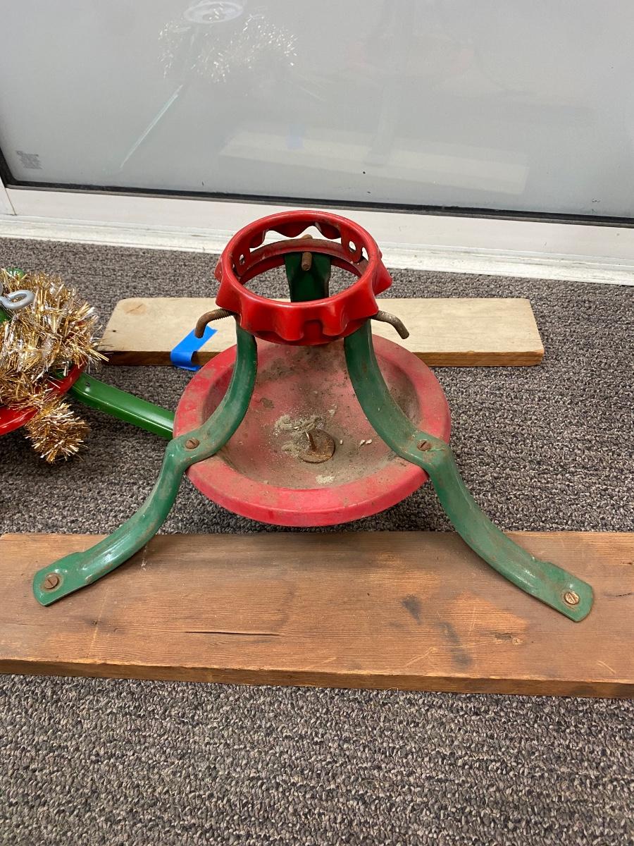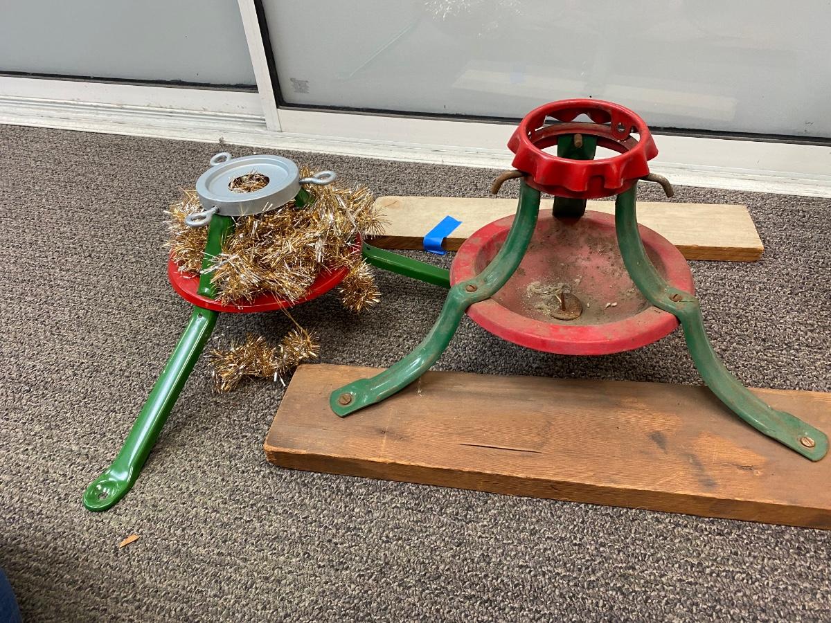 Pair of Vintage Metal Christmas Holiday Tree Stands. One is stuck to a couple wood boards for more stability. In vintage conditions.