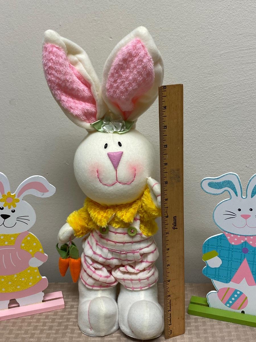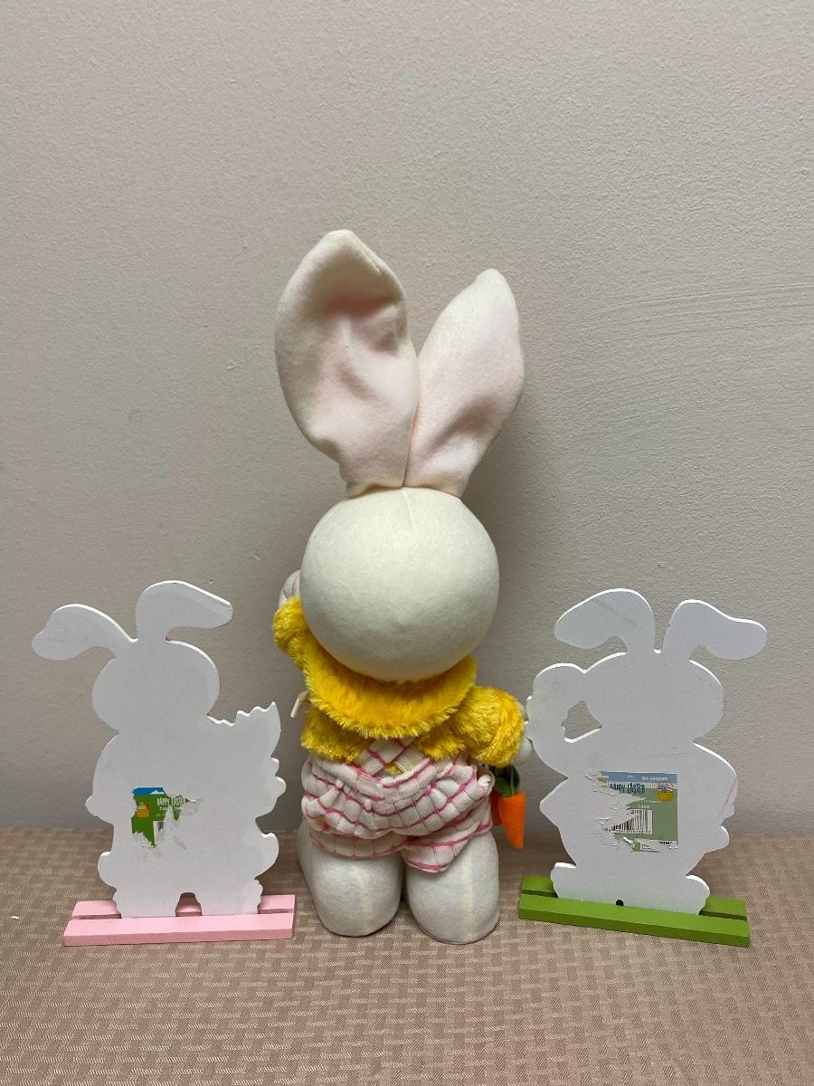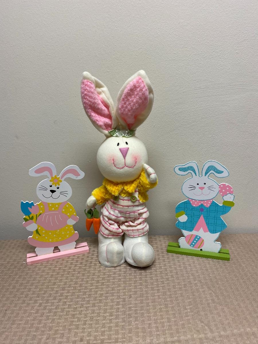 Easter Bunny Holiday Springtime Decor. Holiday plush and pair of standing painted wood figures. Good condition.