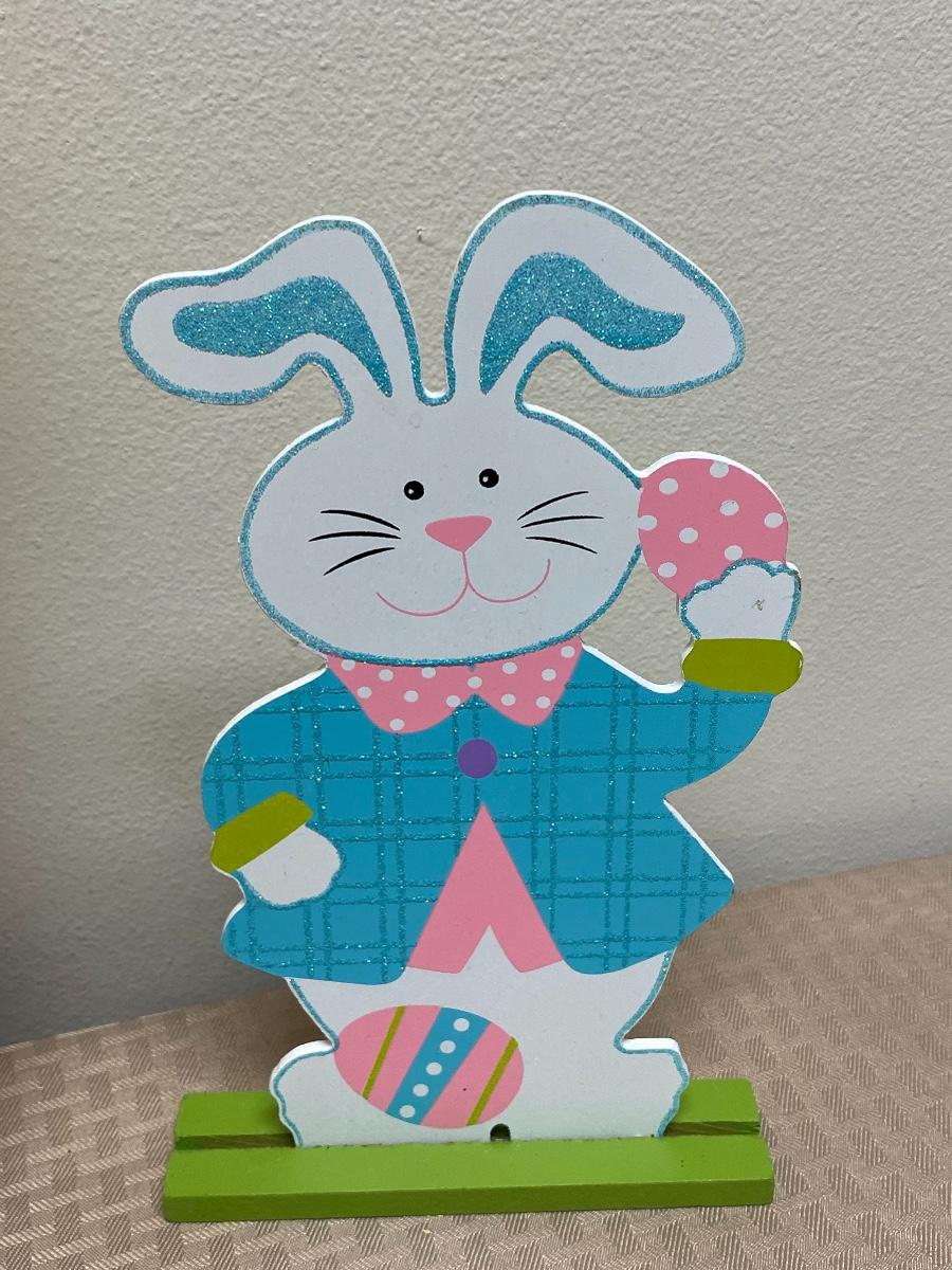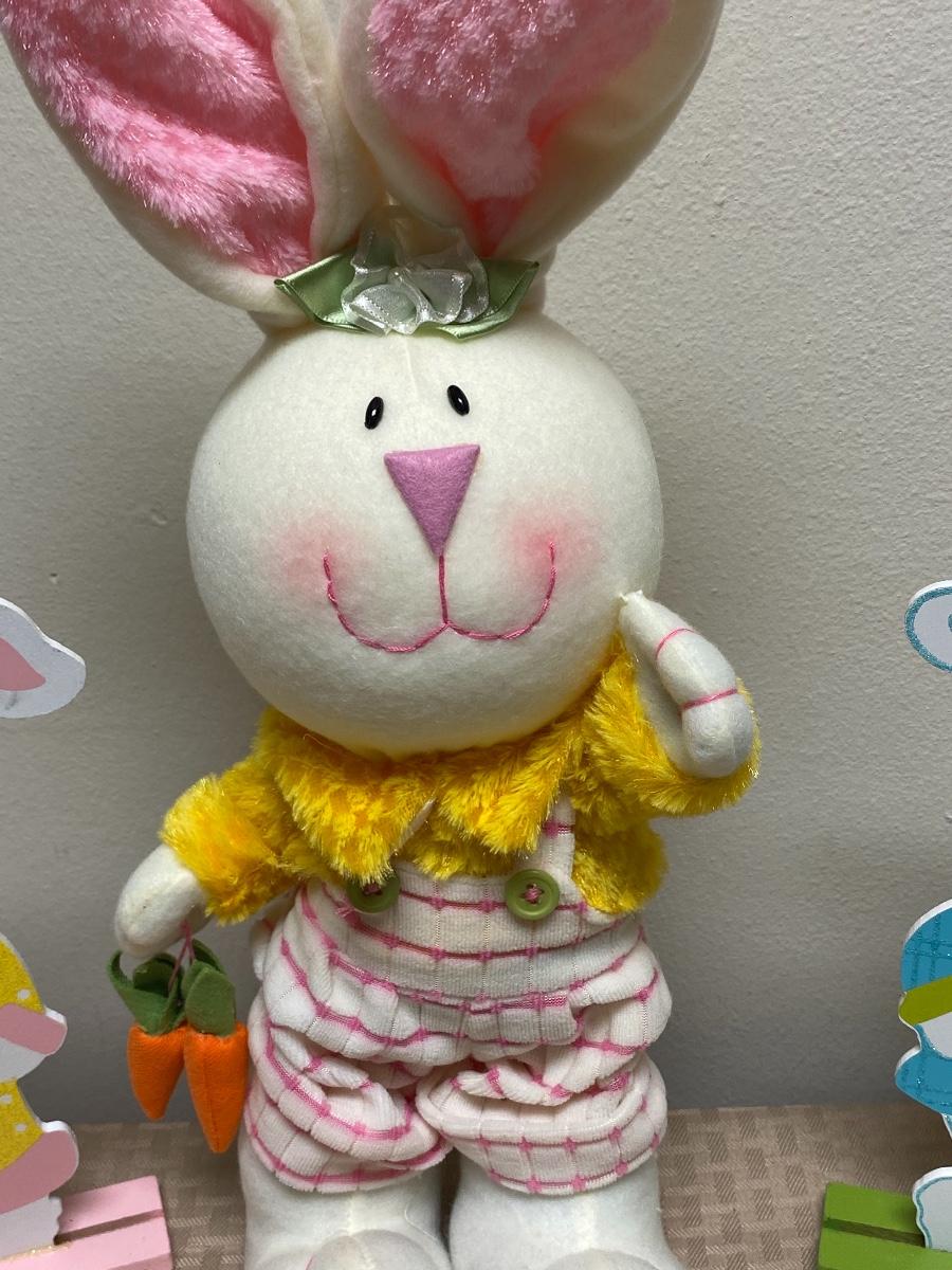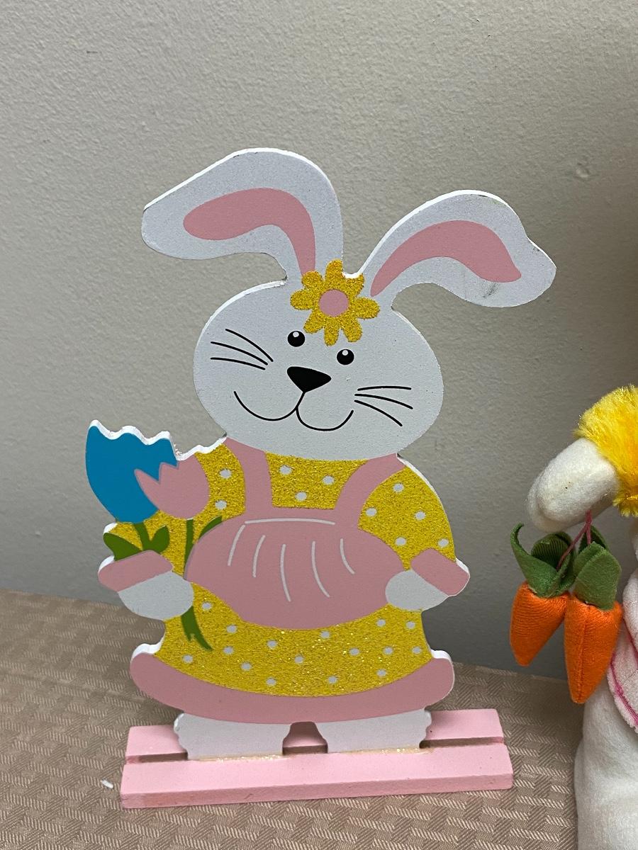 Easter Bunny Holiday Springtime Decor. Holiday plush and pair of standing painted wood figures. Good condition.