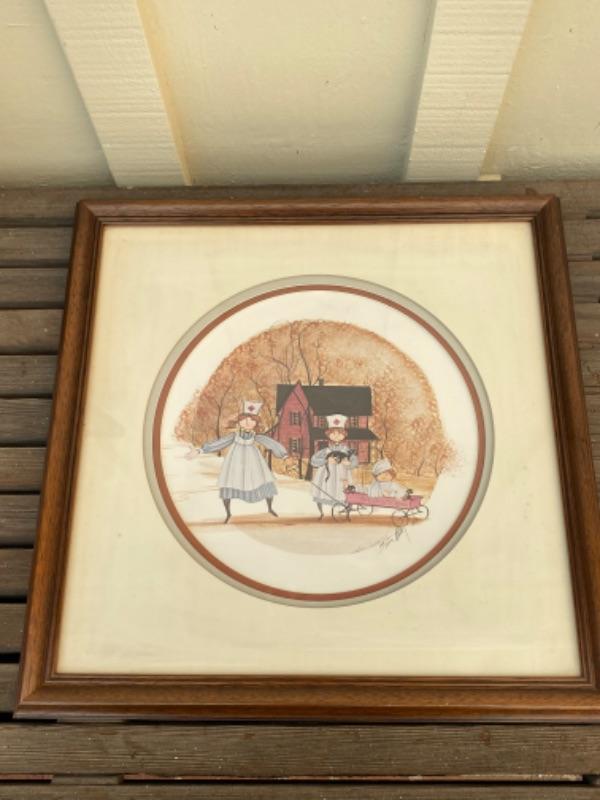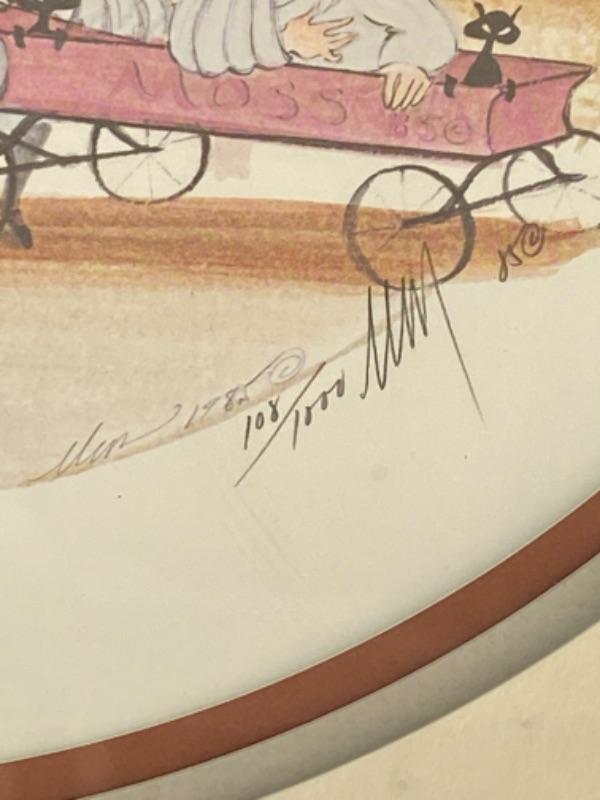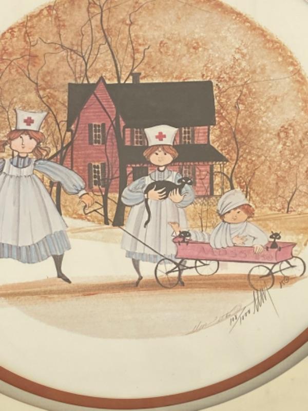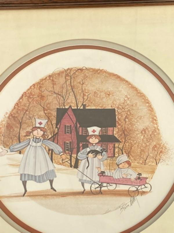 1985 Two Nurses with their patient in a red wagon and lots of black cats -  framed by P. Buckley Moss, limited and signed #108/1000