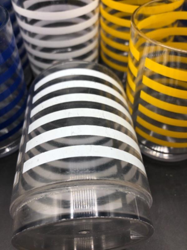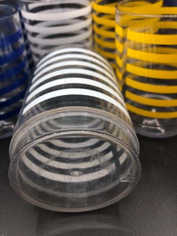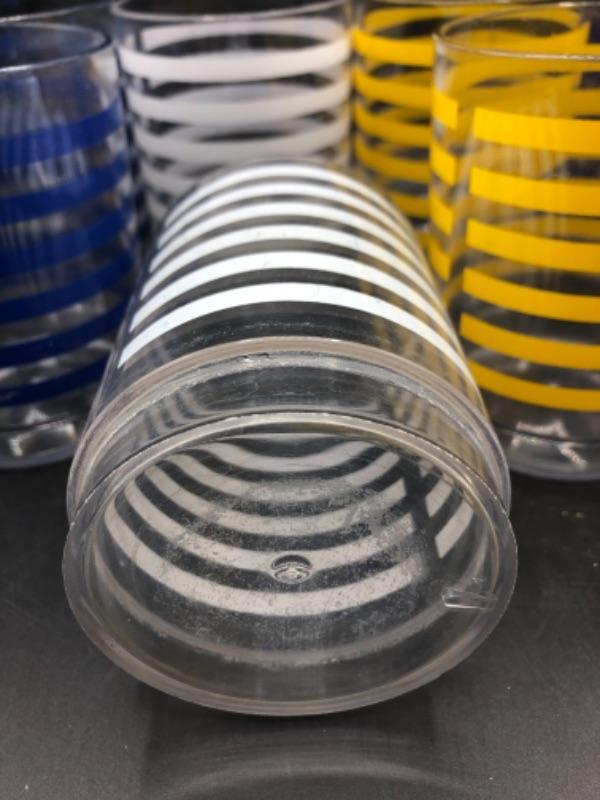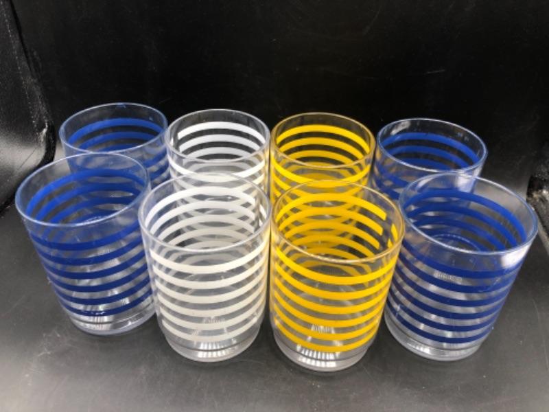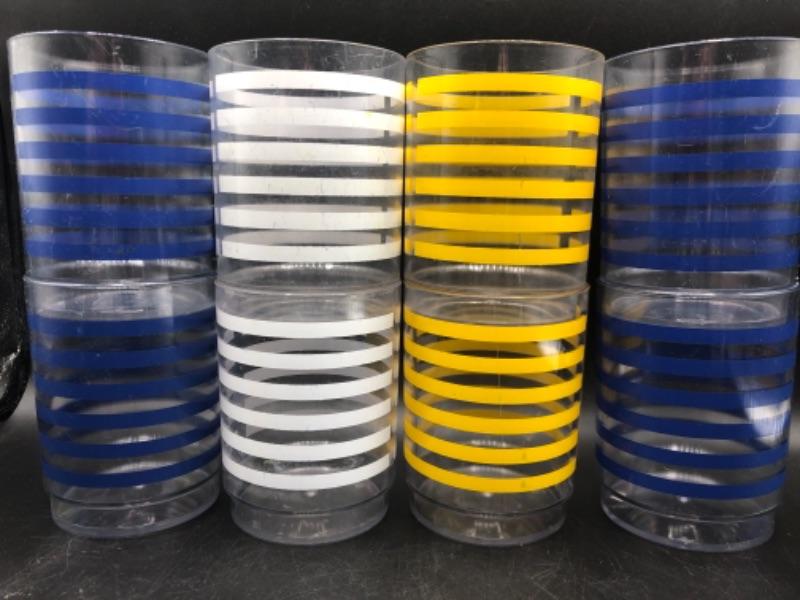 Set of 8 striped plastic cups. Rocks size tumblers, great for poolside drinks. Good used condition.