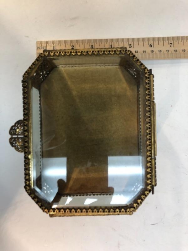 Vintage brass jewelry casket. Brass frame with glass sides and lid. Faded and worn velvet bottom. Roughly 8"x6" rectangular size.
