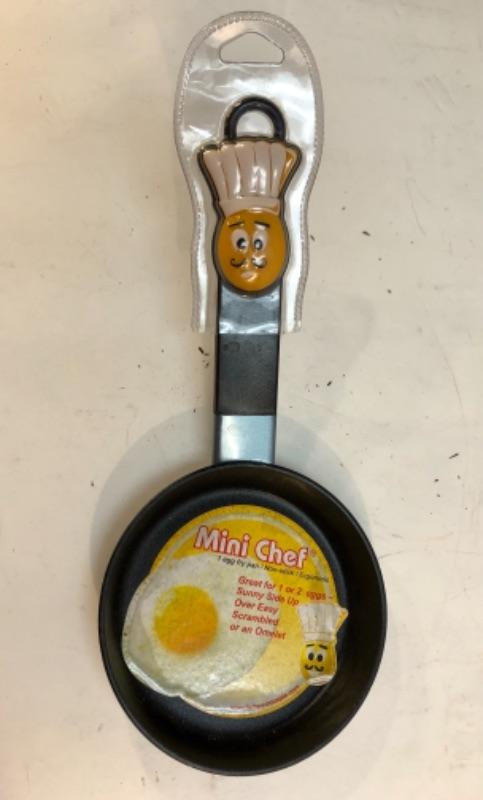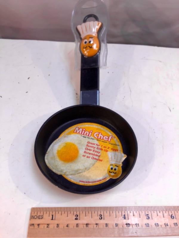 Small, single egg pan by Mini Chef. Has a chef hat wearing egg on the handle.