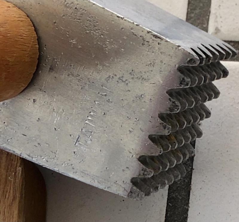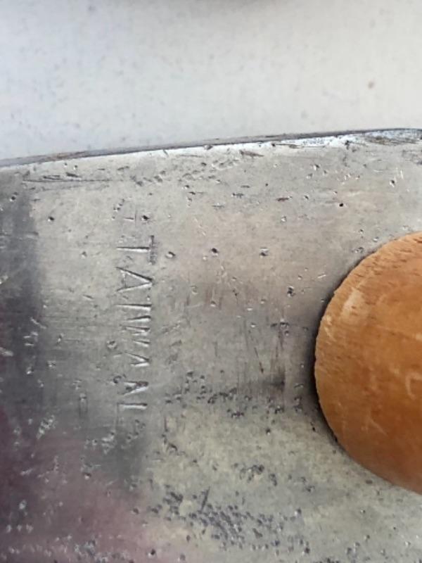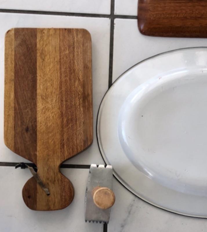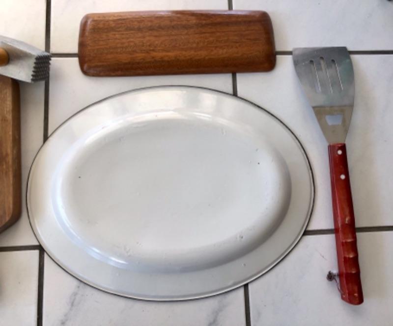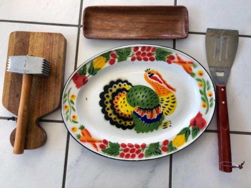 Kitchen lot, barbecue lot: (1) wood cutting board, (1) painted metal Turkey platter, (1) teak wood serving dish, (1) vintage wood handled barbecue spatula, (1) vintage wood handled meat tenderizer.
