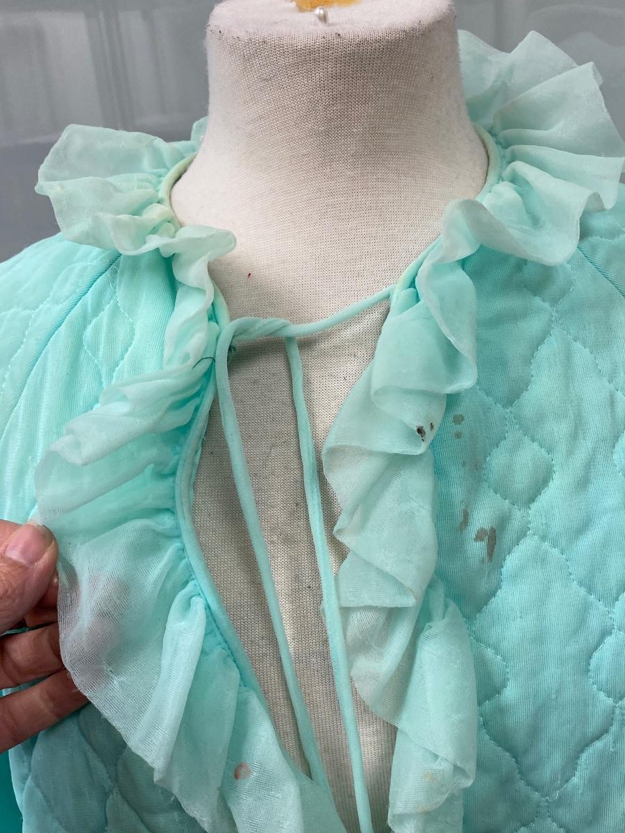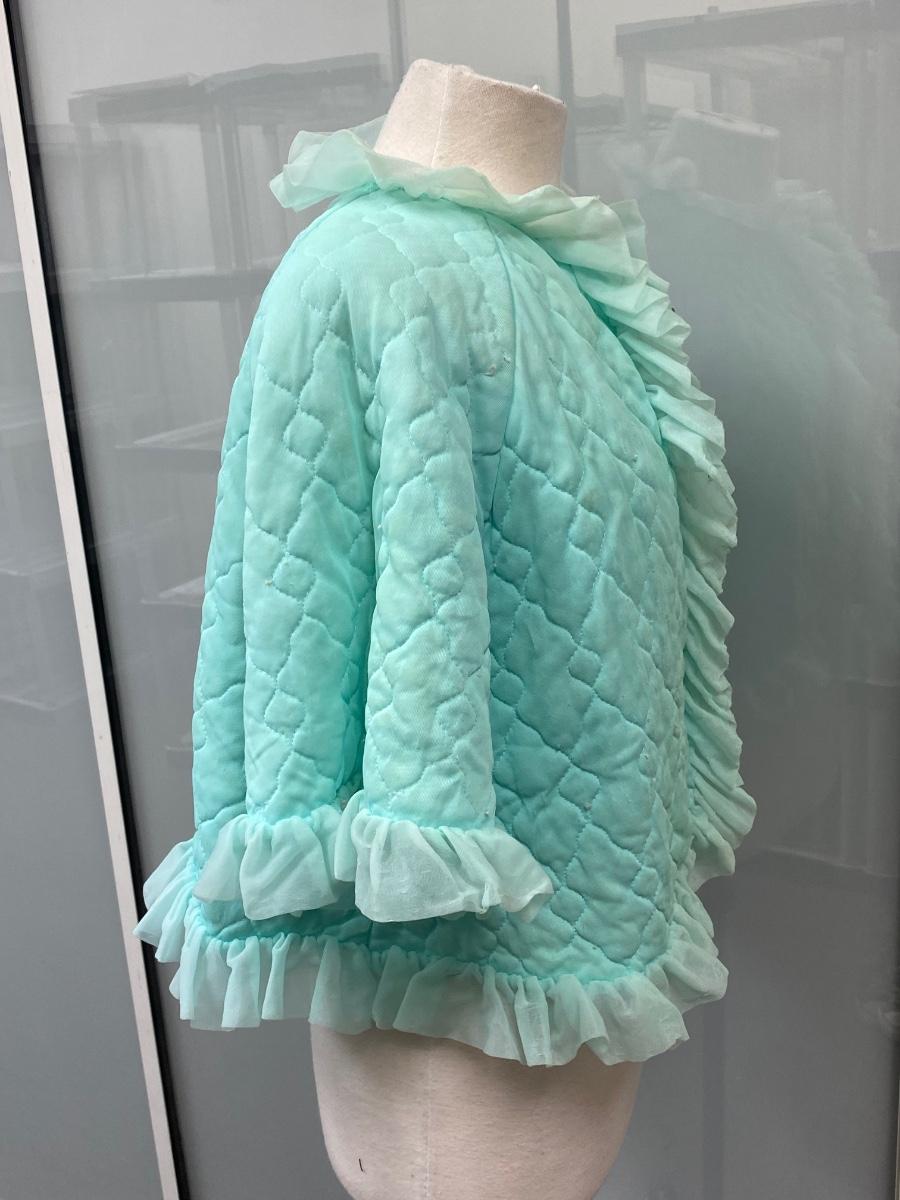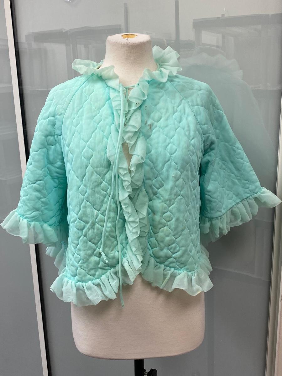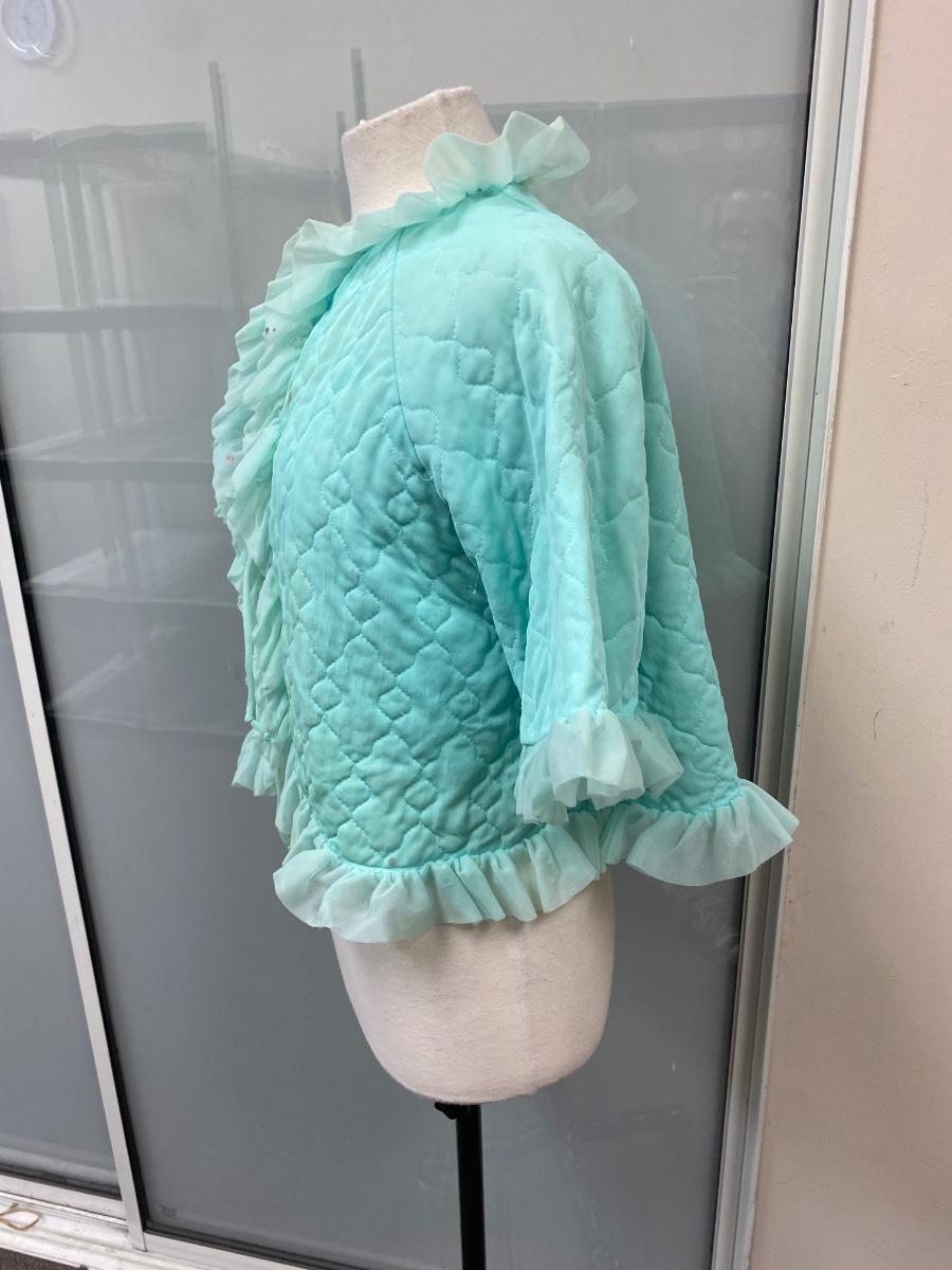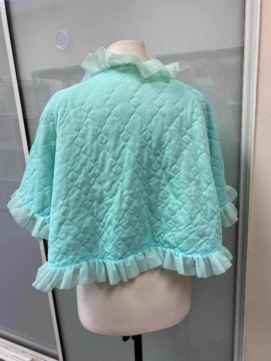 Retro Vintage Green Ruffled Edge PJ Capelet Shrug Made in California Medium. There are some small spots down the front and discolor along the neck. Super cute with potential. Single tie at neck in the front. Does have short sleeves, not a shoulder cape.