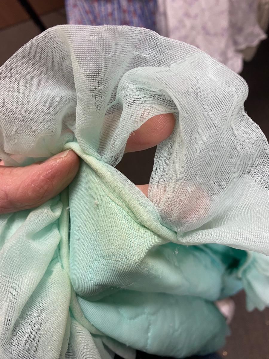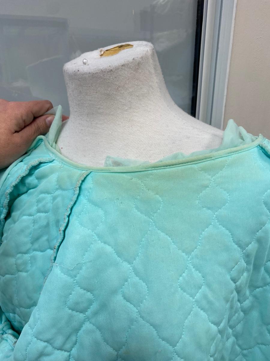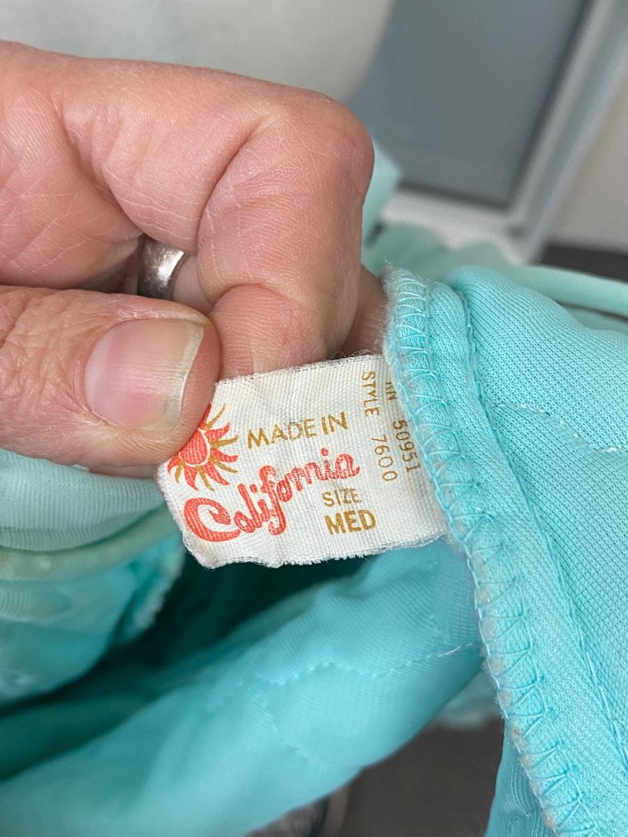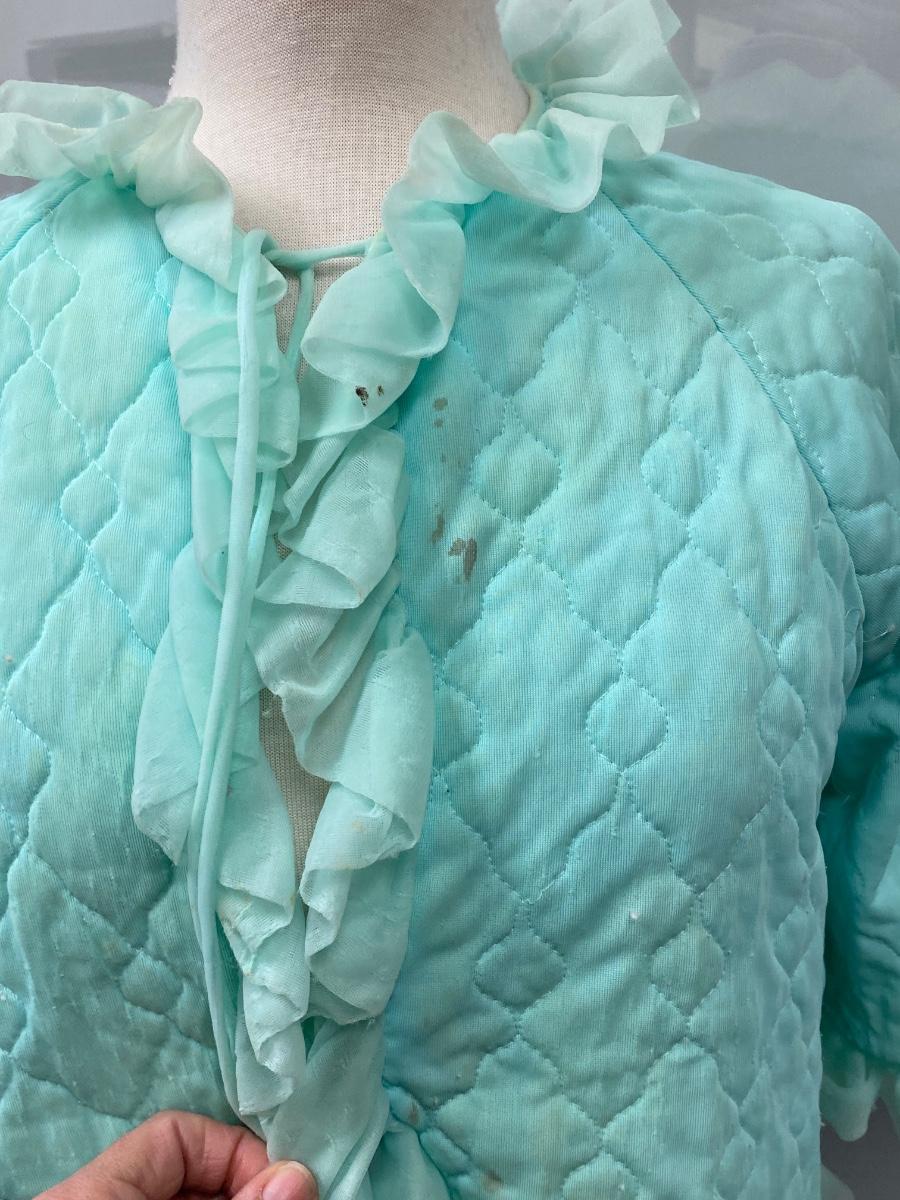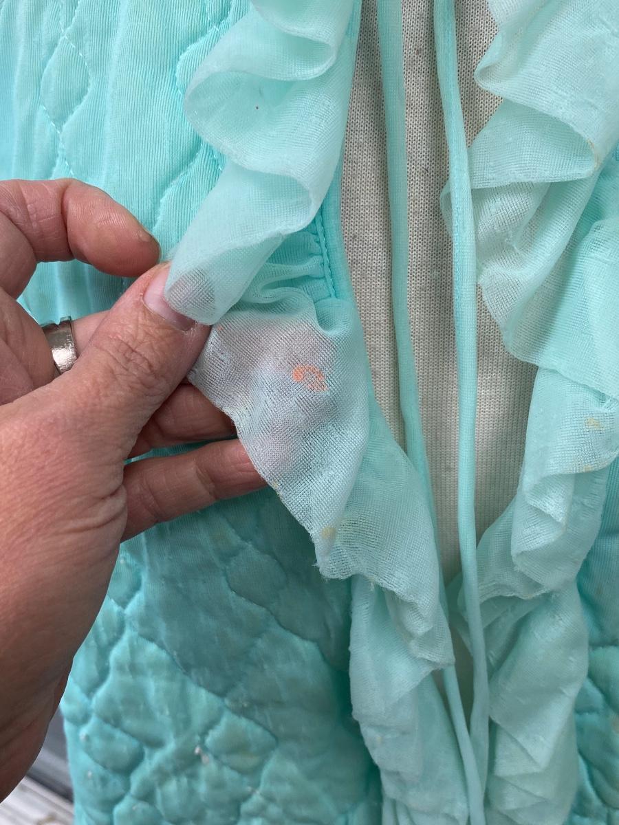 Retro Vintage Green Ruffled Edge PJ Capelet Shrug Made in California Medium. There are some small spots down the front and discolor along the neck. Super cute with potential. Single tie at neck in the front. Does have short sleeves, not a shoulder cape.