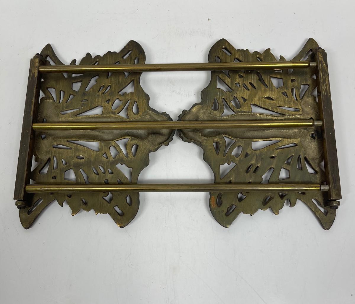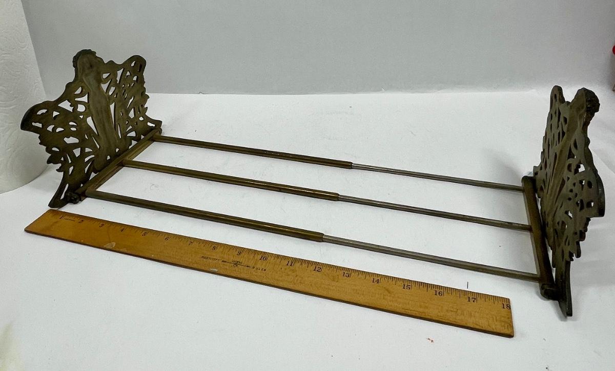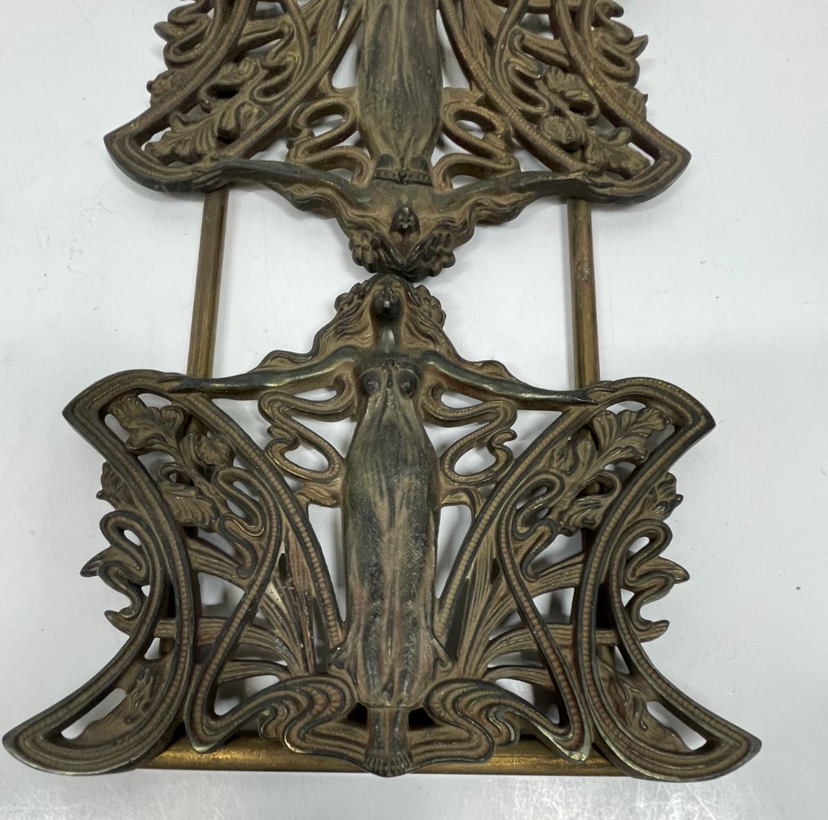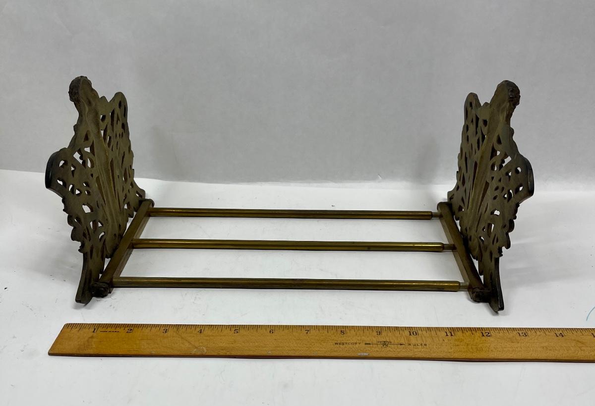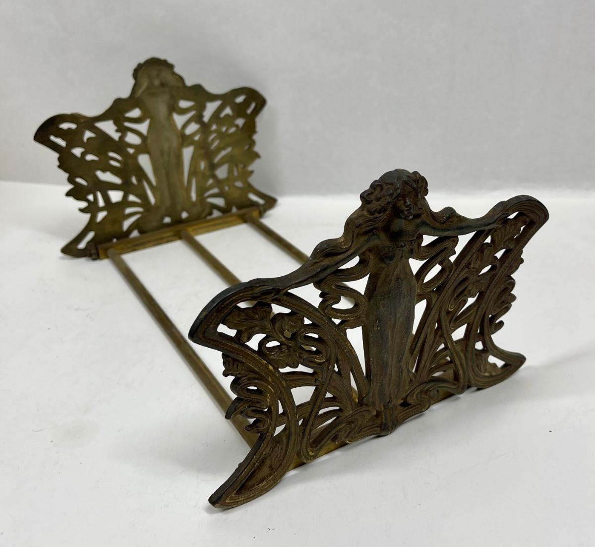 A great vintage book rack. Features a woman surrounded by ornate scrolling with a fabulous art nouveau flair. These are cast iron with a brass finish. No apparent makers mark. The rack is approx. 5-1/2" high, the minimum rack width is approx. 12", it expands to approx. 21.5". Some finish wear and mild oxidation overall.
