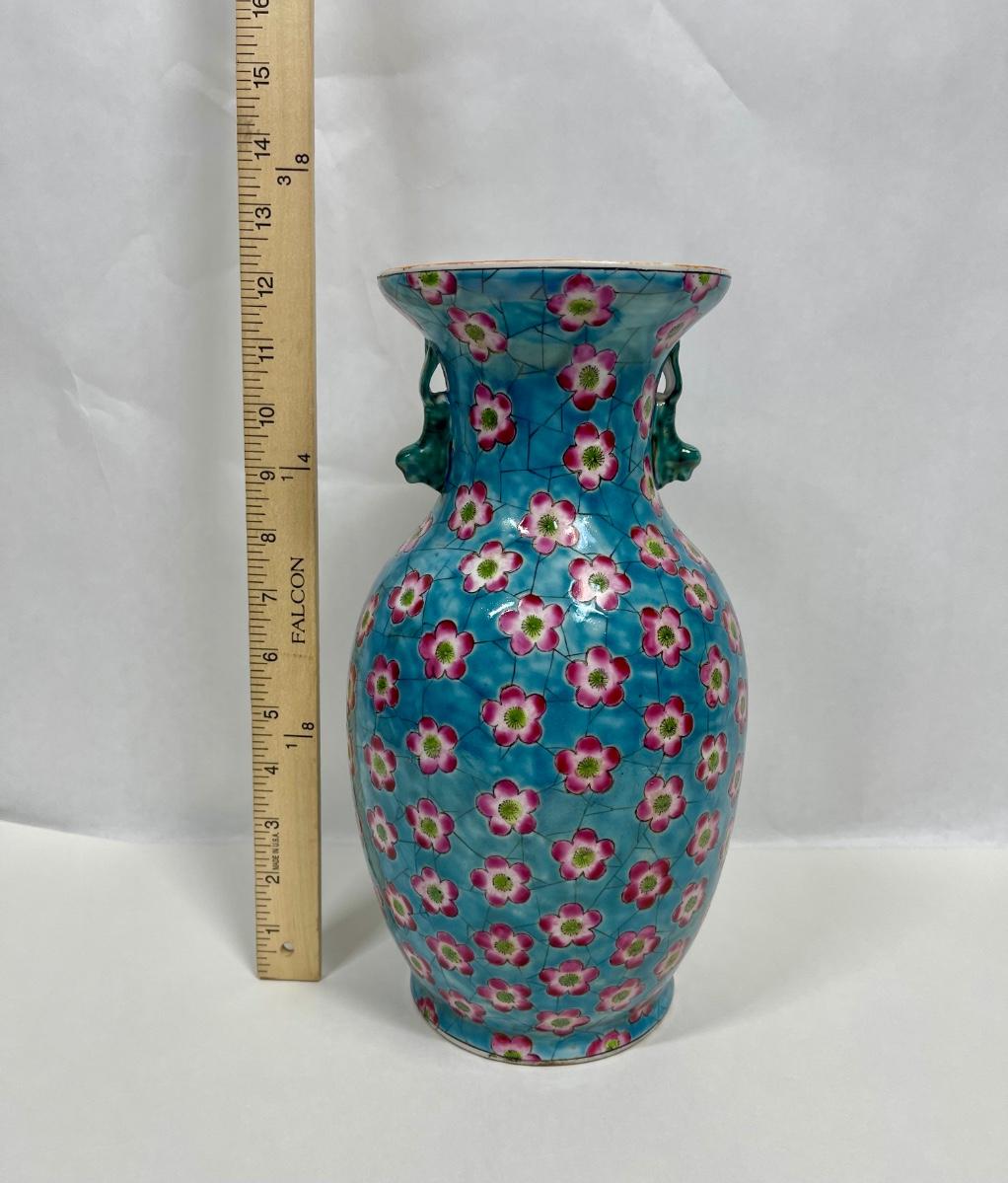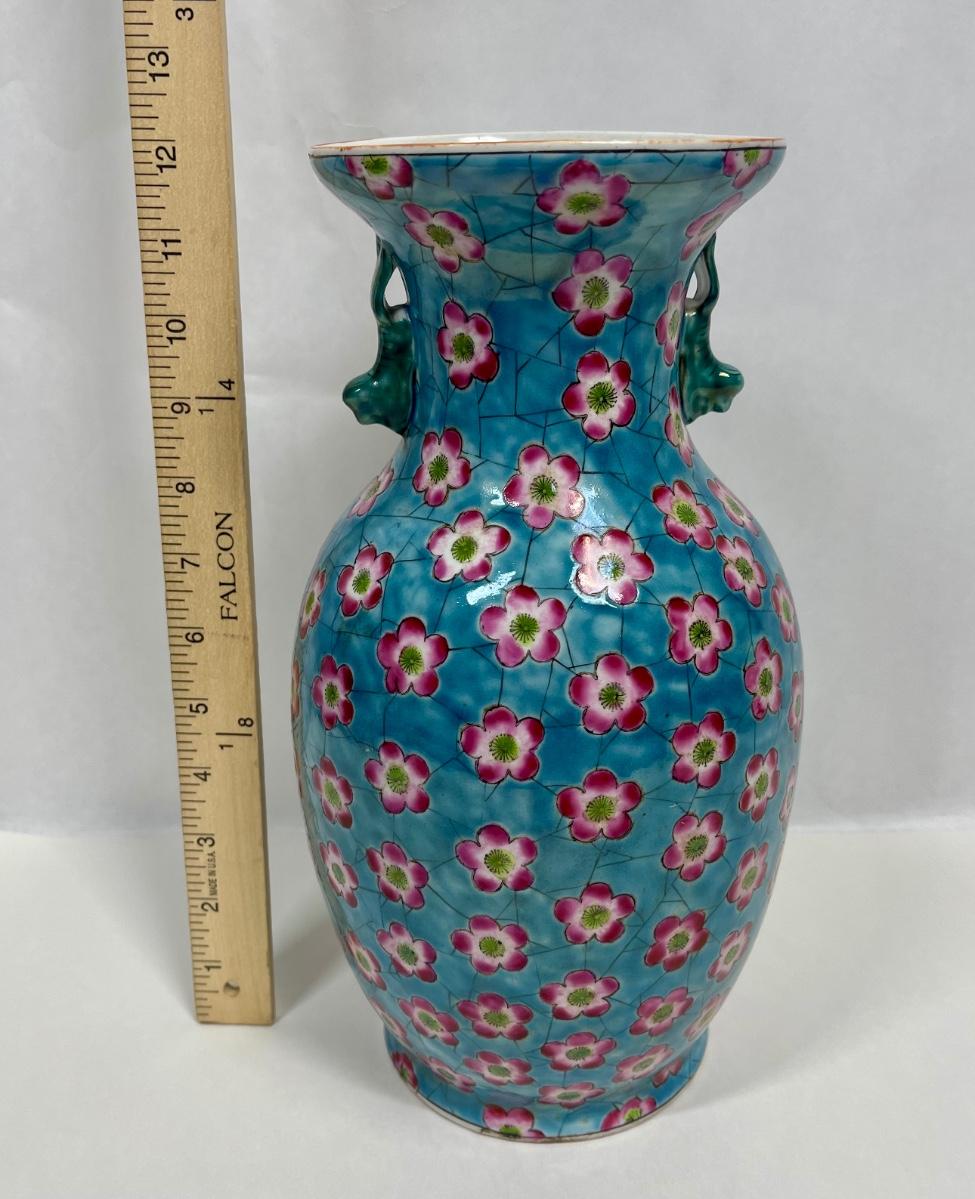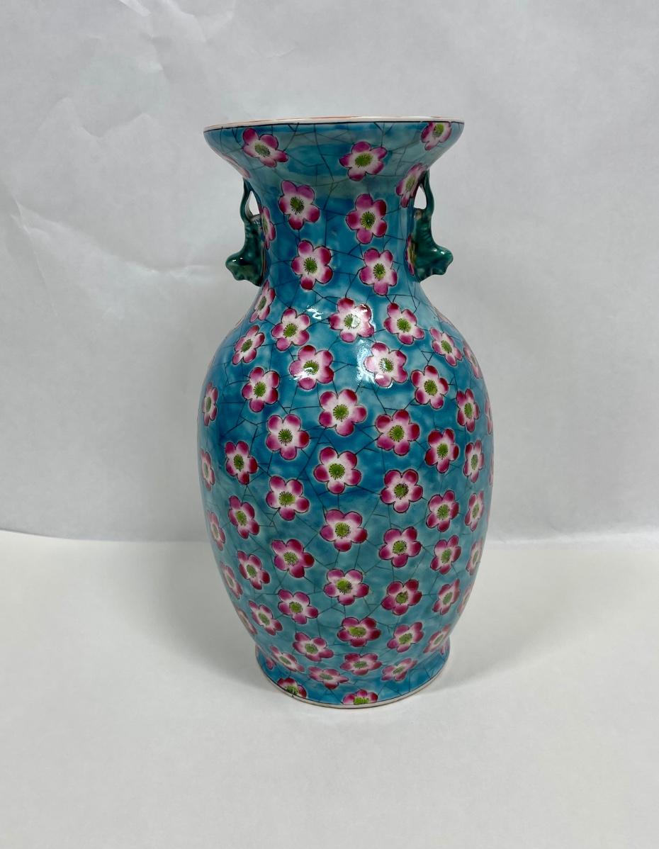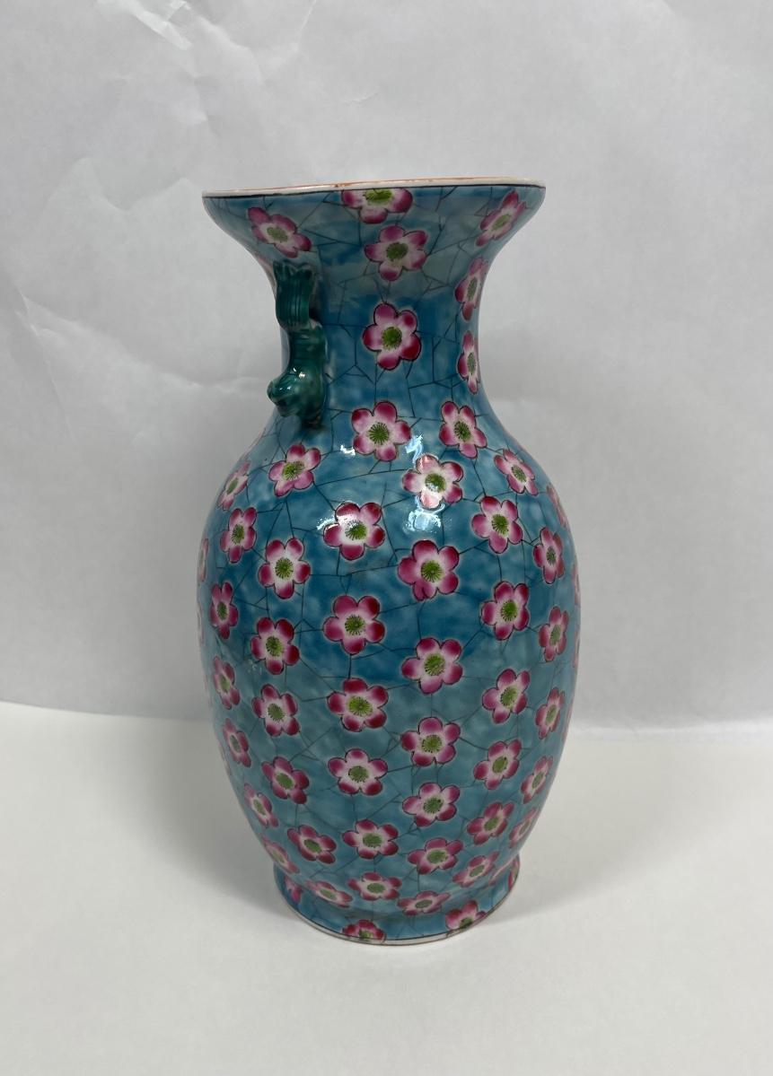 Chinese Porcelain Vase Hand-painted Dark Pink Flowers on Light Blue w Foo Dog Handles, Chinoiserie Decor