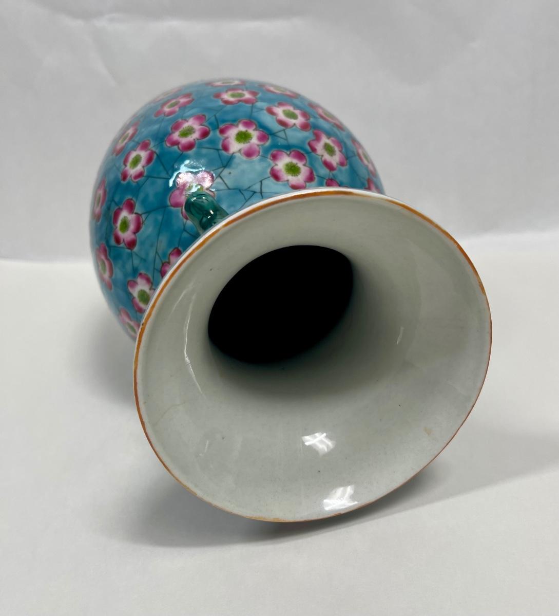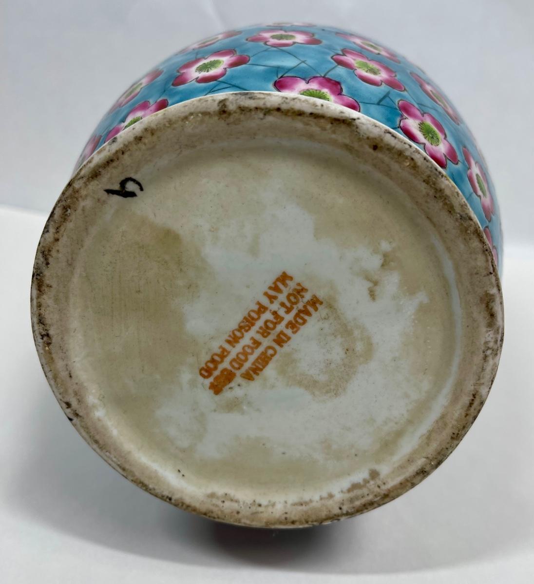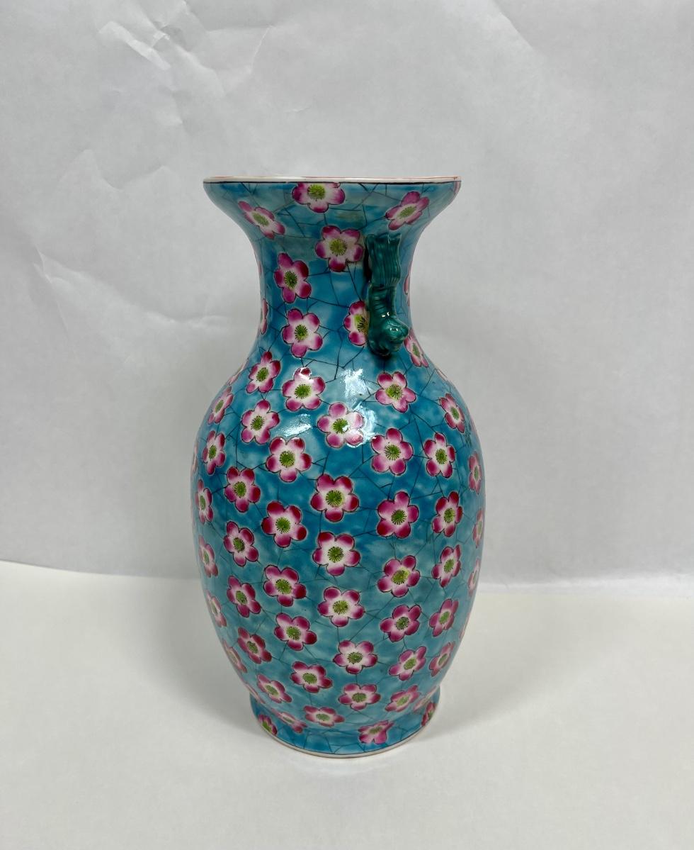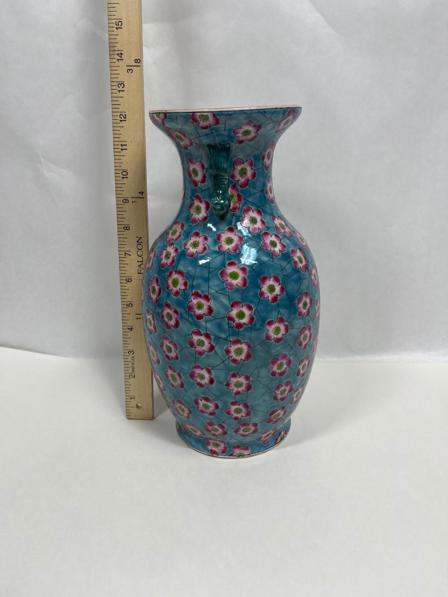 Chinese Porcelain Vase Hand-painted Dark Pink Flowers on Light Blue w Foo Dog Handles, Chinoiserie Decor