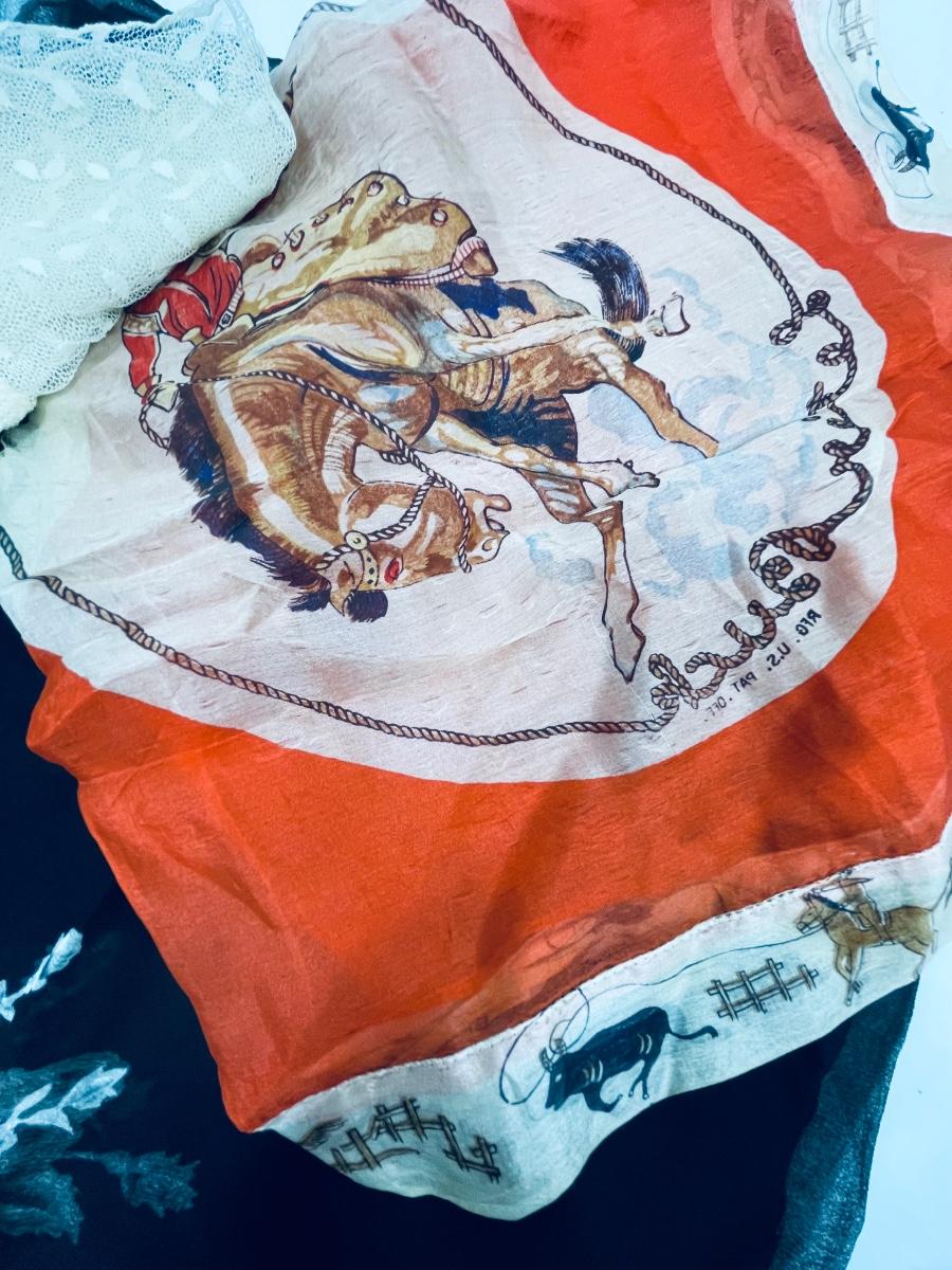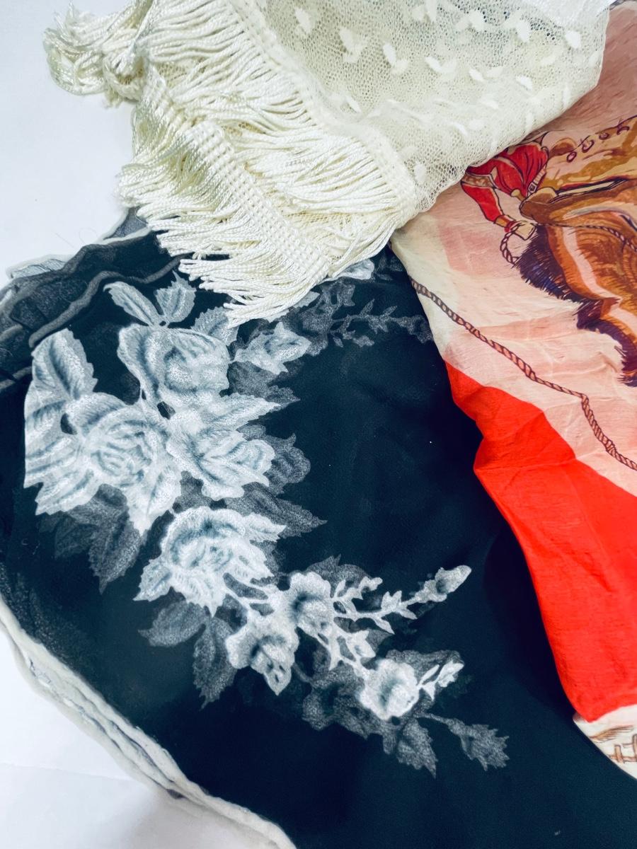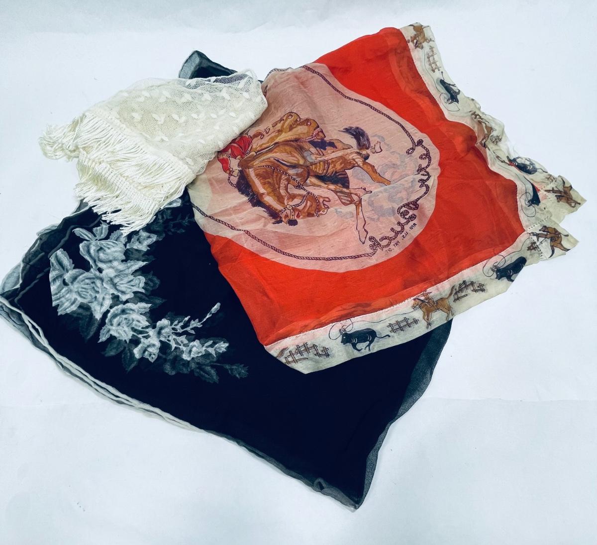 3 Vintage / Antique Scarves - Cowboy themed, "B" with Roses and Cream Colored Lacy Triangle