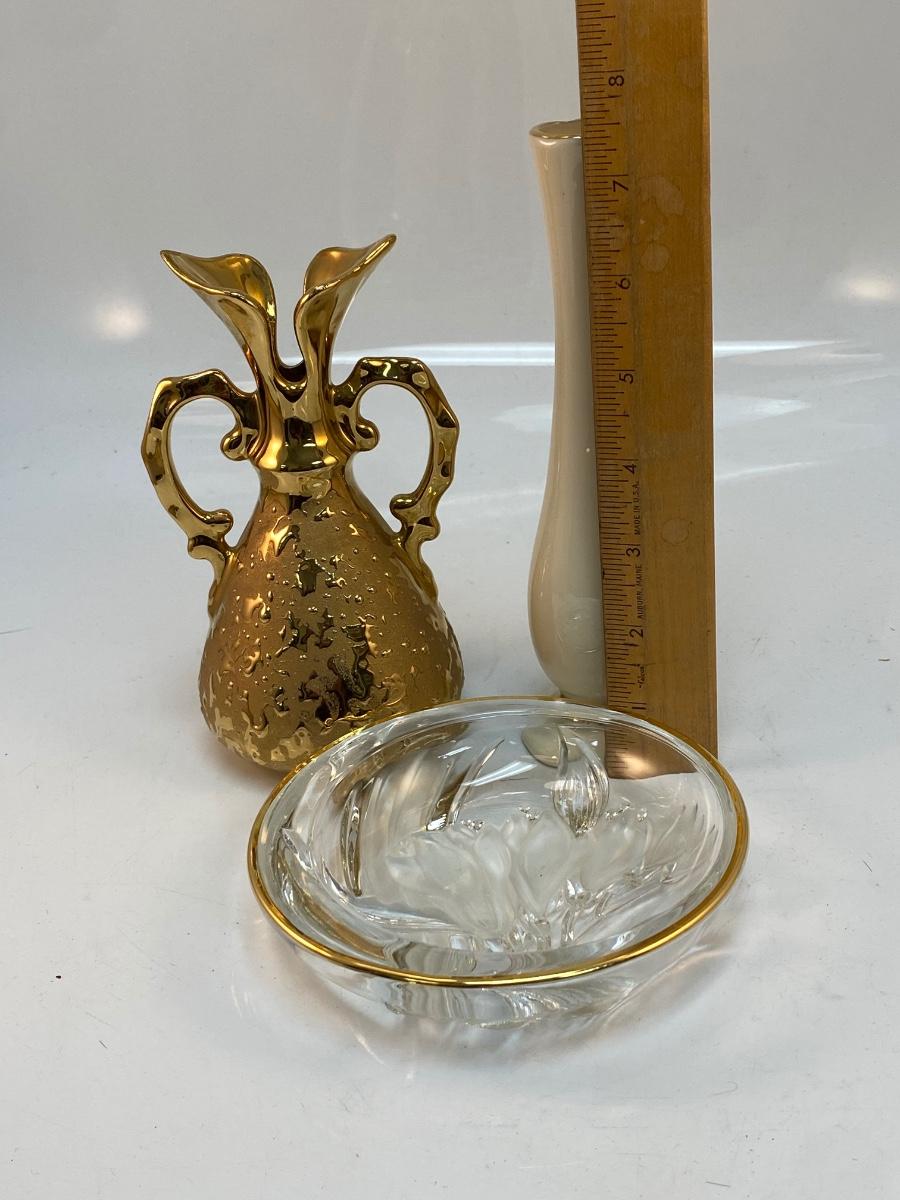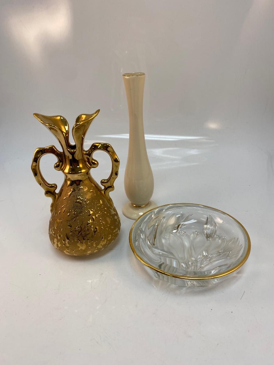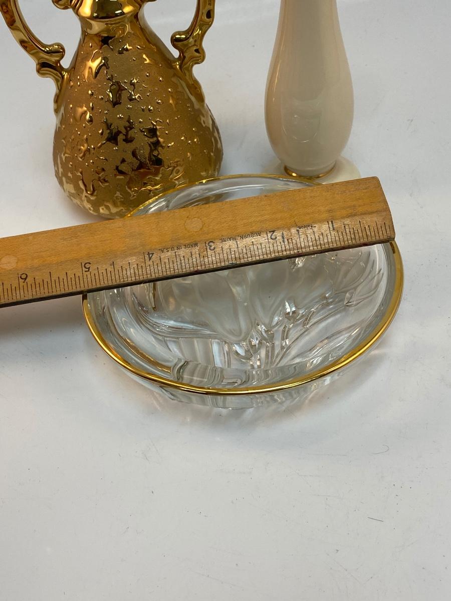 Three Piece Hollywood Regency Glamour Gold Accent Decor Lot Lenox Bel-Terr Gold Plate. All pieces are in good condition. Small sizes, perfect accent pieces.