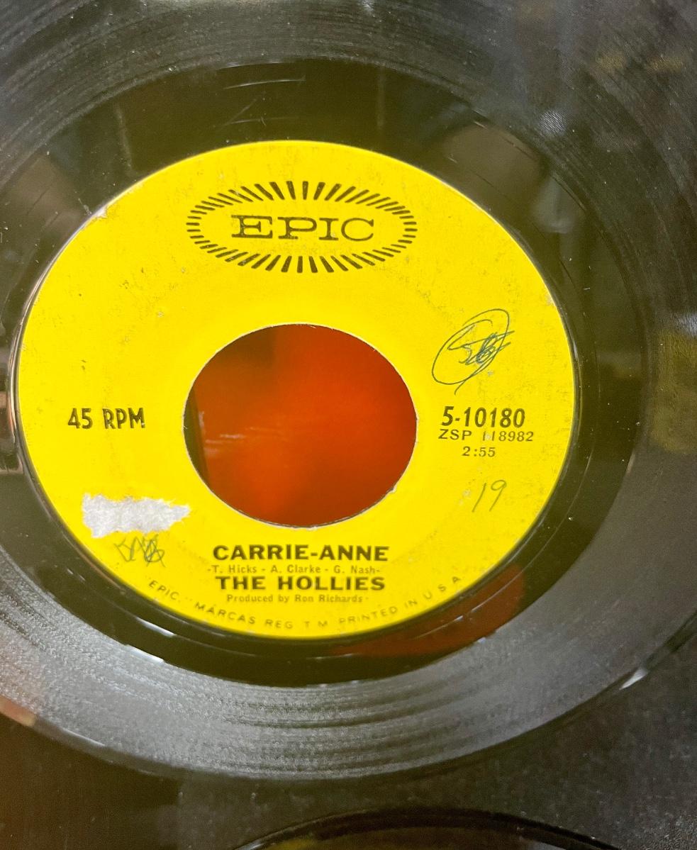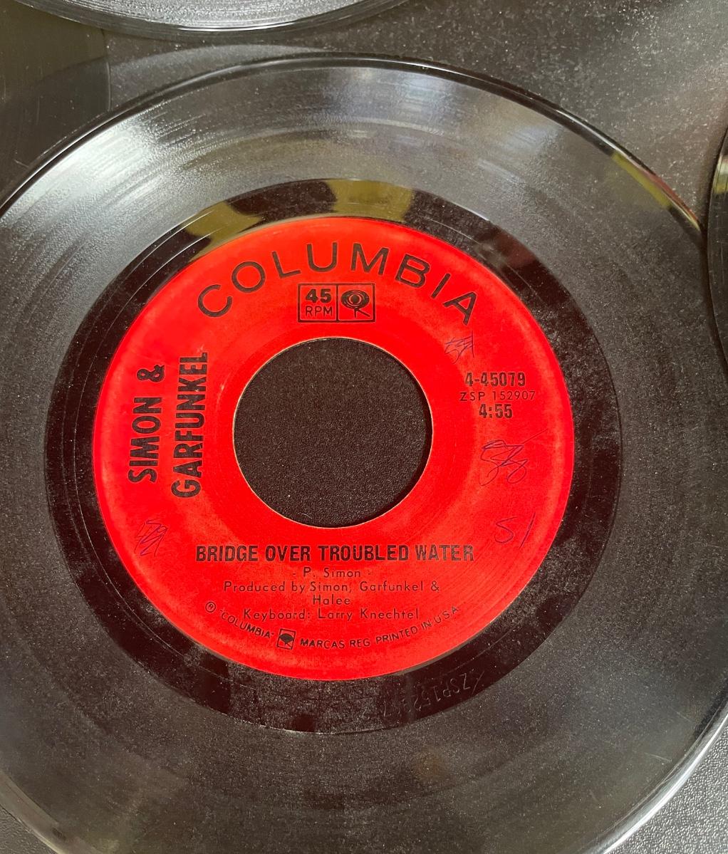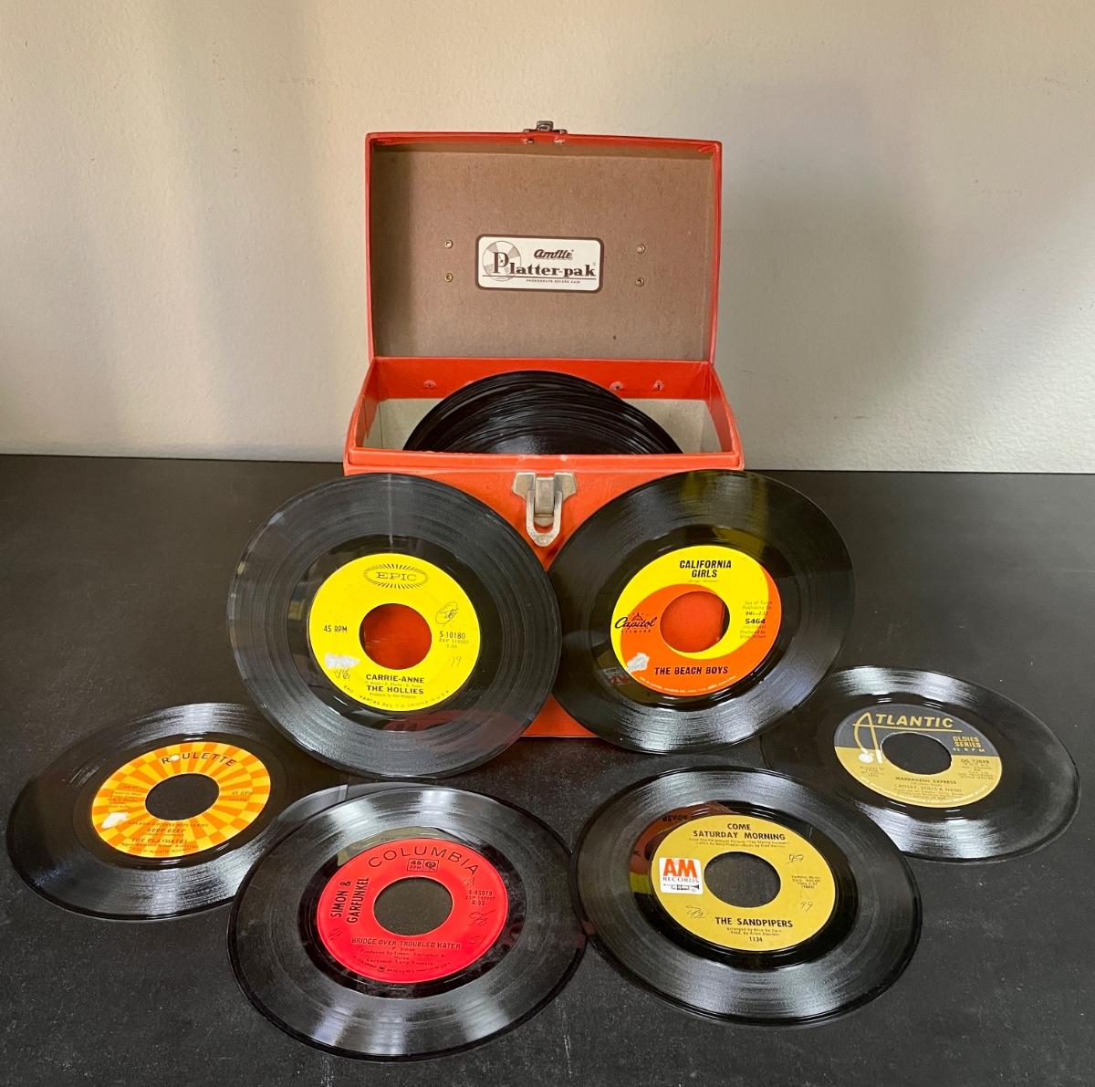 Case is in good condition, records are in good to fair condition. Examples of record titles: "Beep Beep" by the Playmates on Roulette Records, "Carrie-Anne" by the Hollies on Epic Records, "Bridge Over Troubled Waters" by Simon and Garfunkel, "California Girls" by The Beach Boys on Capitol Records, "Come Saturday Morning" by the Sandpipers on A&M Records, and "Marrakesh Express" by Crosby, Stills and Nash on Atlantic Records.