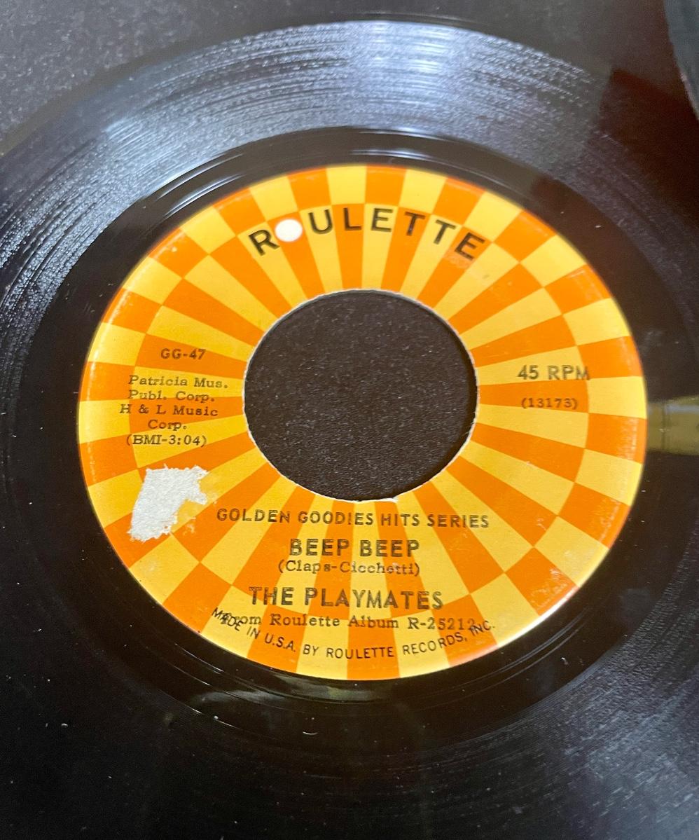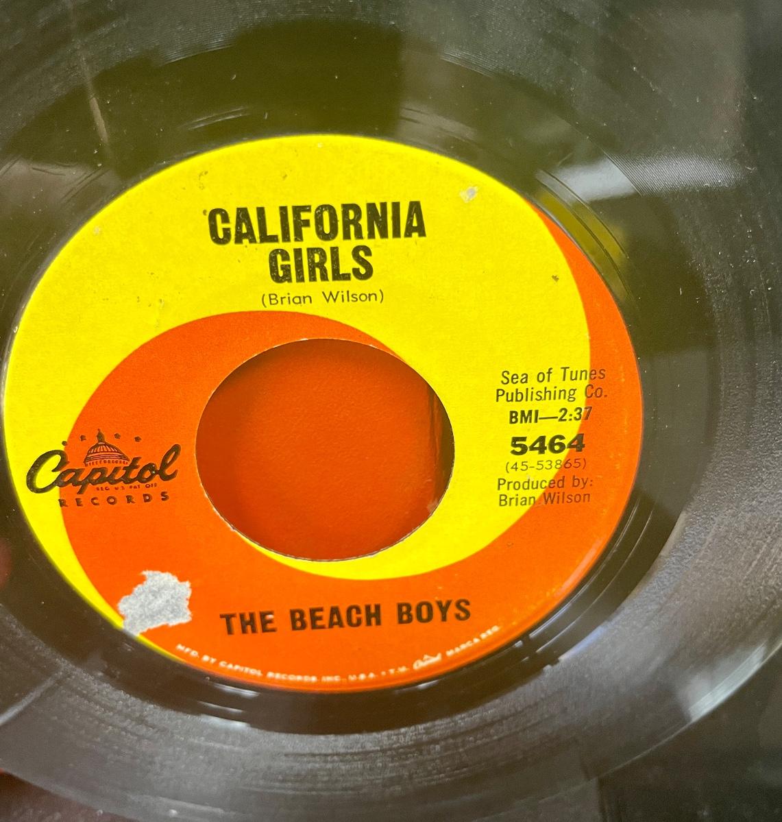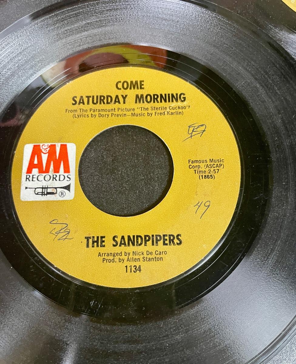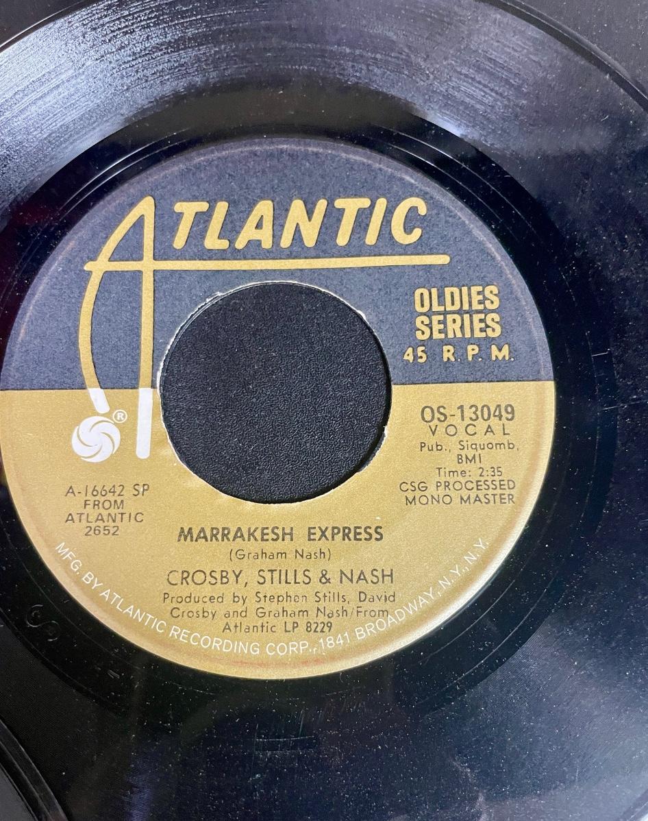 Case is in good condition, records are in good to fair condition. Examples of record titles: "Beep Beep" by the Playmates on Roulette Records, "Carrie-Anne" by the Hollies on Epic Records, "Bridge Over Troubled Waters" by Simon and Garfunkel, "California Girls" by The Beach Boys on Capitol Records, "Come Saturday Morning" by the Sandpipers on A&M Records, and "Marrakesh Express" by Crosby, Stills and Nash on Atlantic Records.