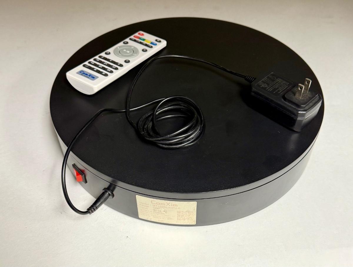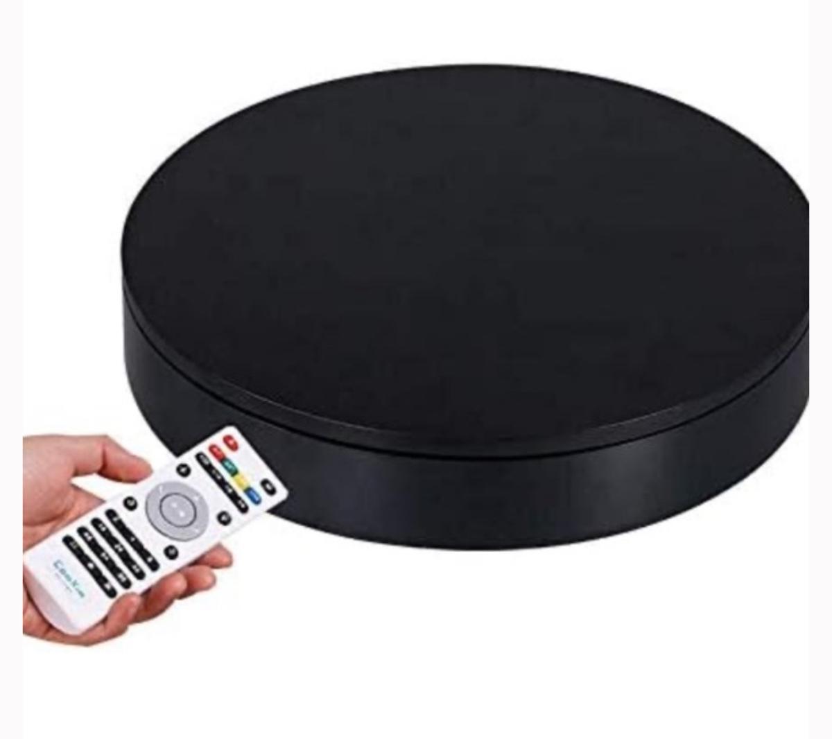 Tested, turntable works on manual mode and with remote. Approx. 12.6" (32cm) across, 2.4" 6cm) high. Can be used as a photography stand or as a display stand.