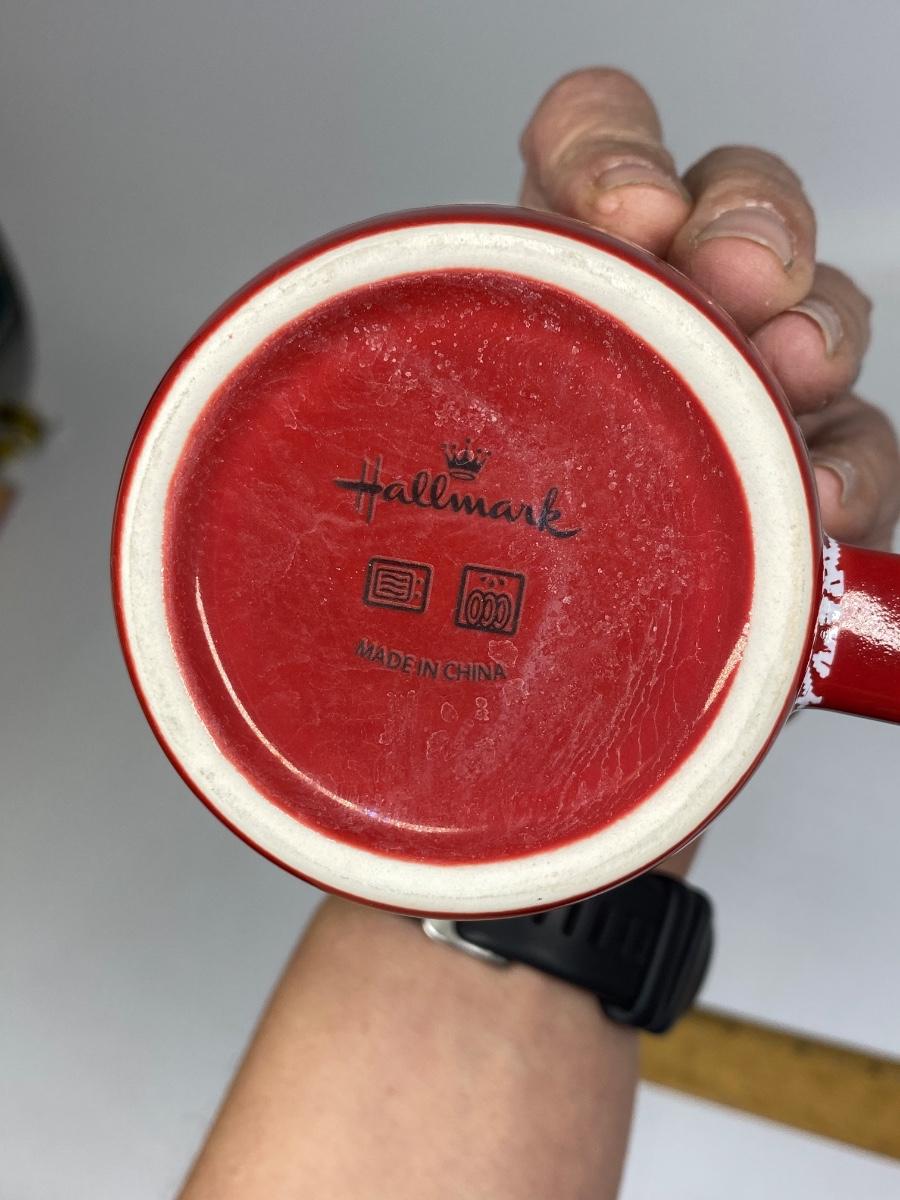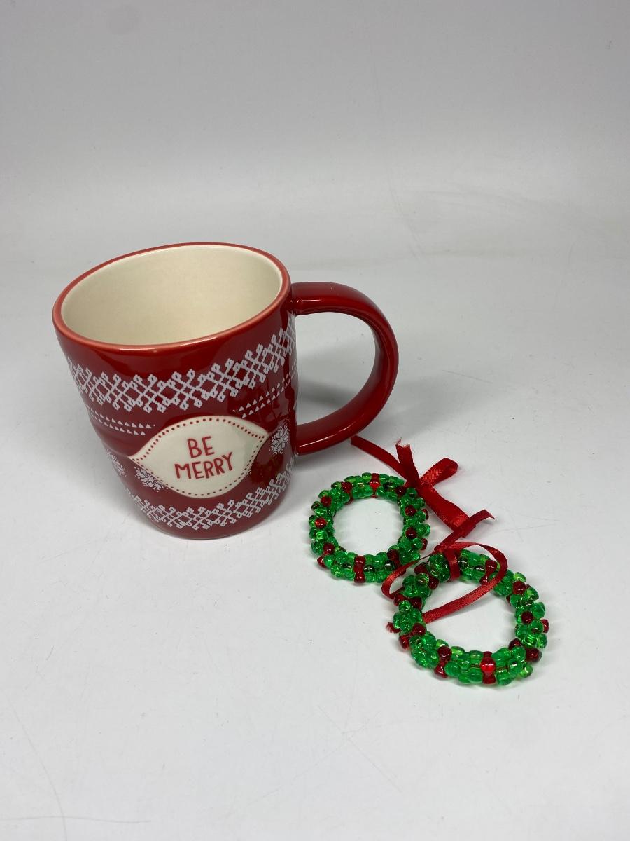 Hallmark Red & White Be Merry Holiday Christmas Coffee Cocoa Tea Mug Cup with Beaded Wreath Ornaments. Good previously owned condition.