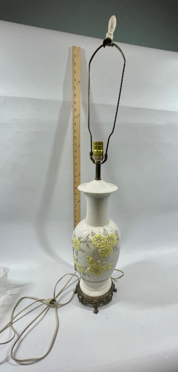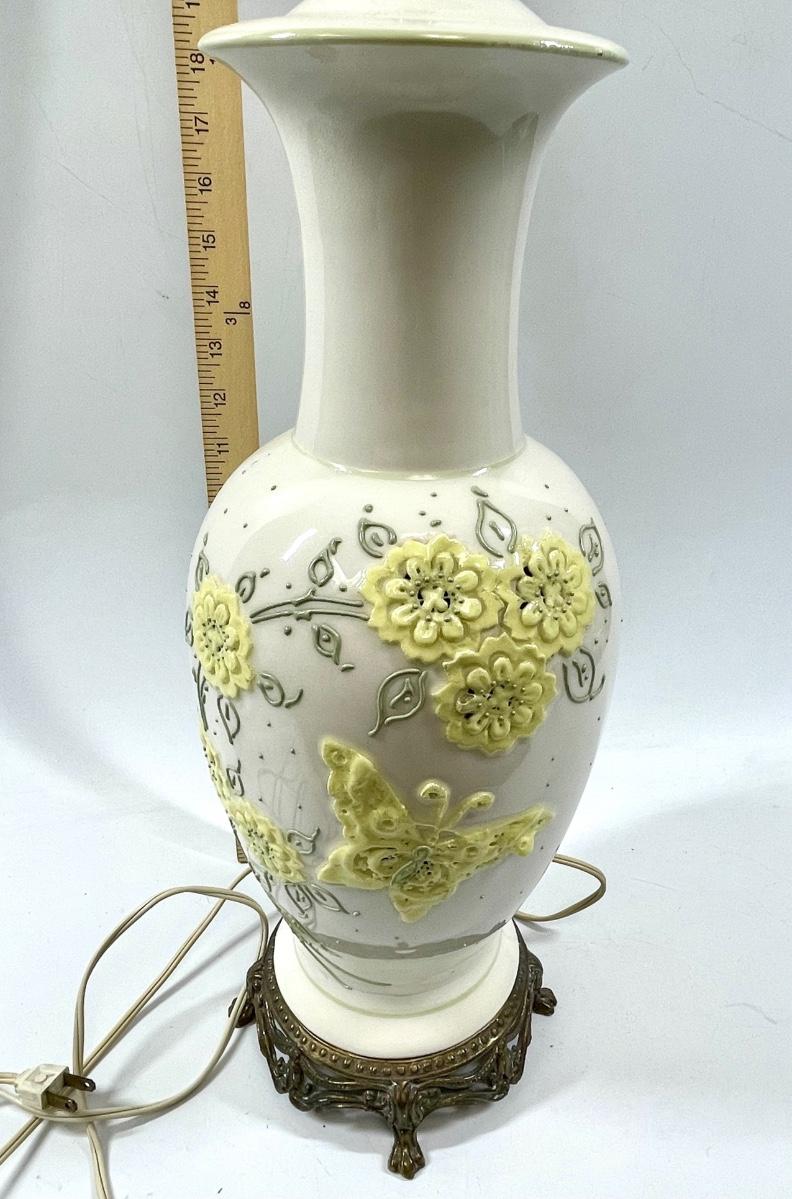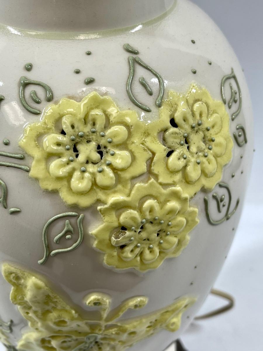 Vintage White Ceramic Table Lamp with Embossed Raised Yellow Flower and Butterfly Pattern