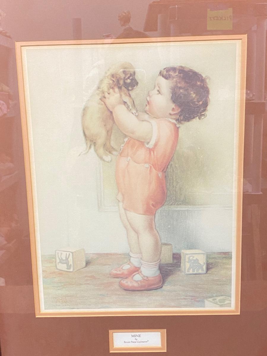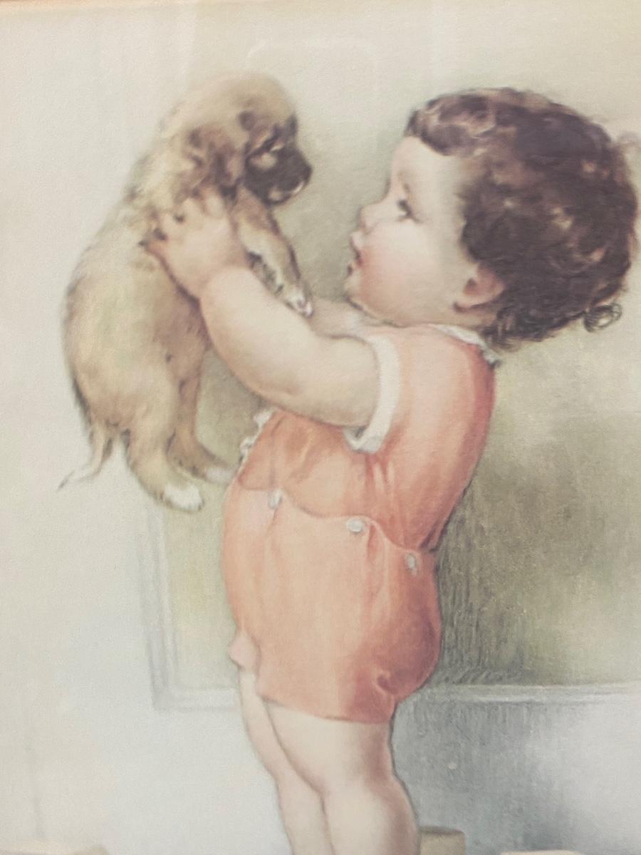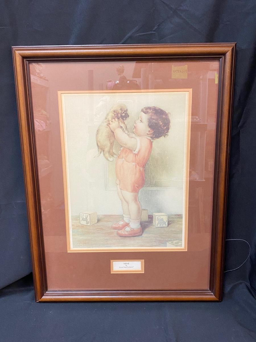 Large Framed Bessie Pease Gutmann Art Print Mine Cute Child with Puppy. Nicely framed. About 26x20 size.