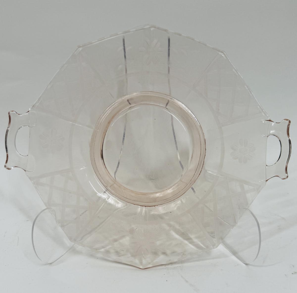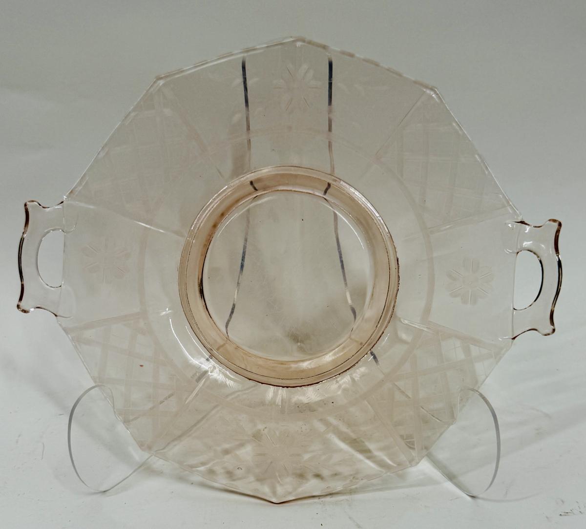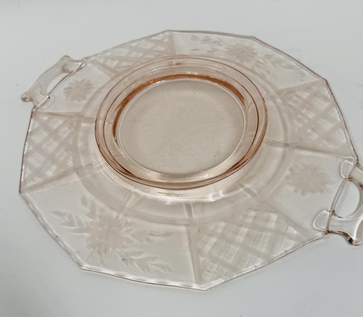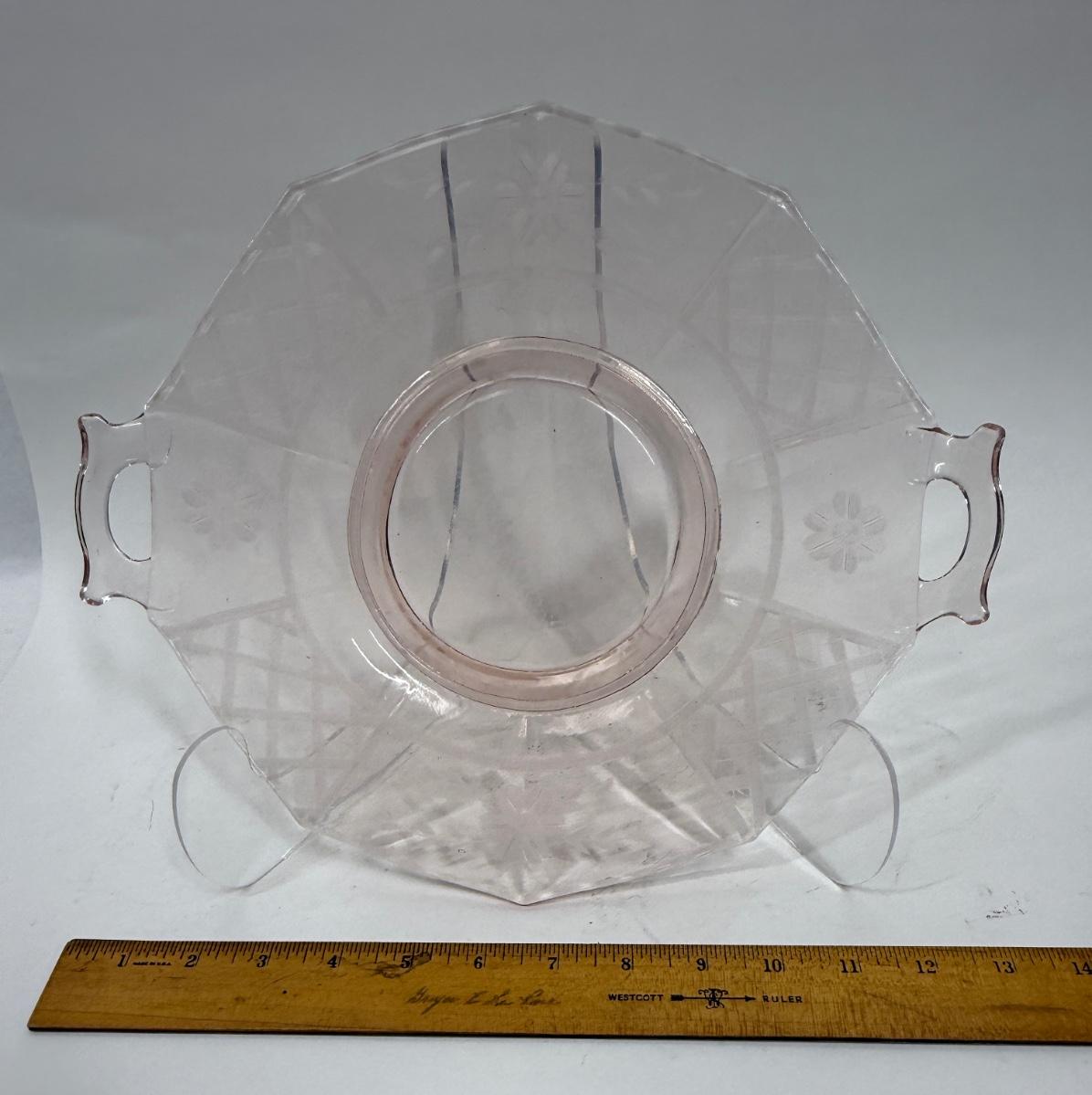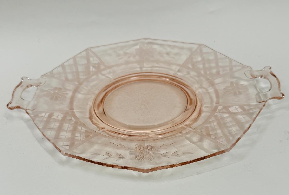 PINK DEPRESSION ERA GLASS CAKE PLATE WITH TWO HANDLES