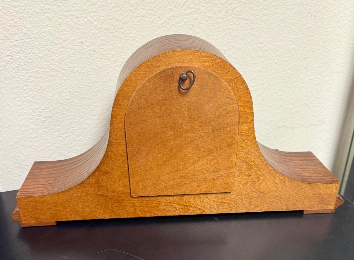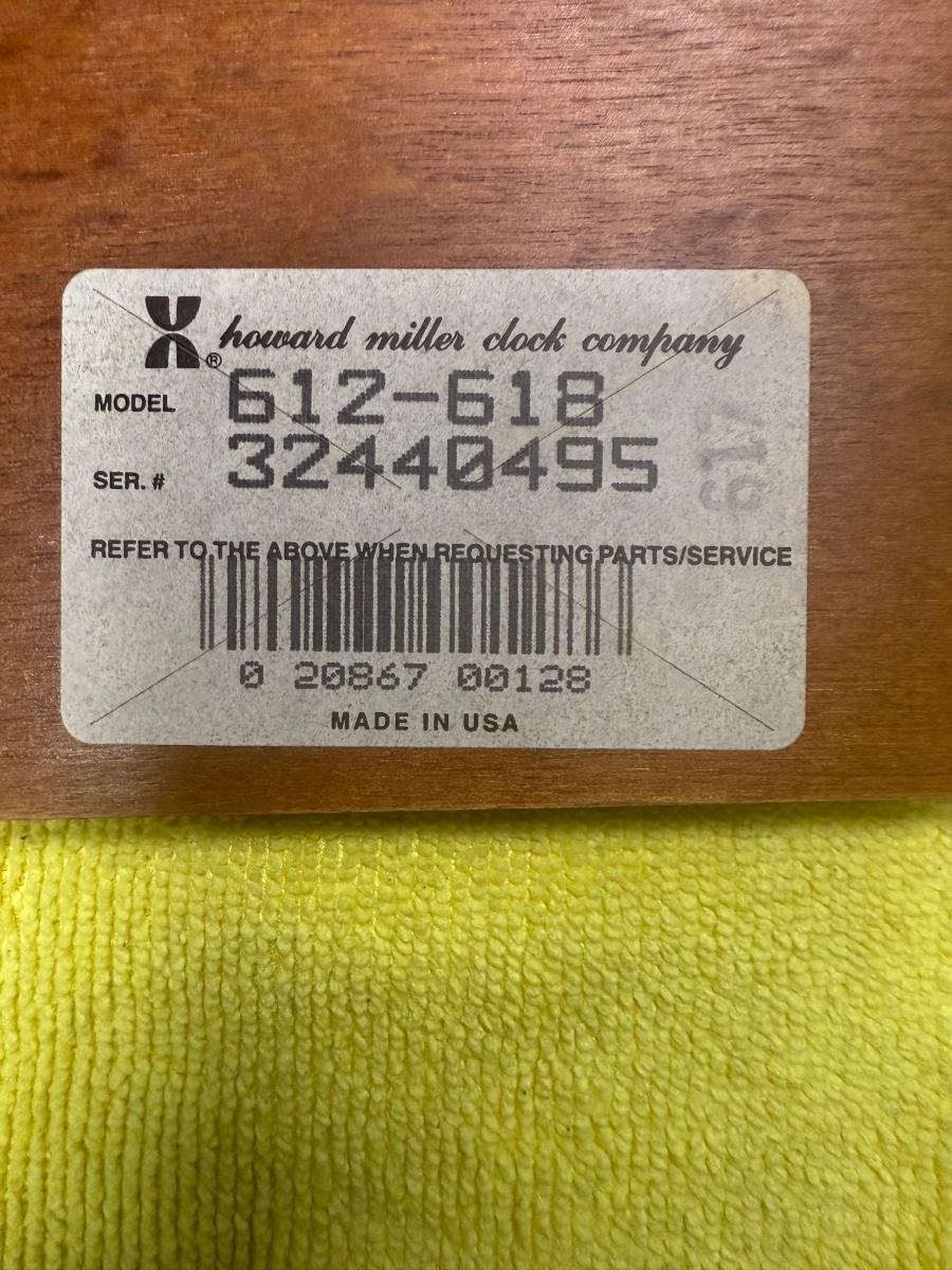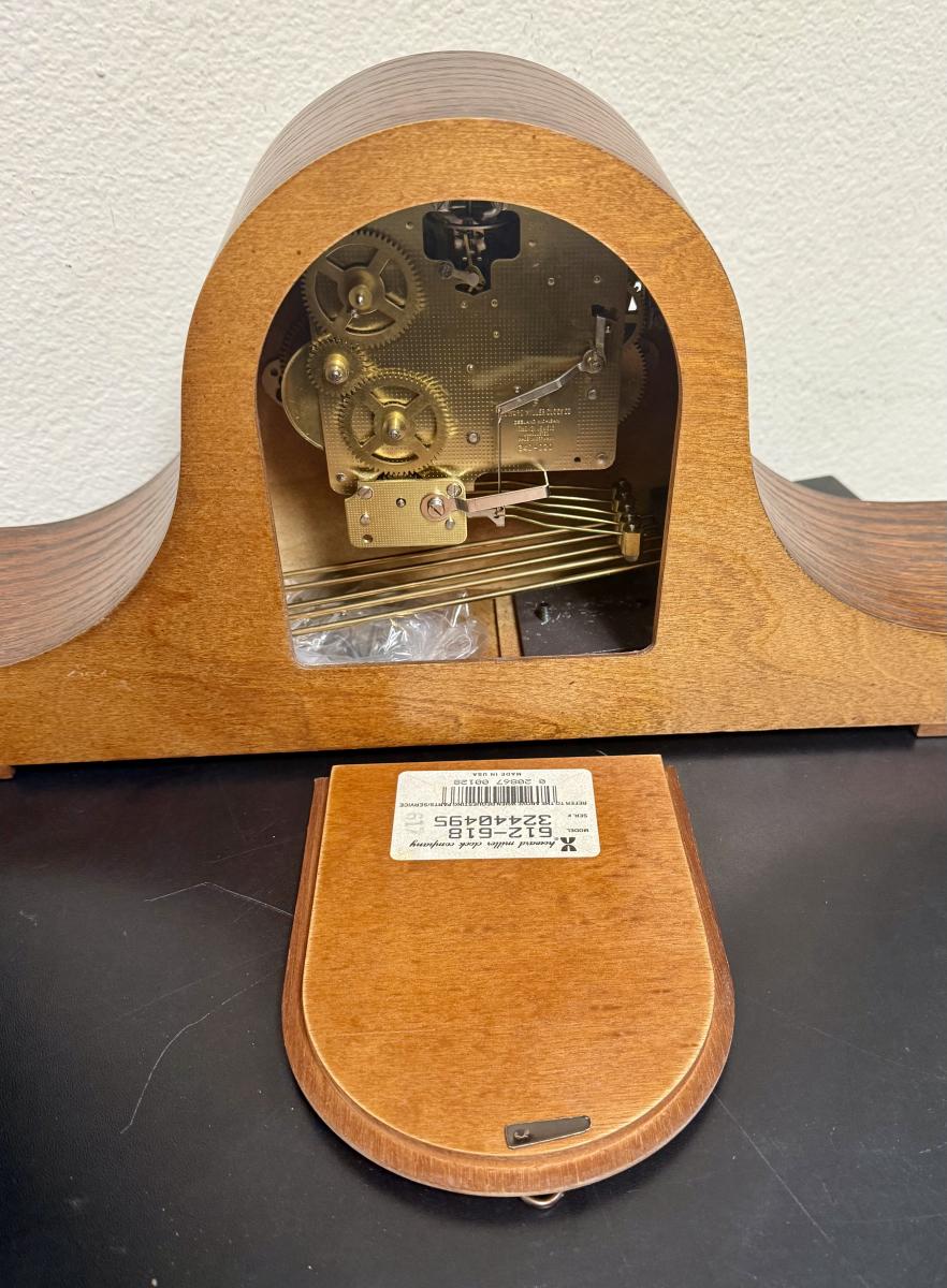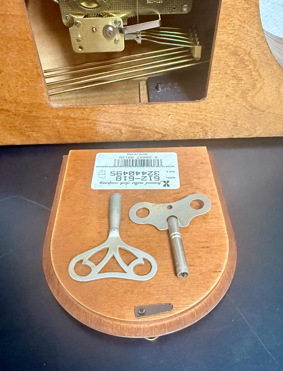 Wood case, includes 2 keys. Model 612-618. Clock runs as expected, but chimes don't play. Mechanism may need some adjustment, seems like the chime feature is fully wound but the on-off switch does not seem to work as expected.