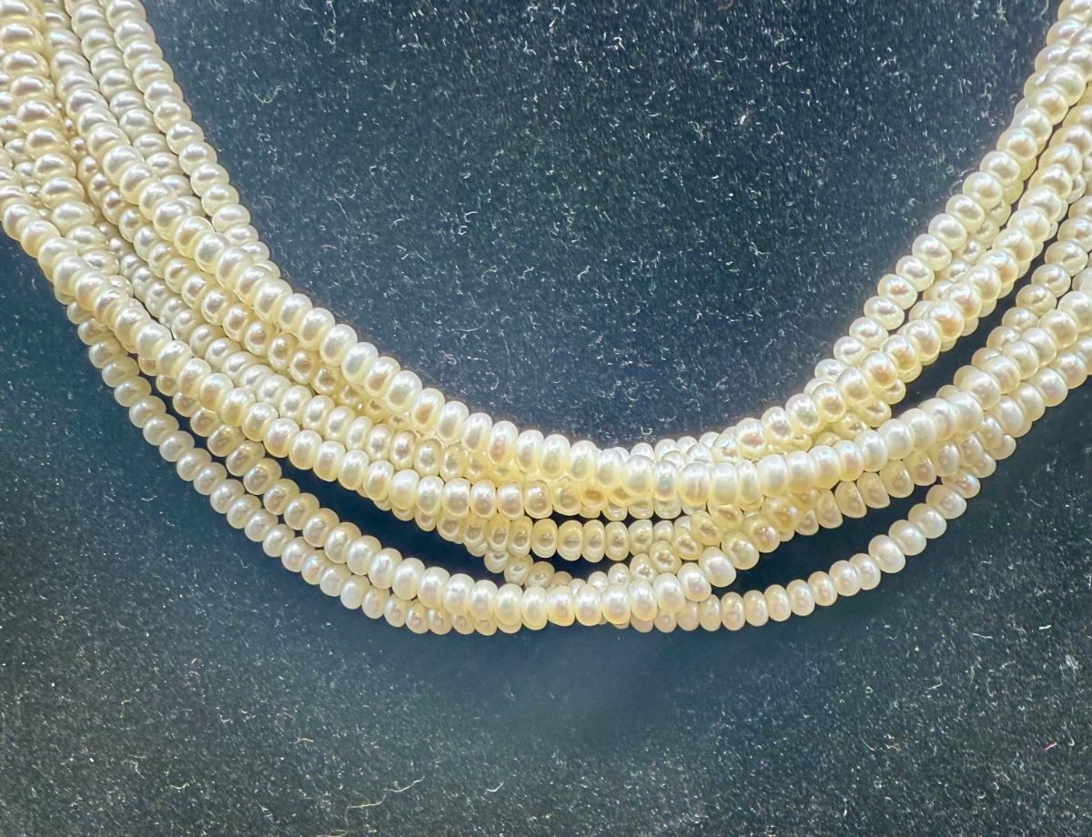 8-strand freshwater seed pearl necklace with a 14K gold clasp. Clasp is marked "ADPG" and "14K". Overall necklace weight is 55g. Excellent condition.