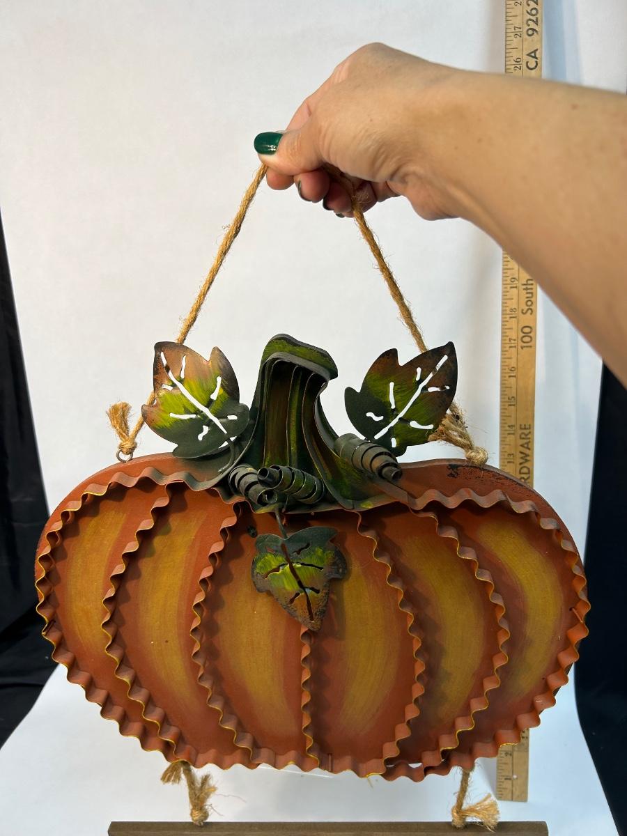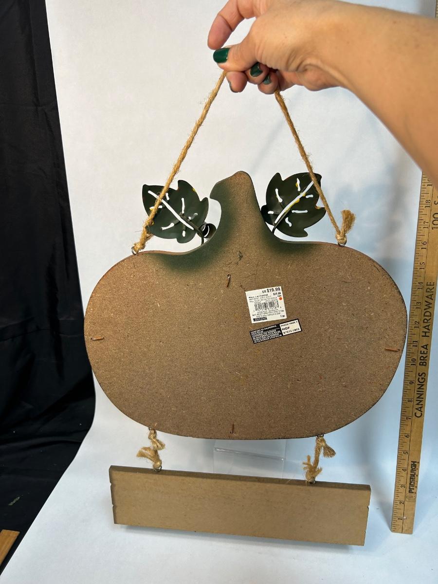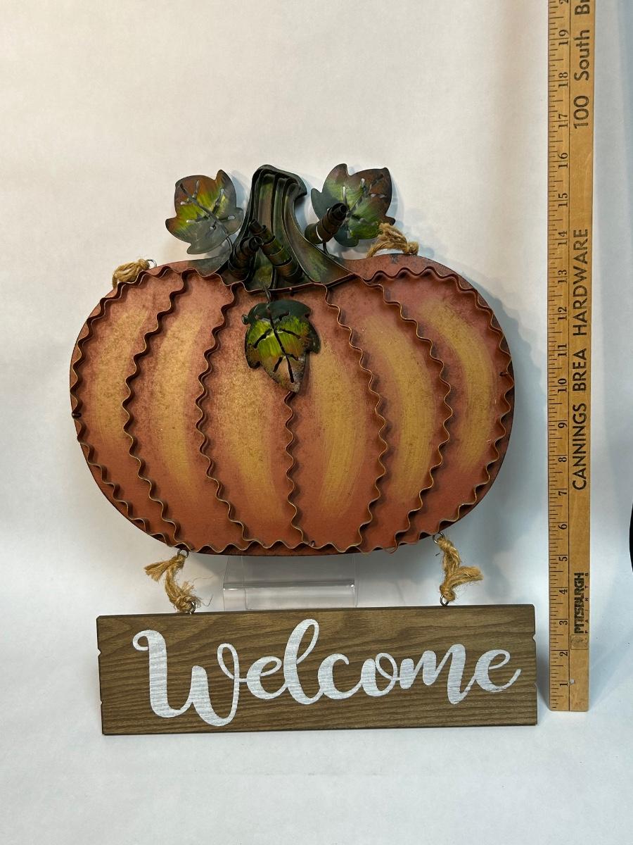 Painted Wood and Metal Wall Hanging Seasonal Art Pumpkin Welcome Sign. In good condition. About 16" length.