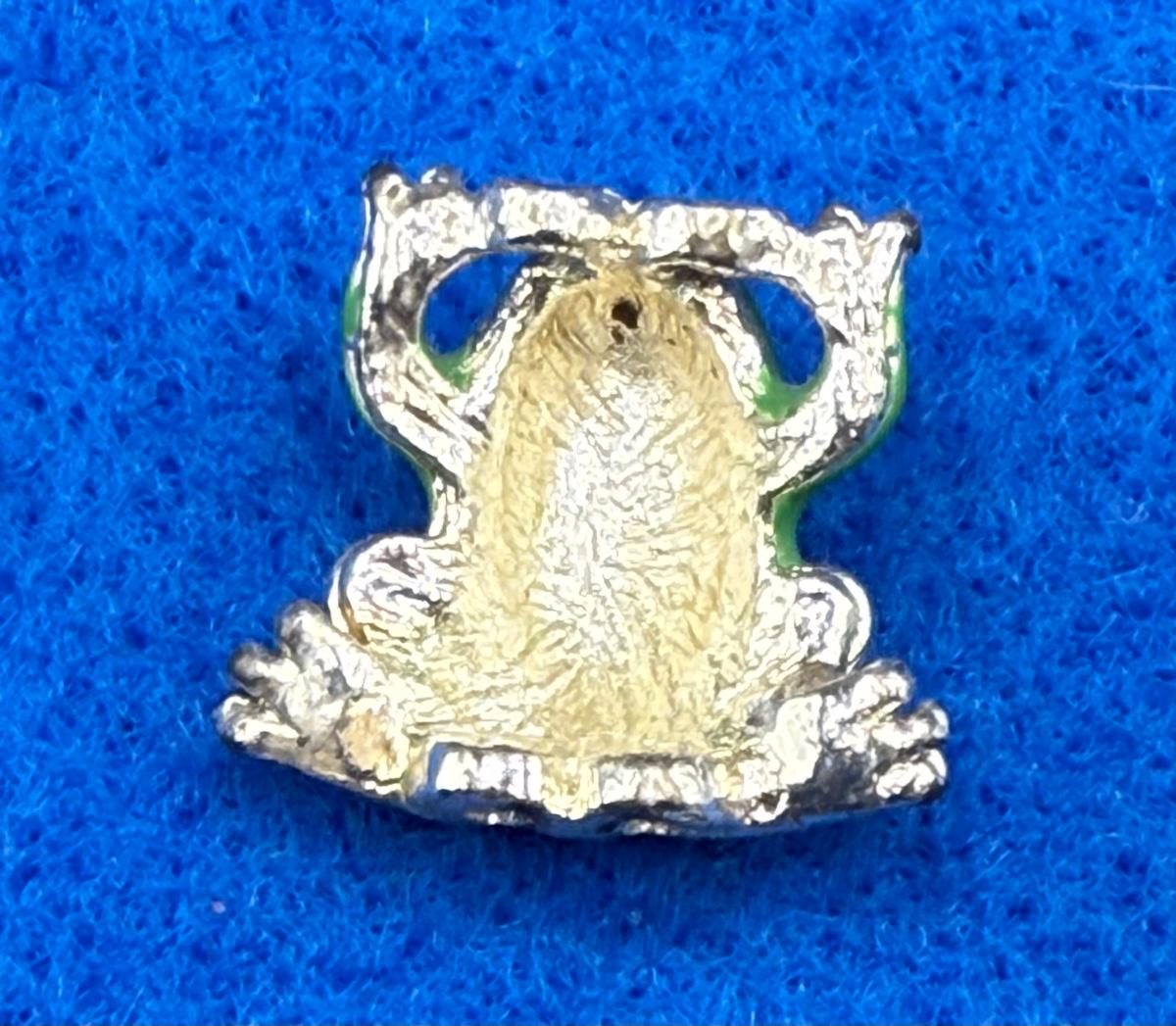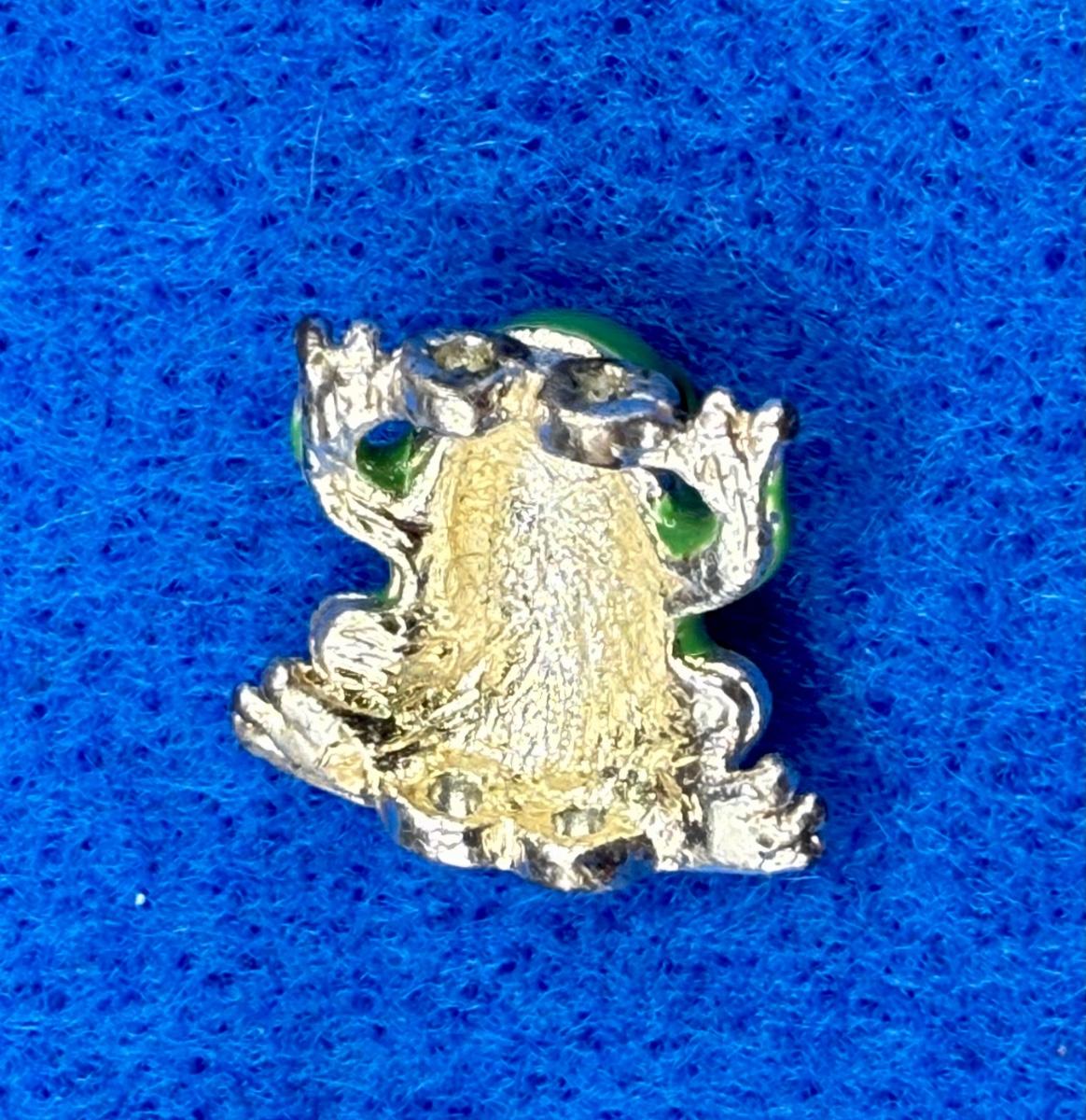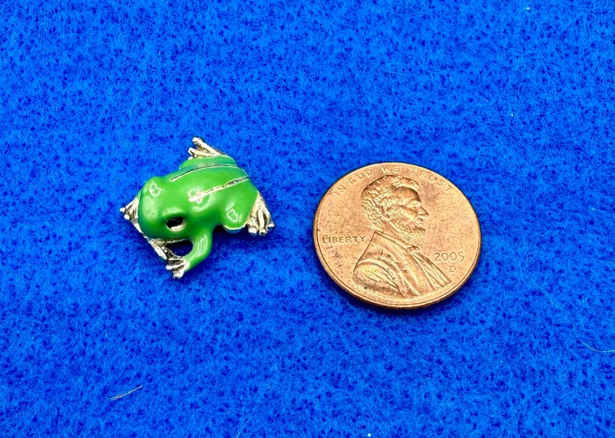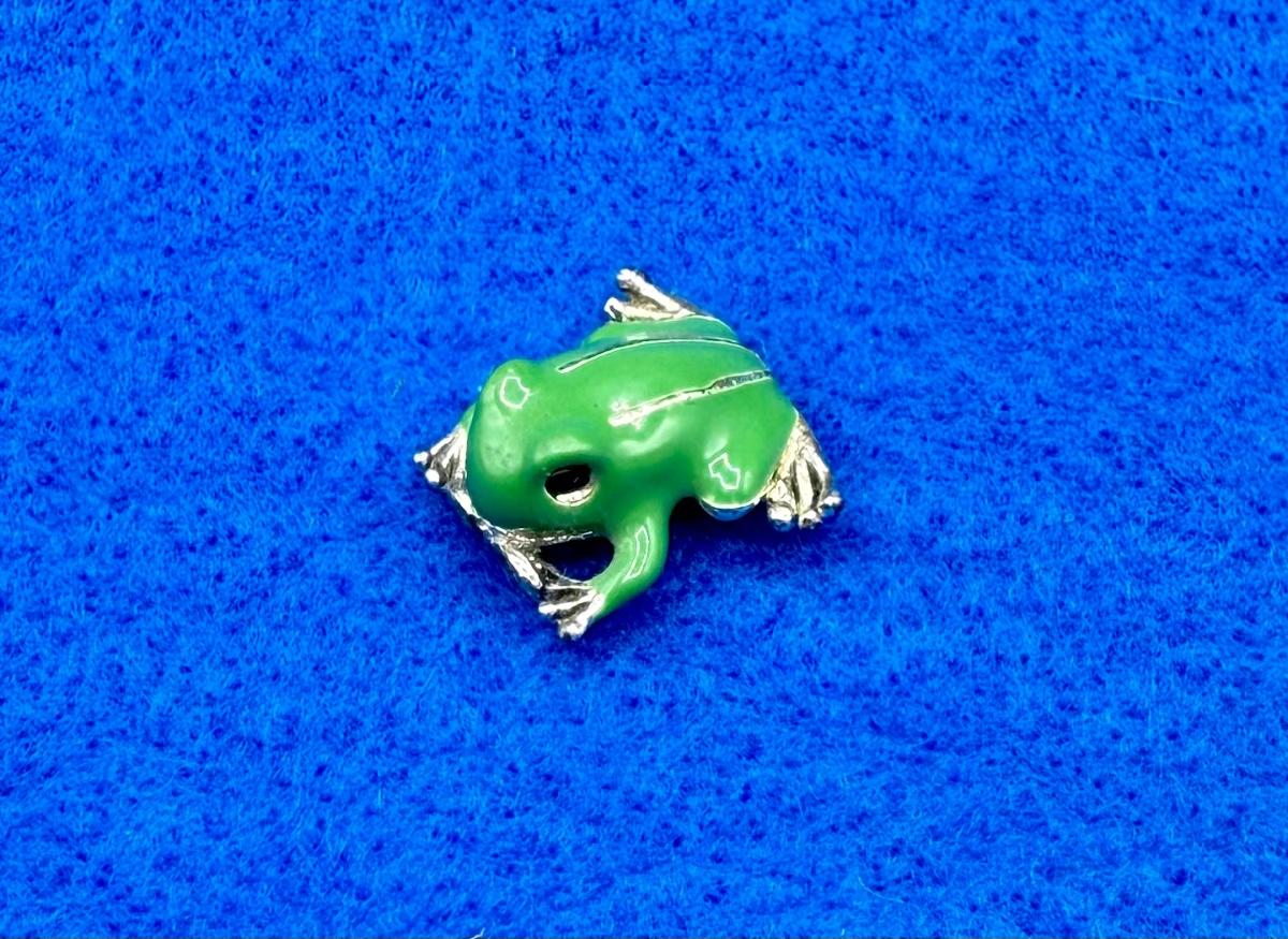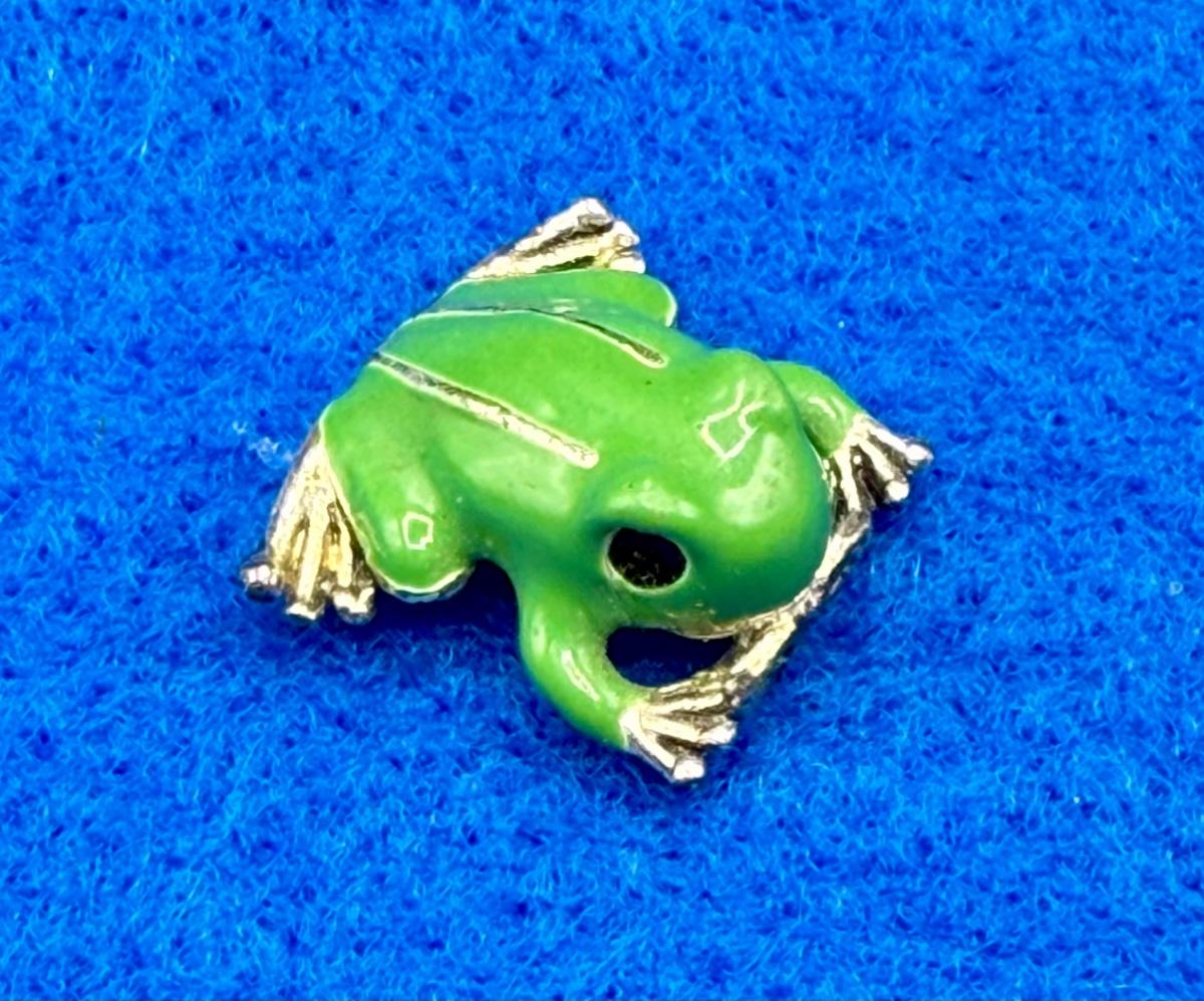 Small, brilliant green metal frog, looks to be a single link for a bracelet or brooch. Can be turned into a fun brooch or other jewelry item.