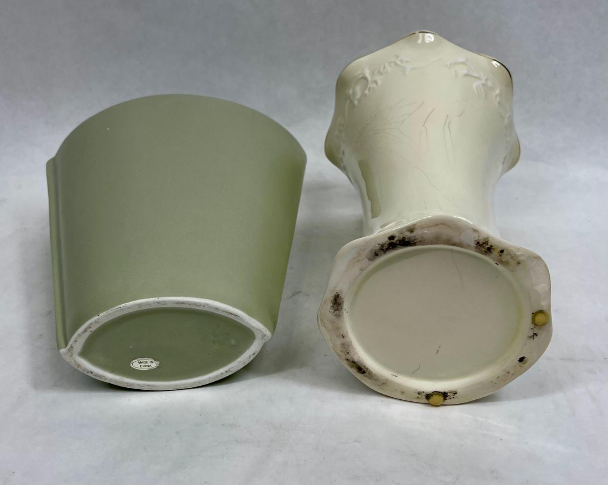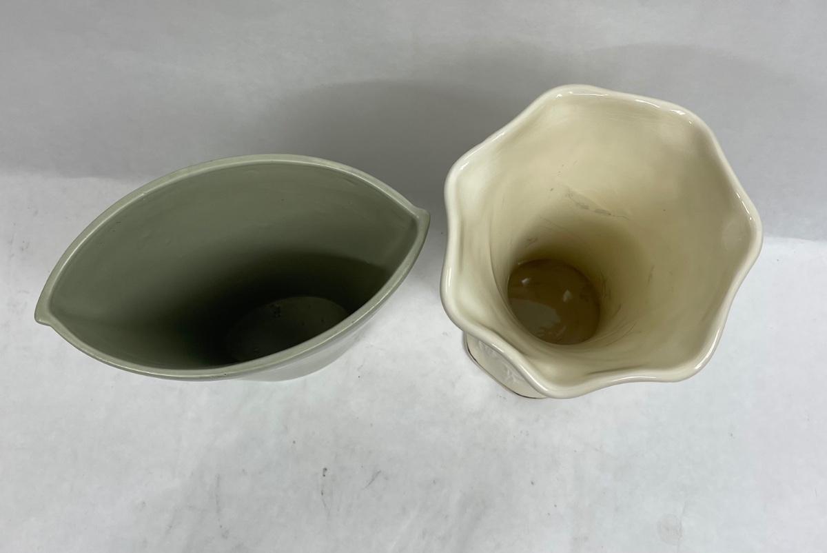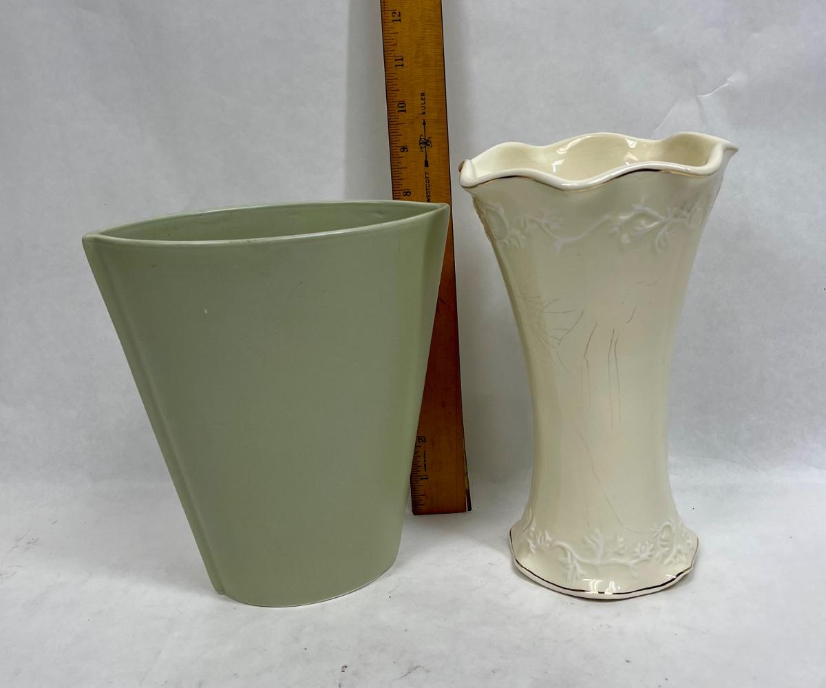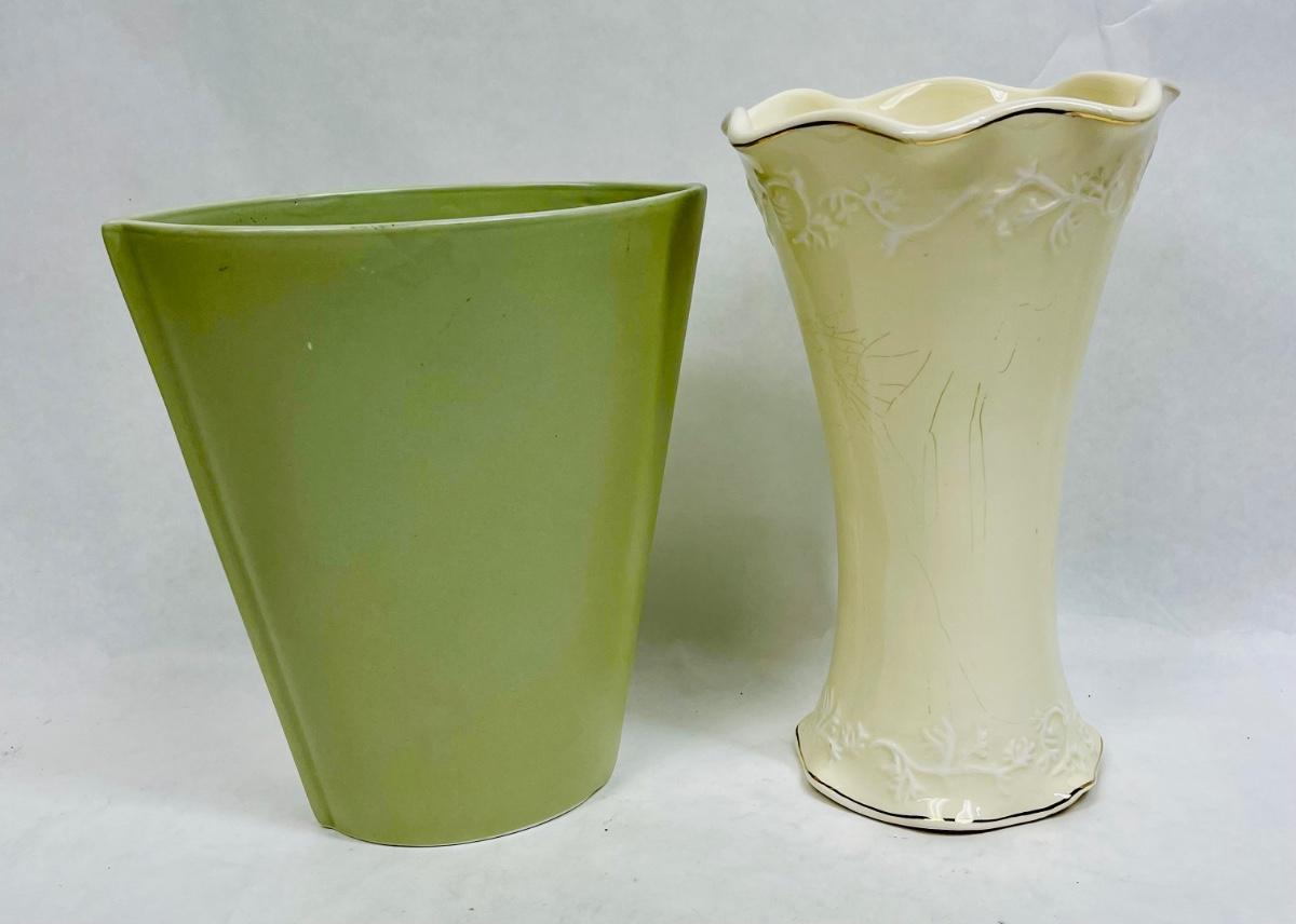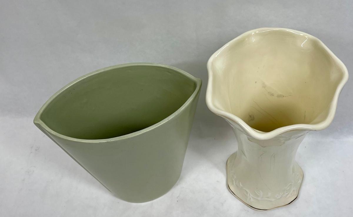 lot of 2 Ceramic Vases - spruce green and ivory with gold trim