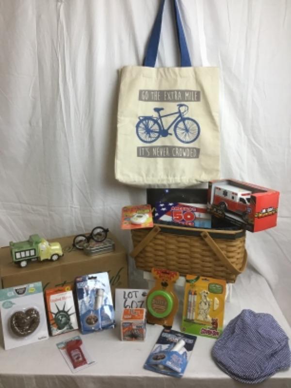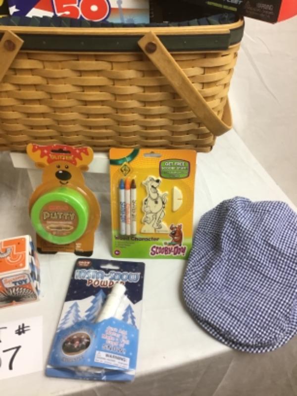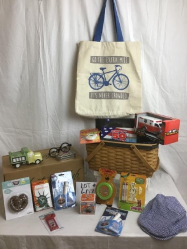 This 2 Handled Fabric & Plastic Liners Longaberger Boys Explorers Gift Basket has items such as -