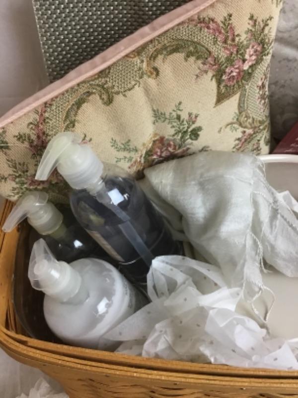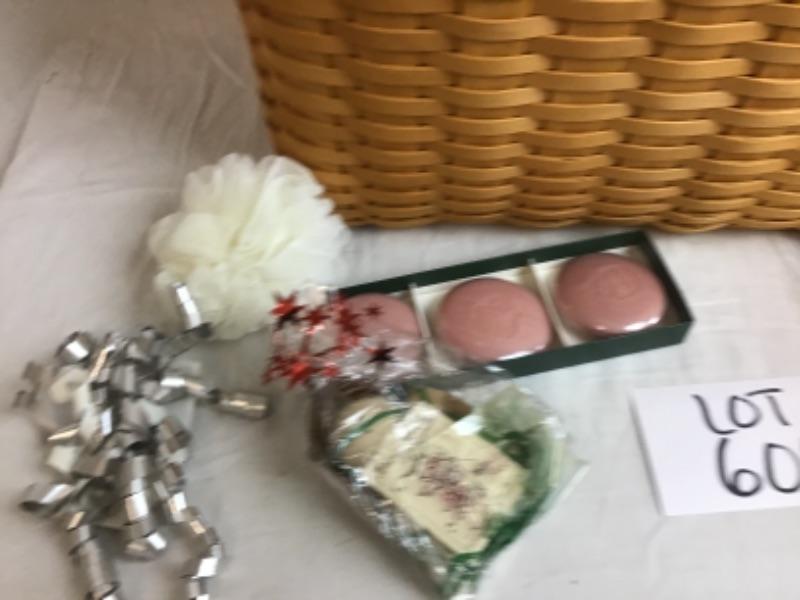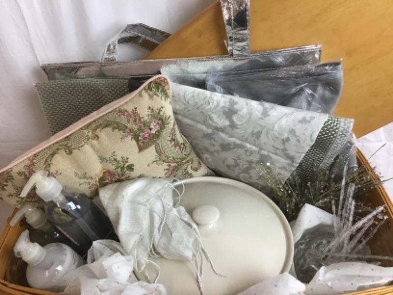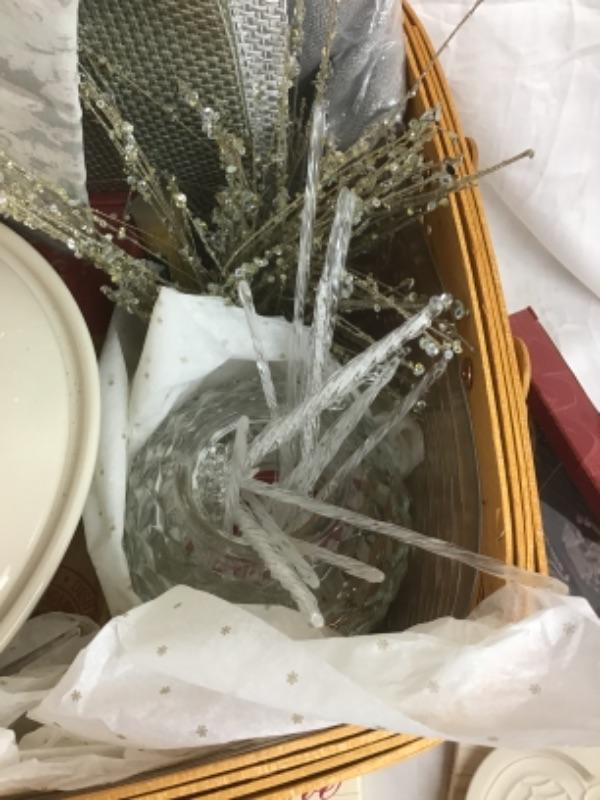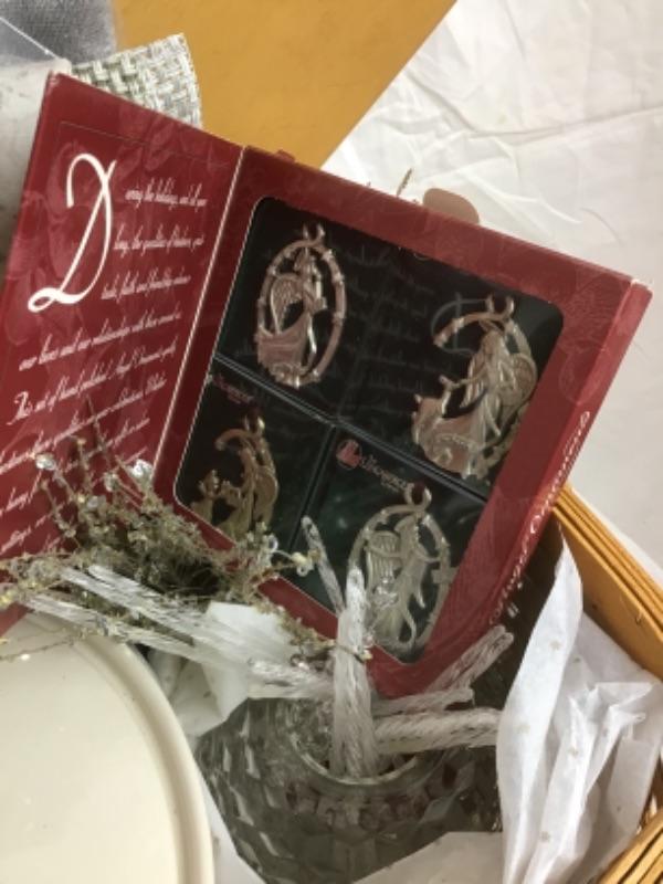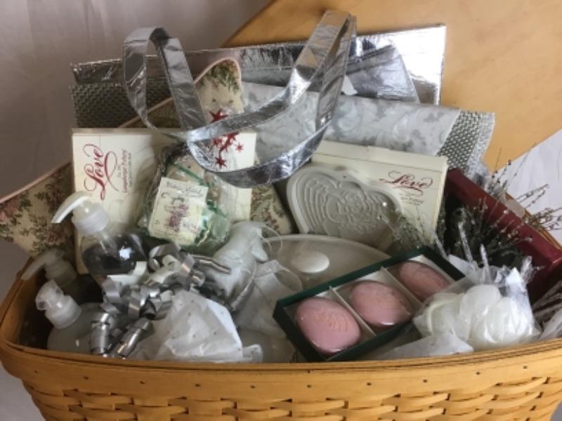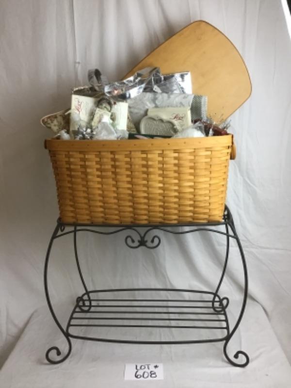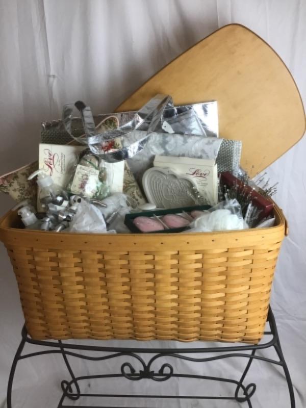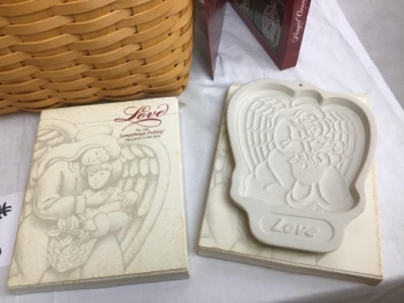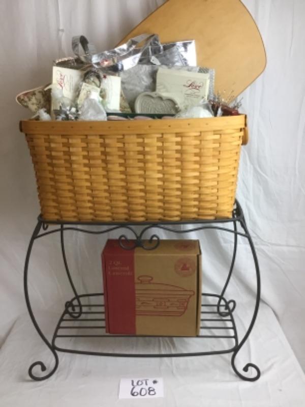 This beautiful Angel Themed Longaberger Gift Basket with Plastic Liner & Lid also comes with Wrought Iron Stand. Some of the items in this basket include Glass Ornaments and Glass Bowl, Soap Set, Pillow, Placemats, 2 Qt Longaberger Casserole Dish, Tote, Longaberger Angel Molds, White Silk Scarf and more