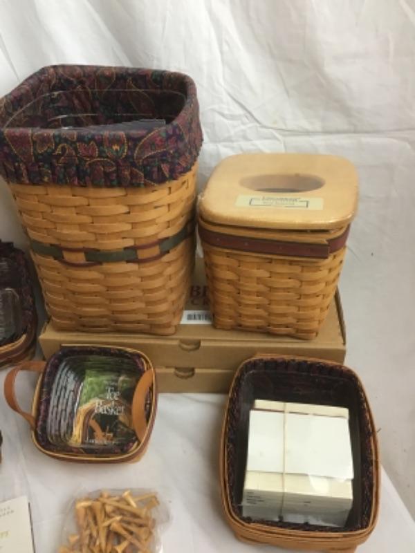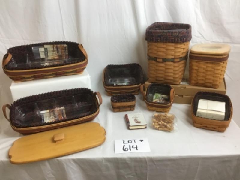 This lot has 8 Baskets, 2 Lids, & Tissue Box Top, all baskets have fabric & plastic liners. ( 2 of the plastic liners are organizers )