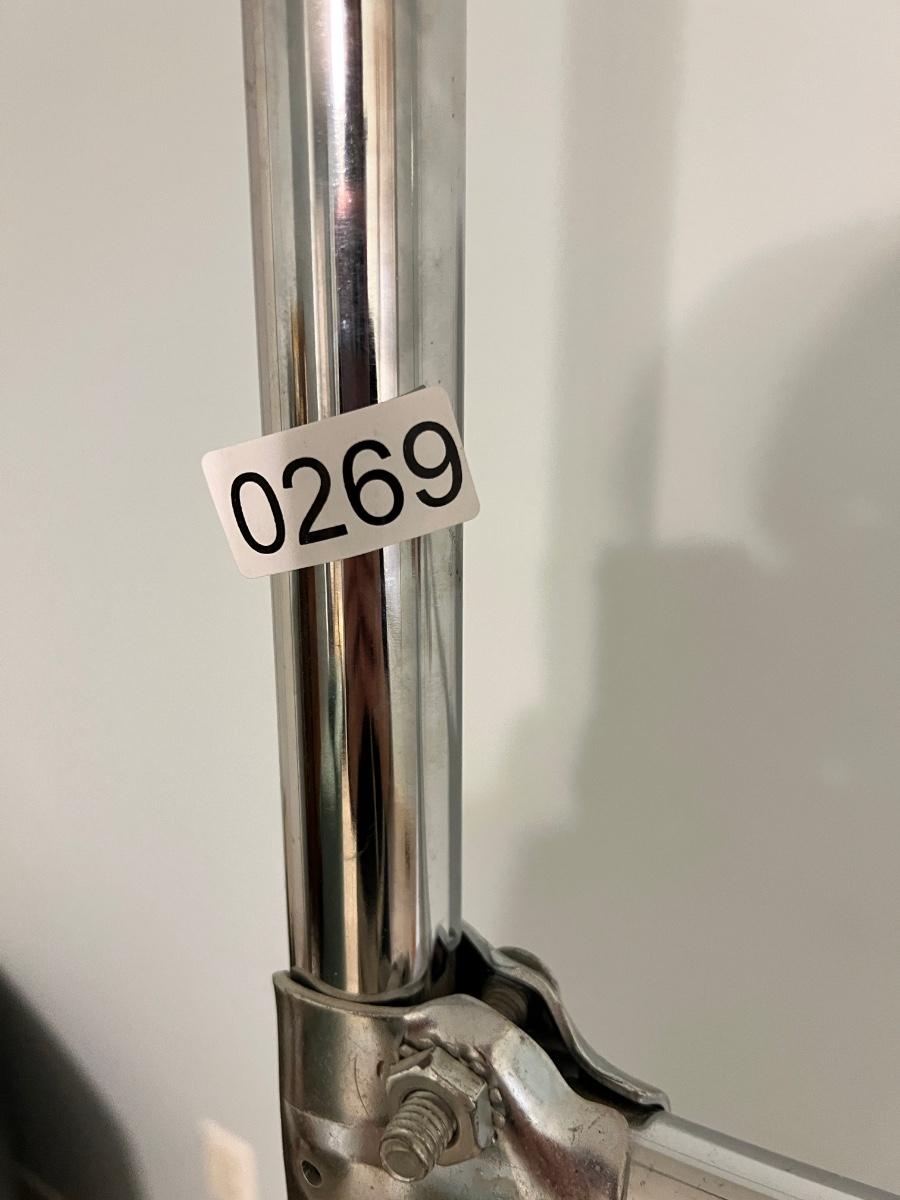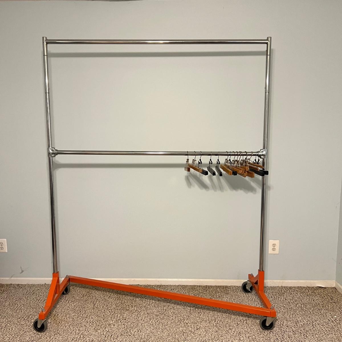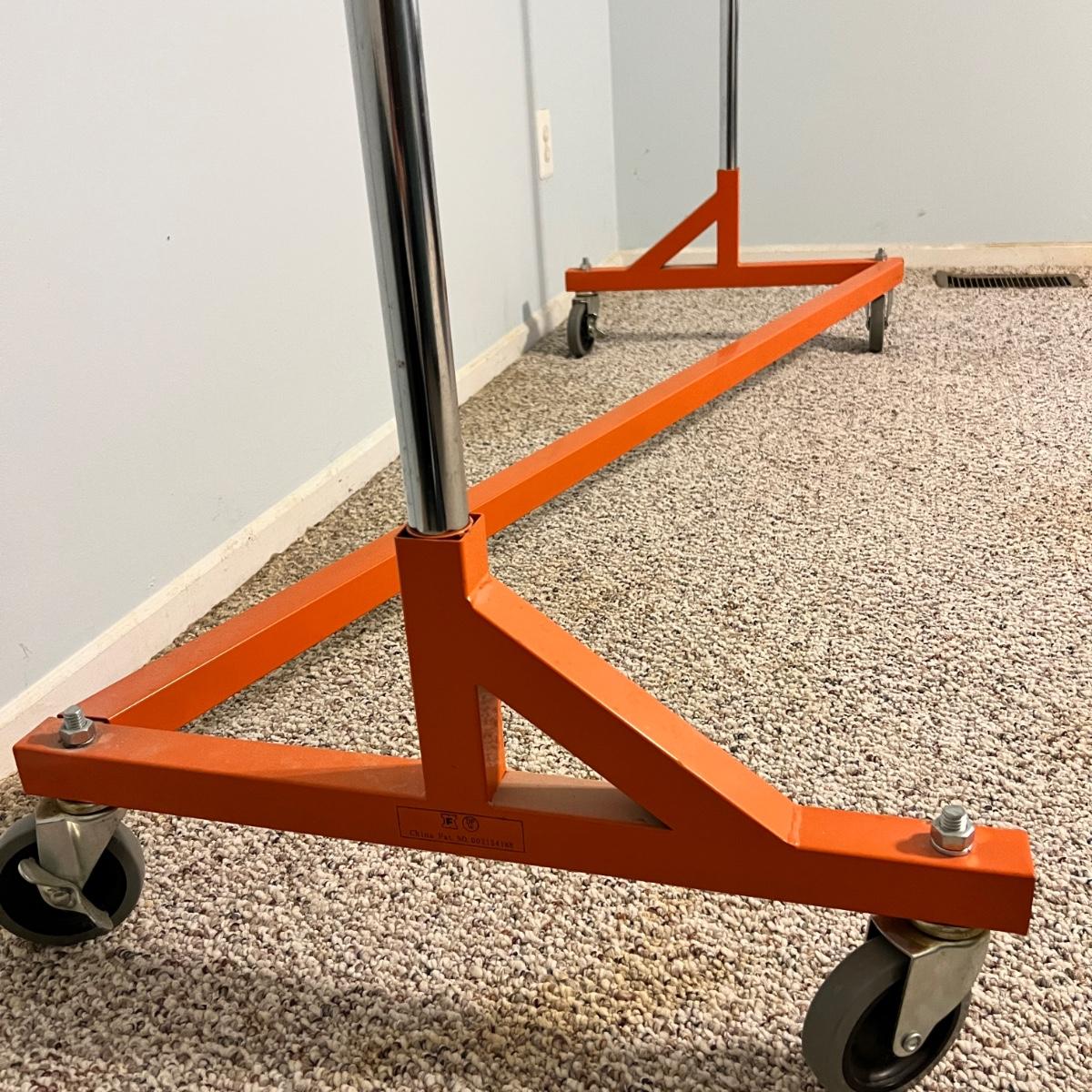 Steel extendable double rail z rack. 2 Hang Rails for 10-ft of Hang Space, Commercial Grade - 400 Lb. Load Capacity, 4" Non-Marring Rubber Casters, 2 Wheel Brakes and Rubber Donut Bumpers, 8" Height Extensions for Extra Vertical Hang Space NOTE: PICK UP ONLY IN DUNKIRK MD.
