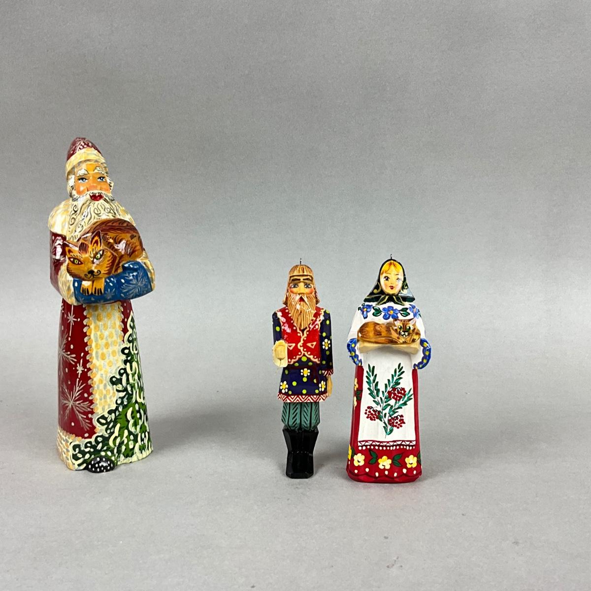 Z413 Handpainted Russian Carved Wooden Figure and Two Ornaments