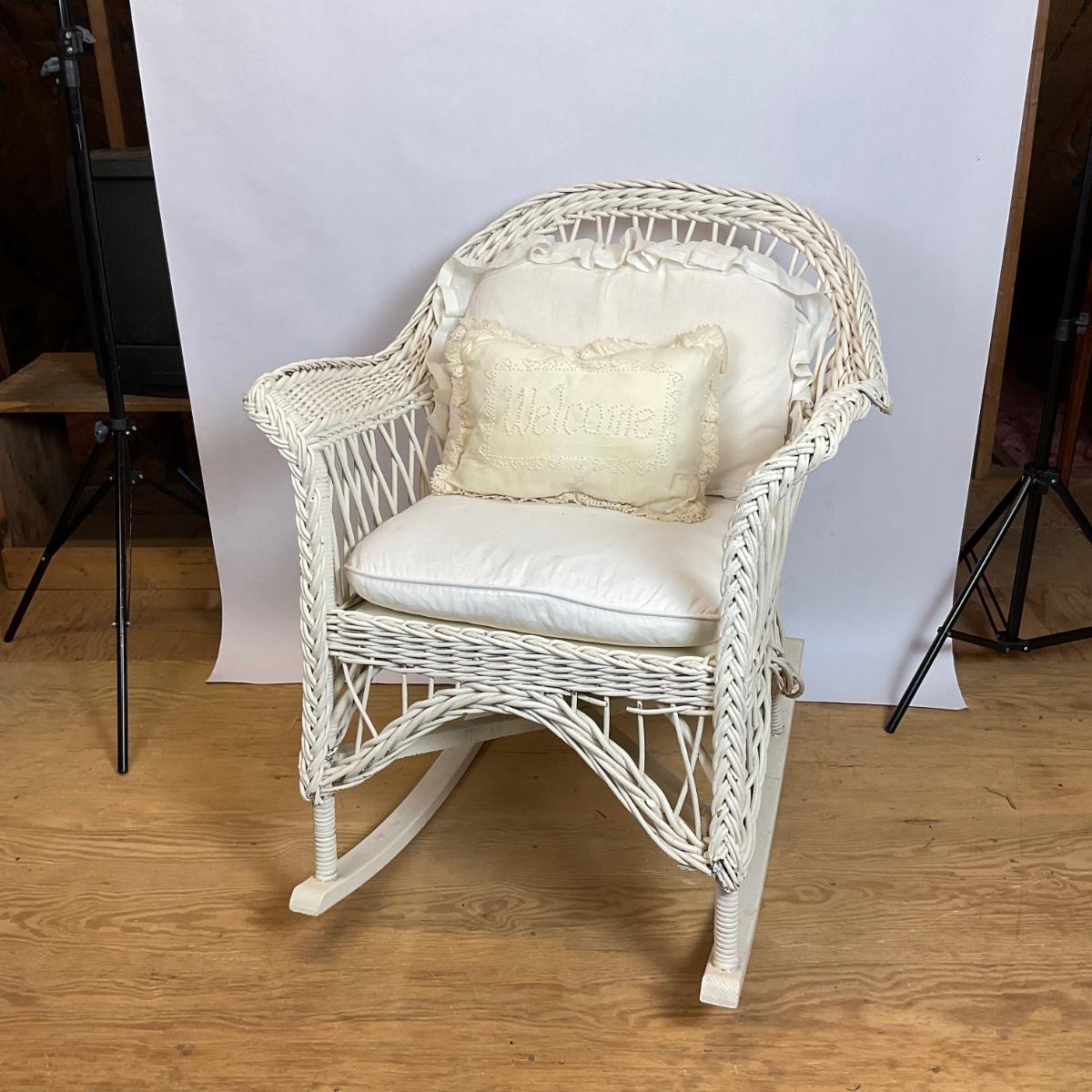 White Wicker Rocking Chair, comes with white cushions & embroidered "Welcome" pillow. Overall good shape.