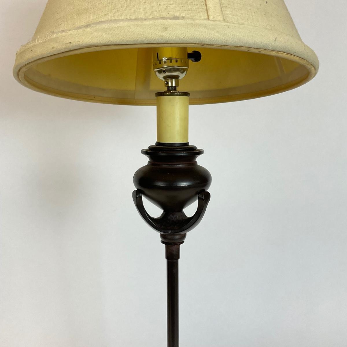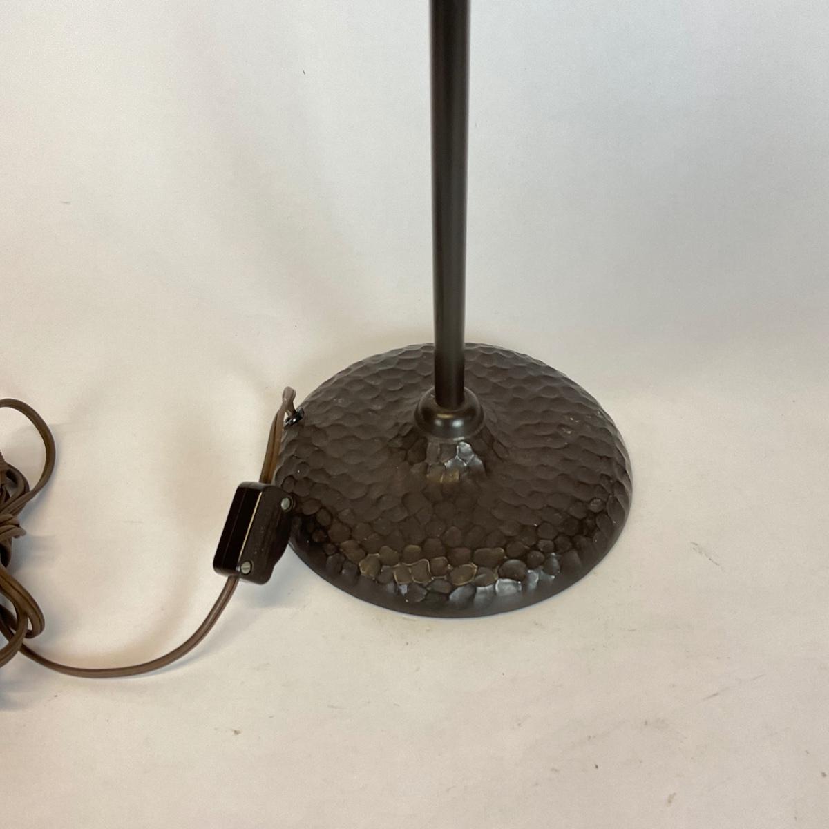 hammered bronze colored base and art nouveau style single bulb lamp with off white lampshade measuring 29” high