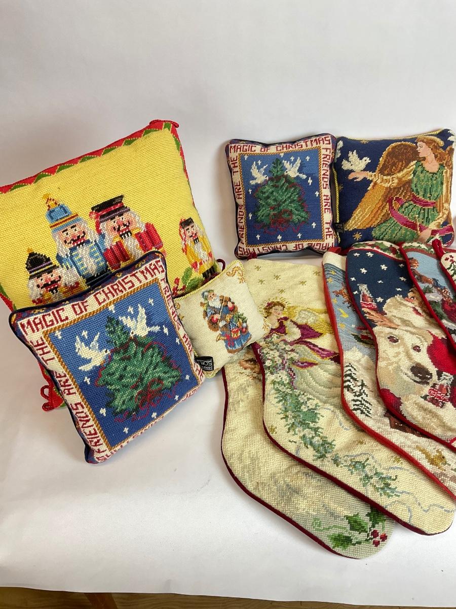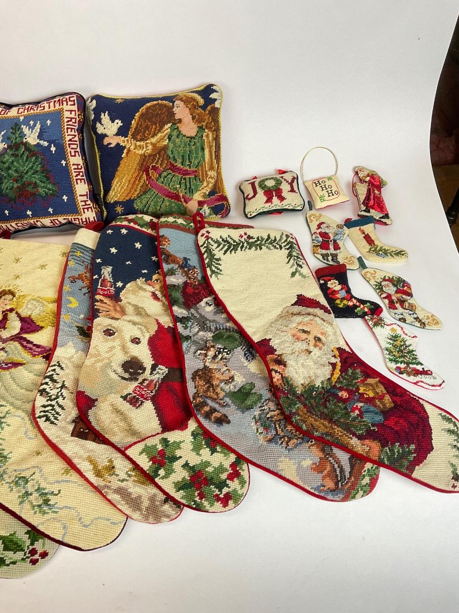 Z525 Large Lot of Needlepoint Christmas Stockings and Pillows