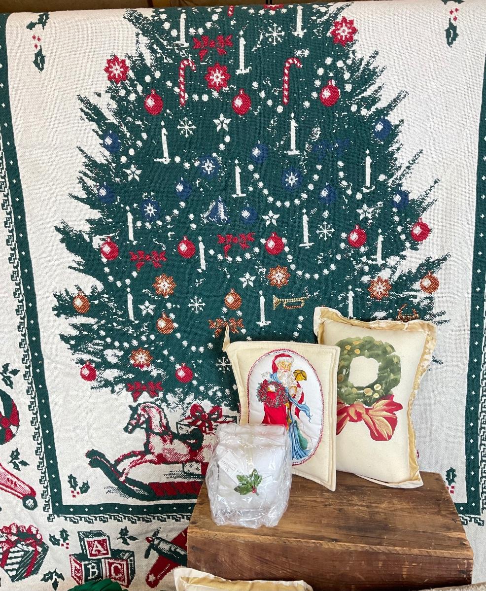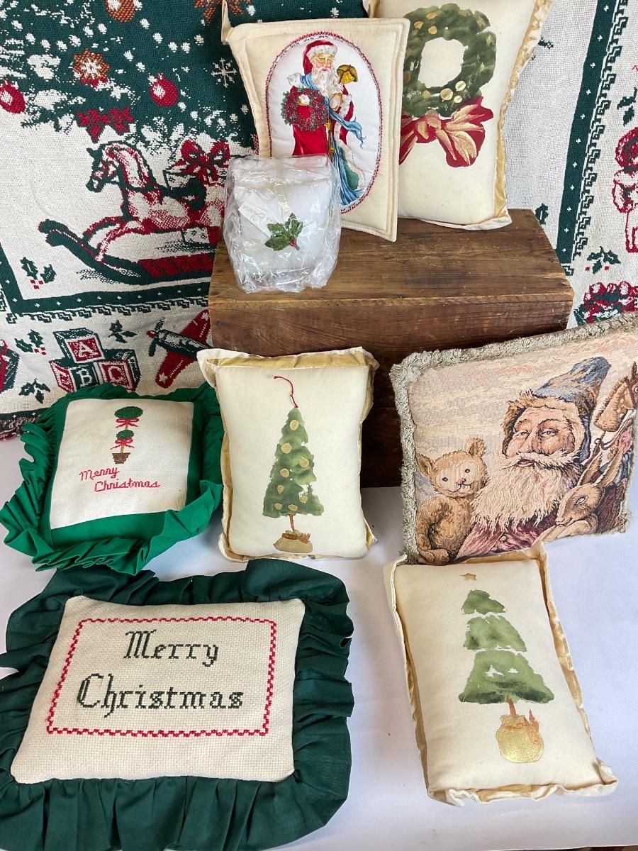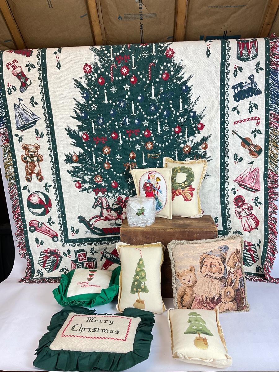Comes with x-mas throw, three cross-stitch pillows, ^ four miscellaneous. x-mas pillows