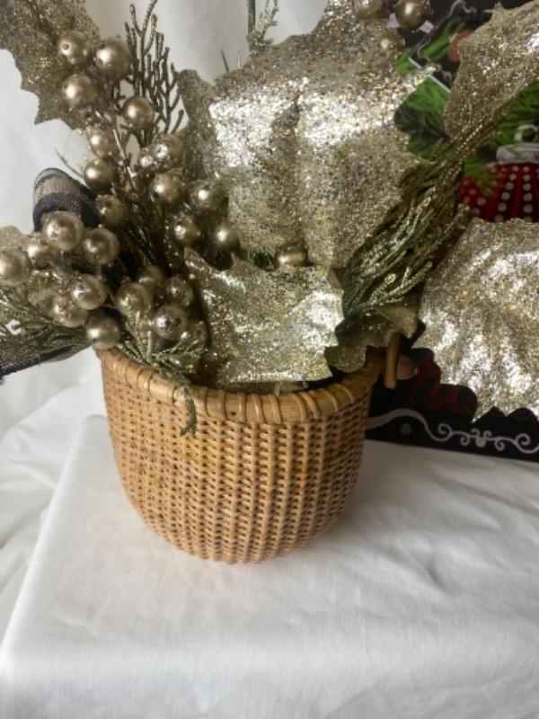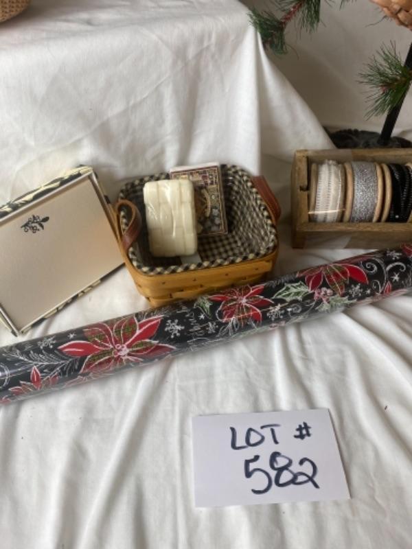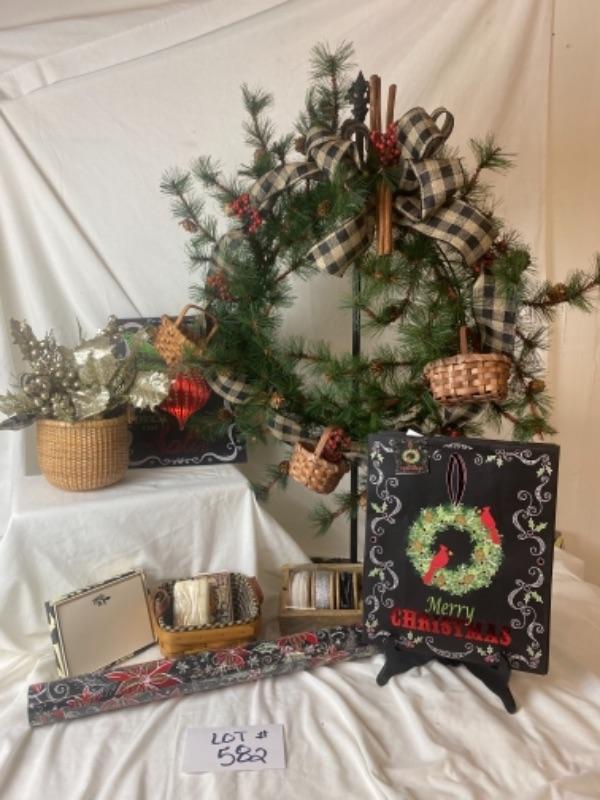 Country holiday basket weath with gold decorative basket small wooden ribbon wheel with wrapping paper small leather handled Longaberger basket with note cards and soap and several gift bags