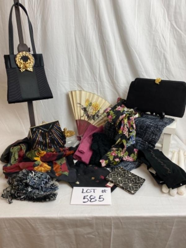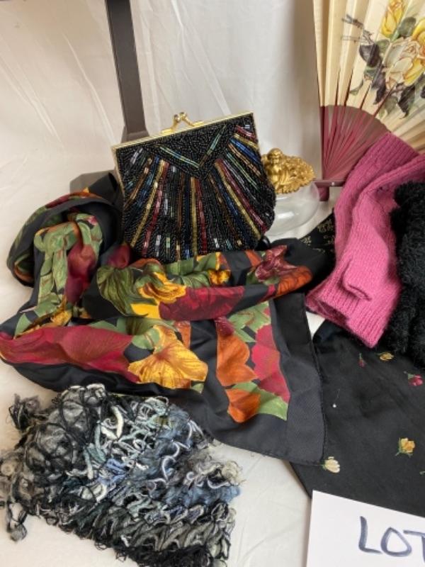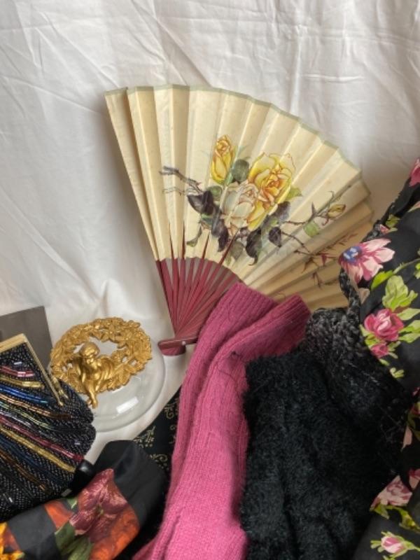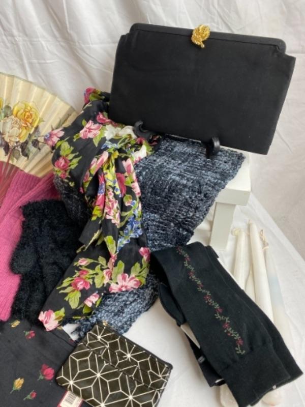 Black evening bag by Bosom Buddy, beaded sequence bag, gloves, silk scarves, socks, candles, angel Potpourri holder, and much more